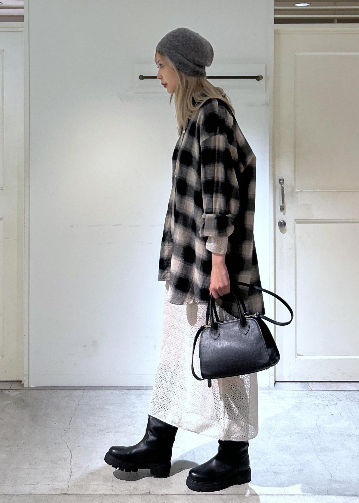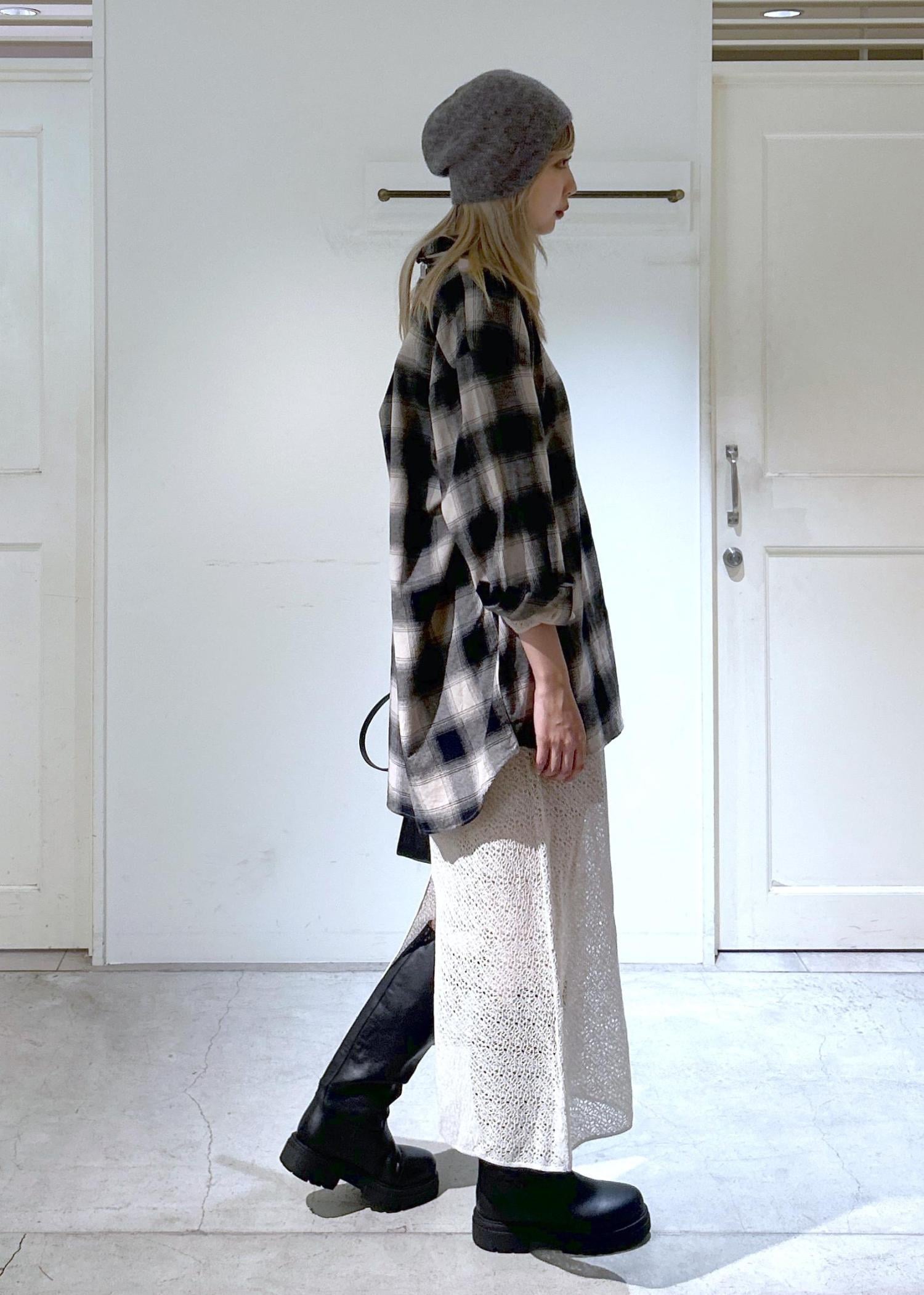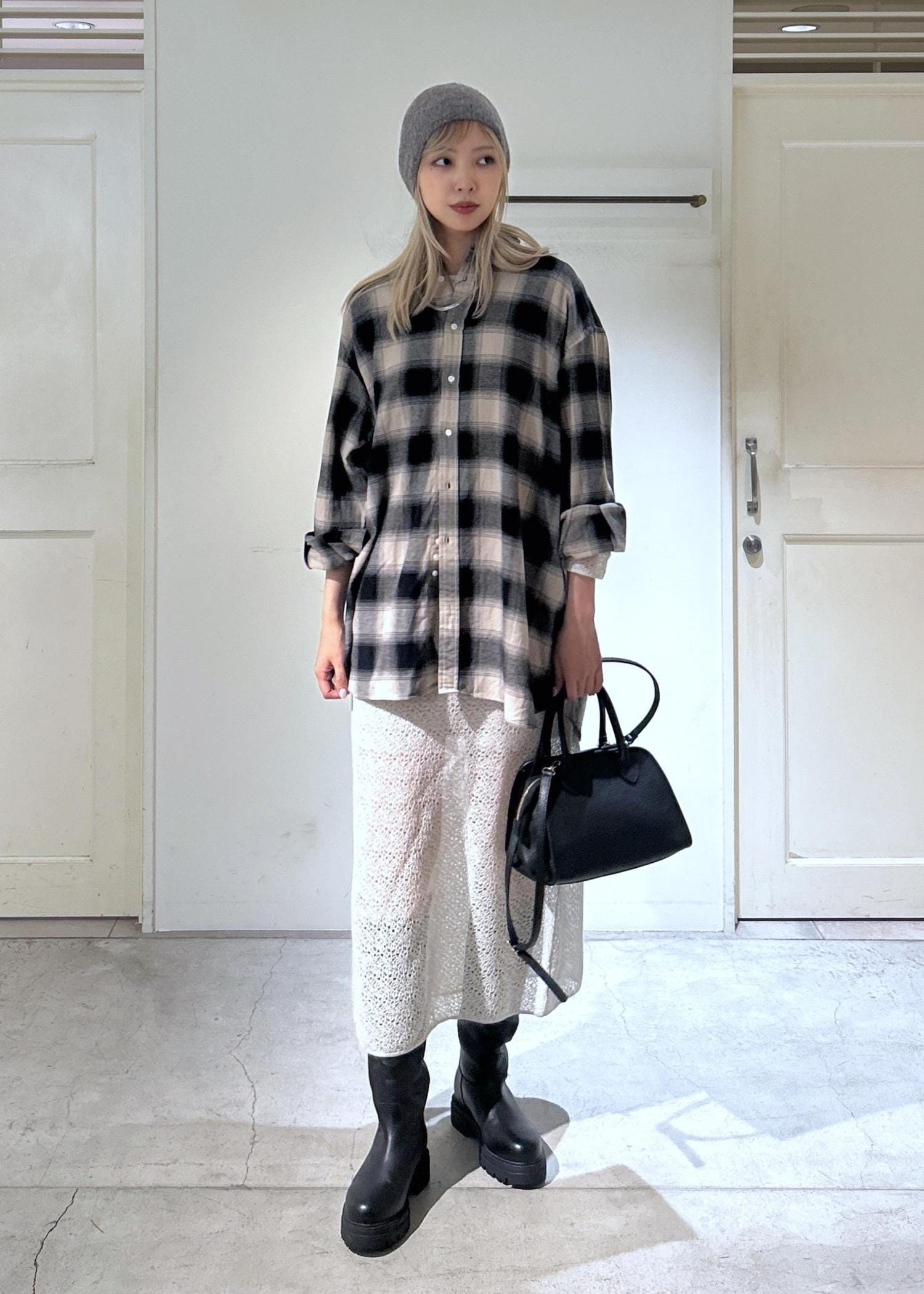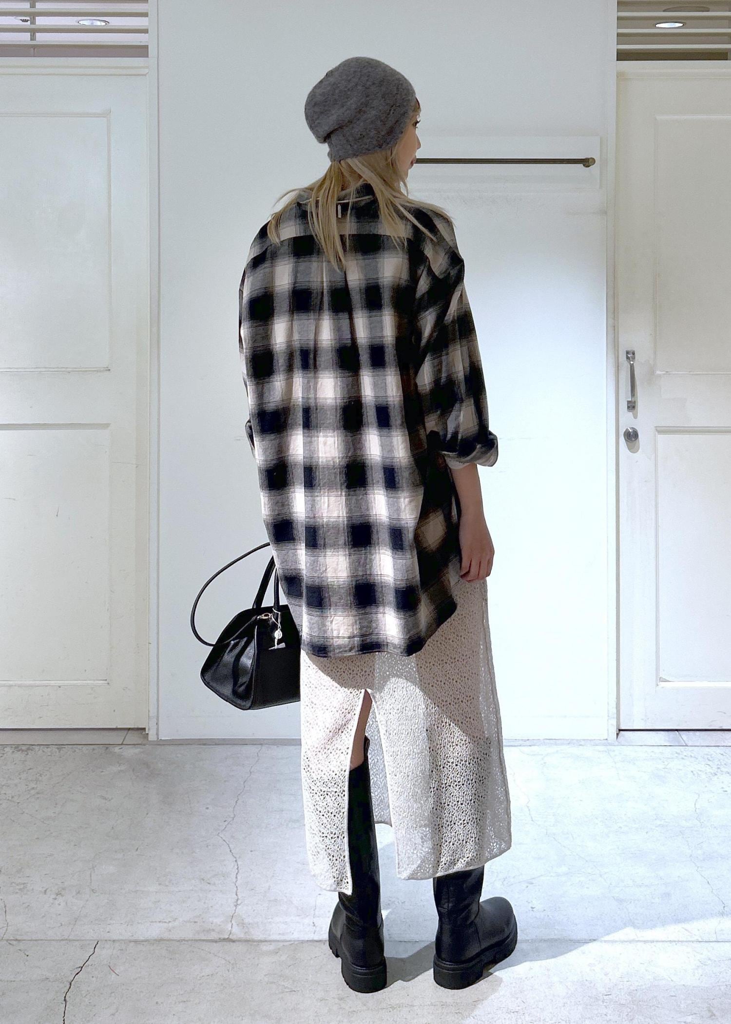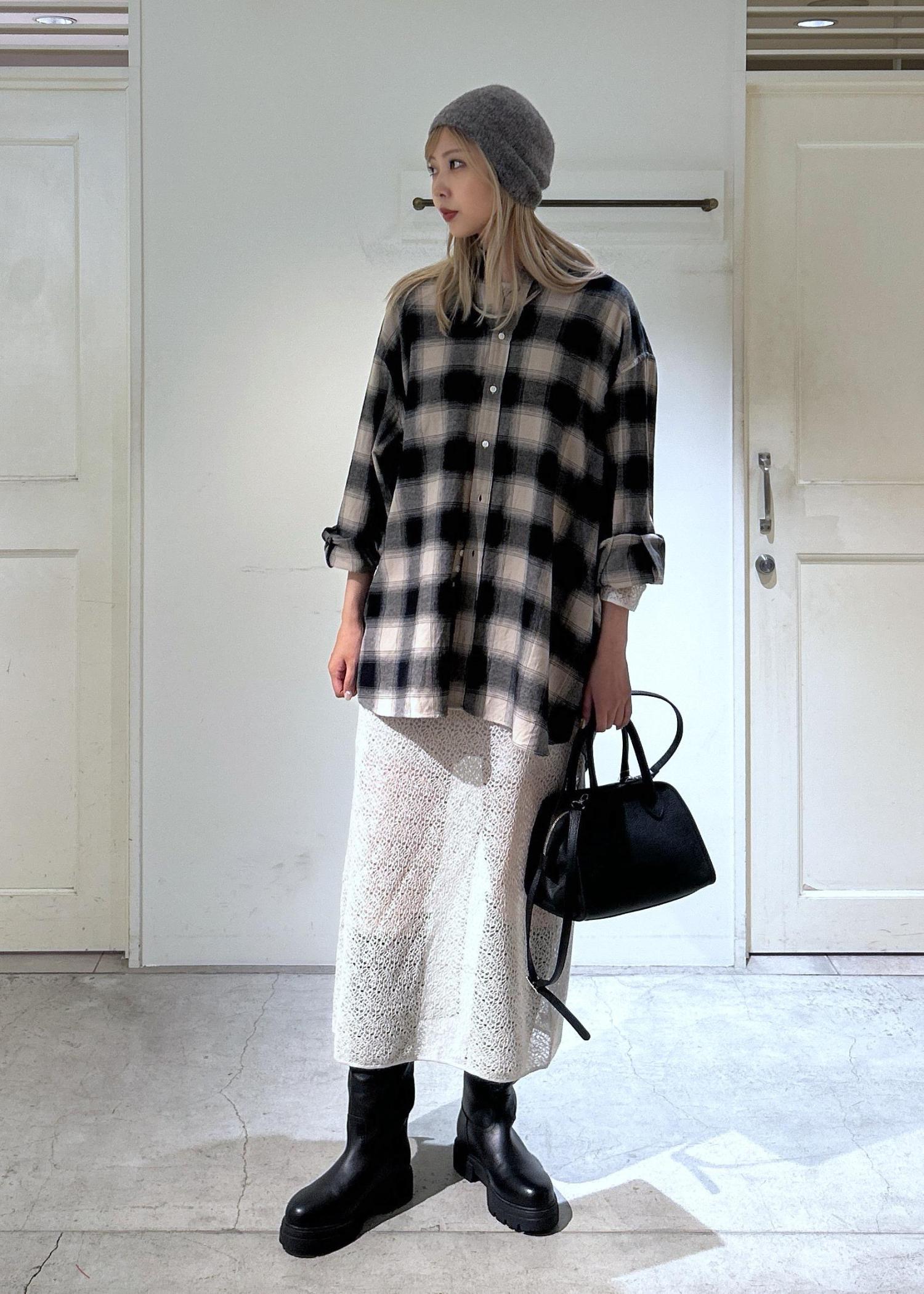 オーバーサイズでメンズライクなシャツにレースワンピやロングブーツを合わせることでフェミニンさをプラスしてみました。