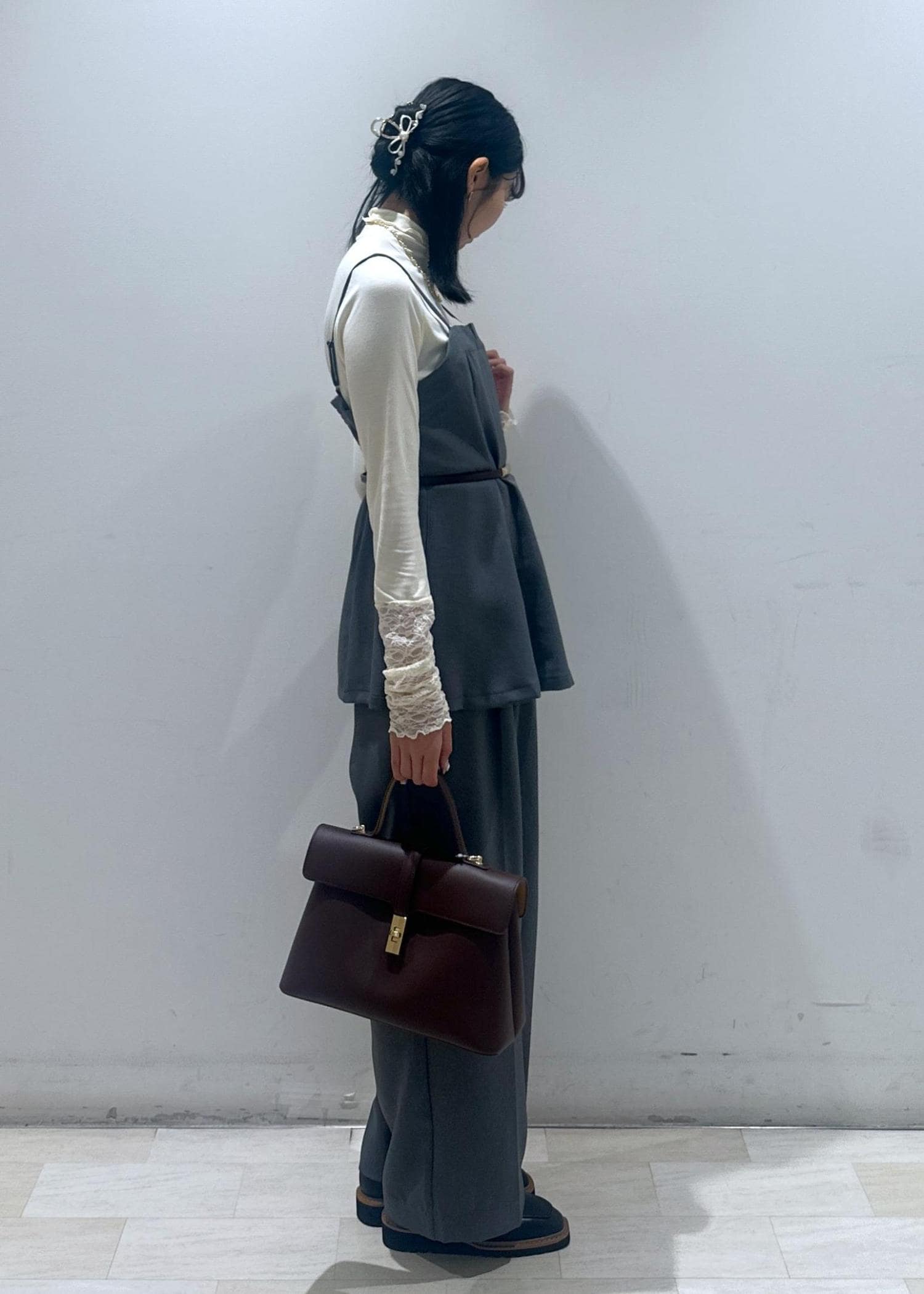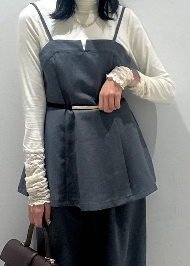 胸元のスリットがジャケットやカーディガンなどを羽織った時にポイントになるアイテムです。