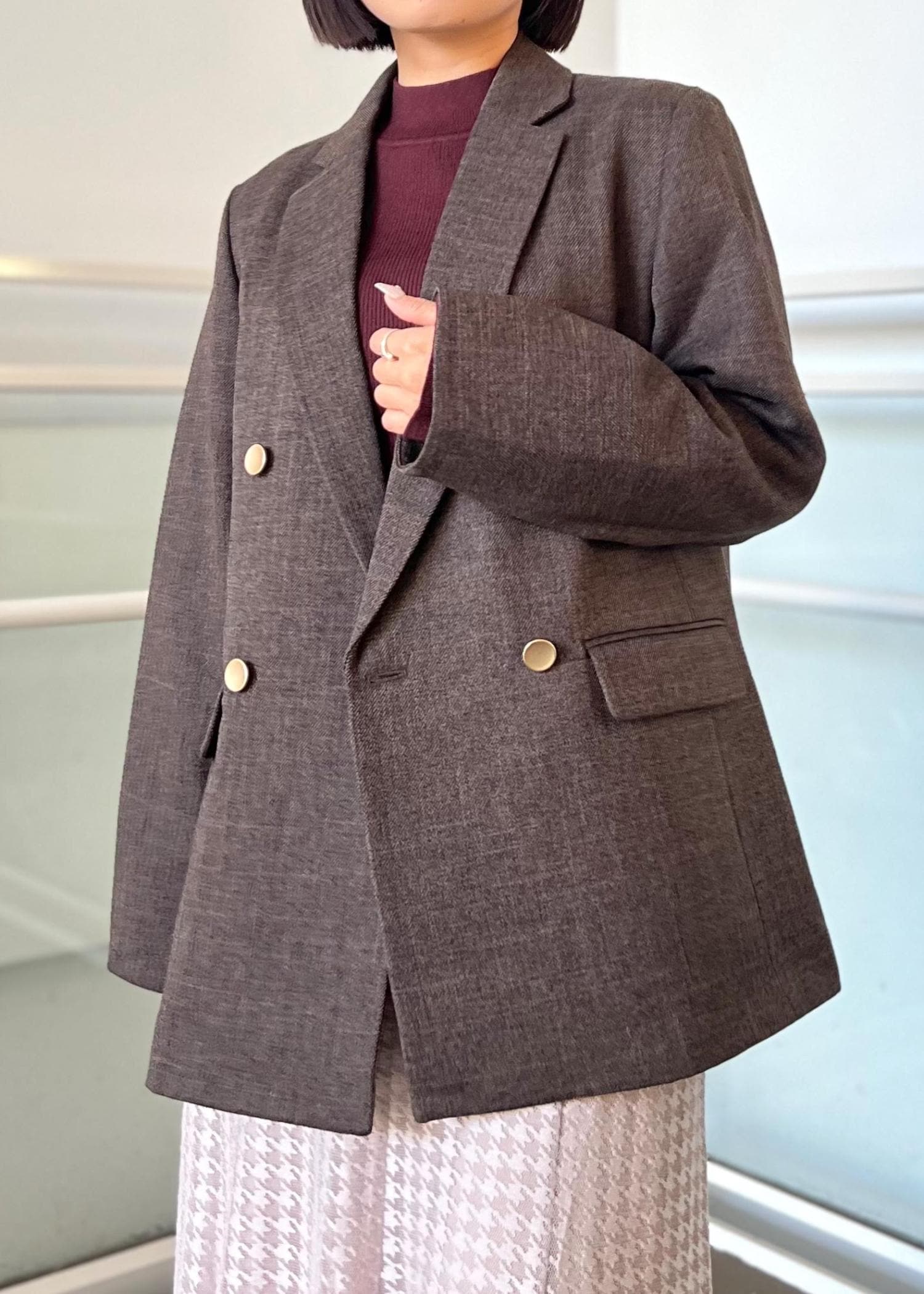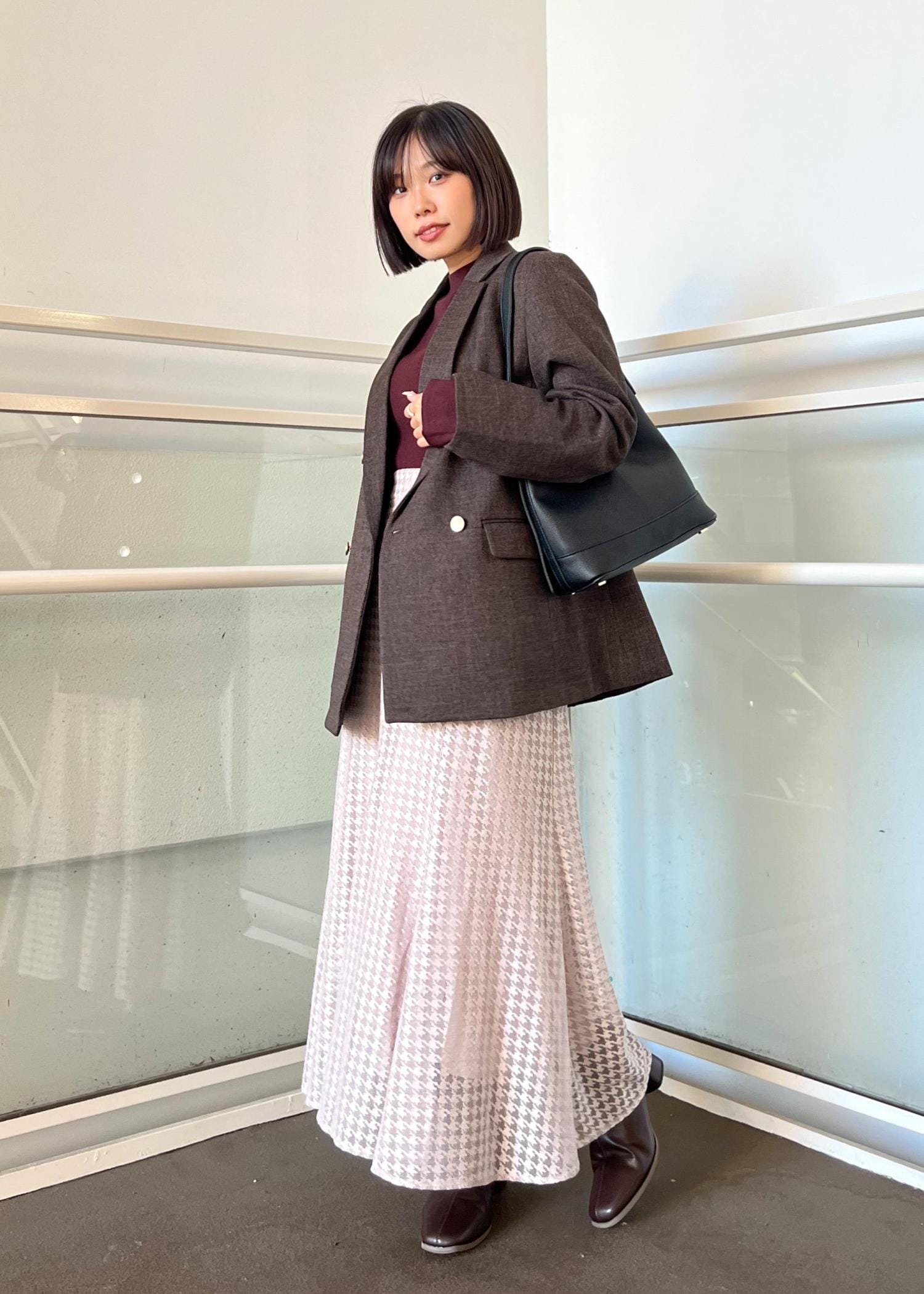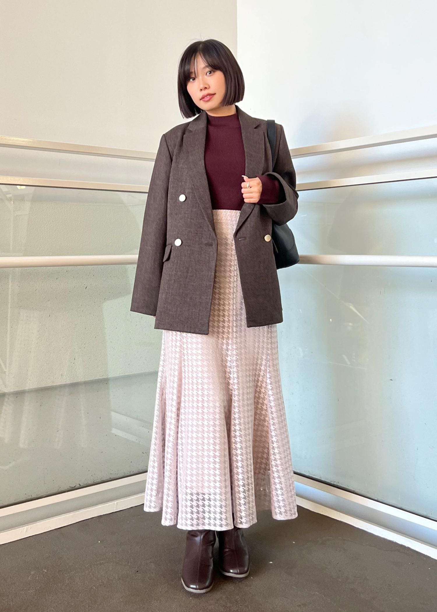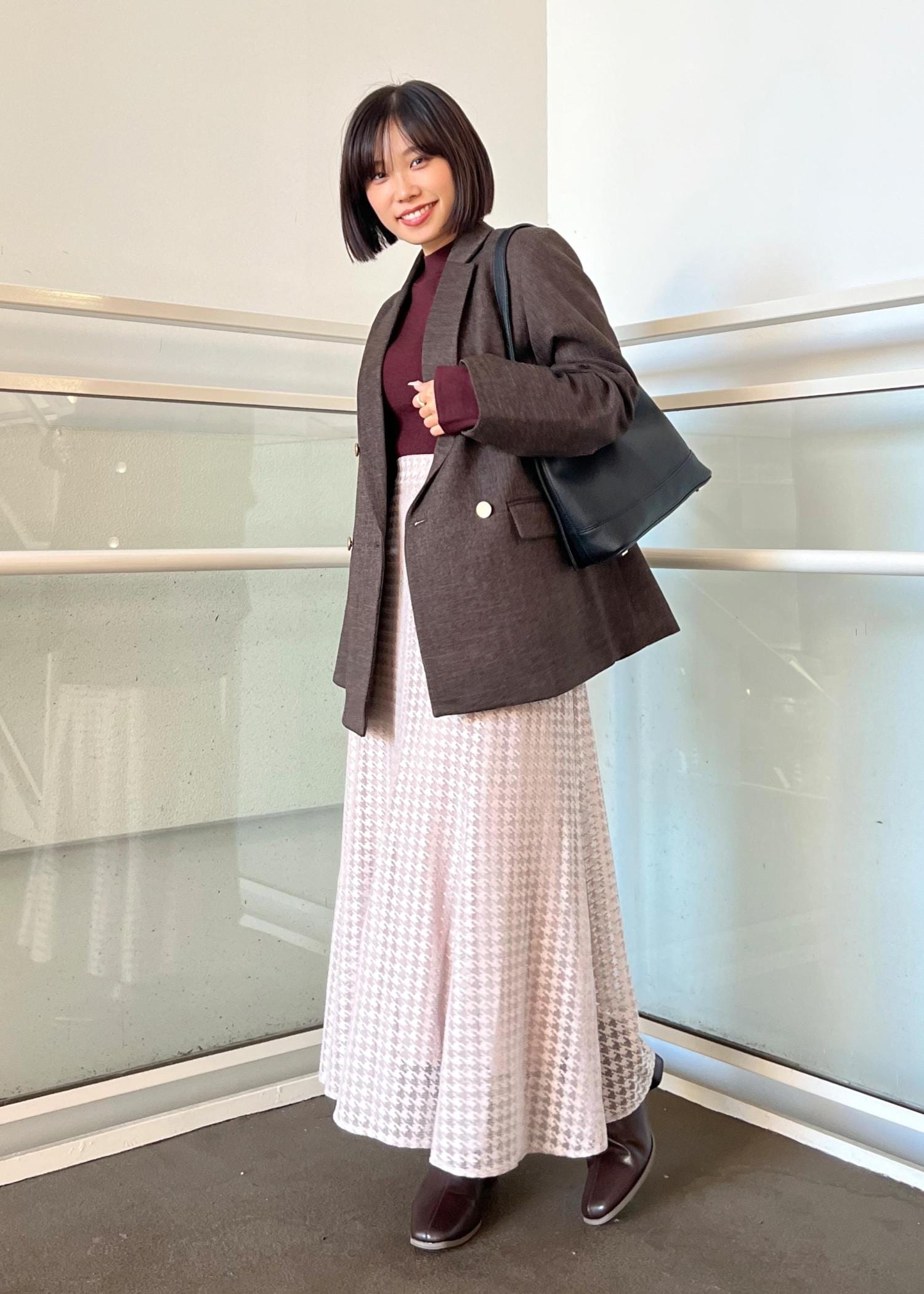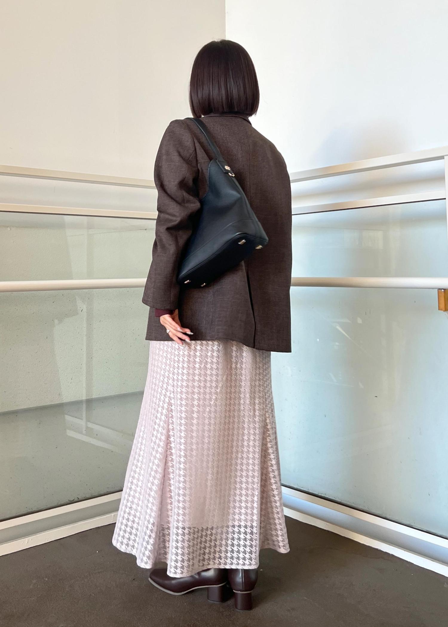 ブラウンが上品なので、女性らしいアイテムで組み合わせてみました。ジャケットは大きめのシルエットでMサイズを着用しています。秋カラーでこの季節を楽しみましょう!