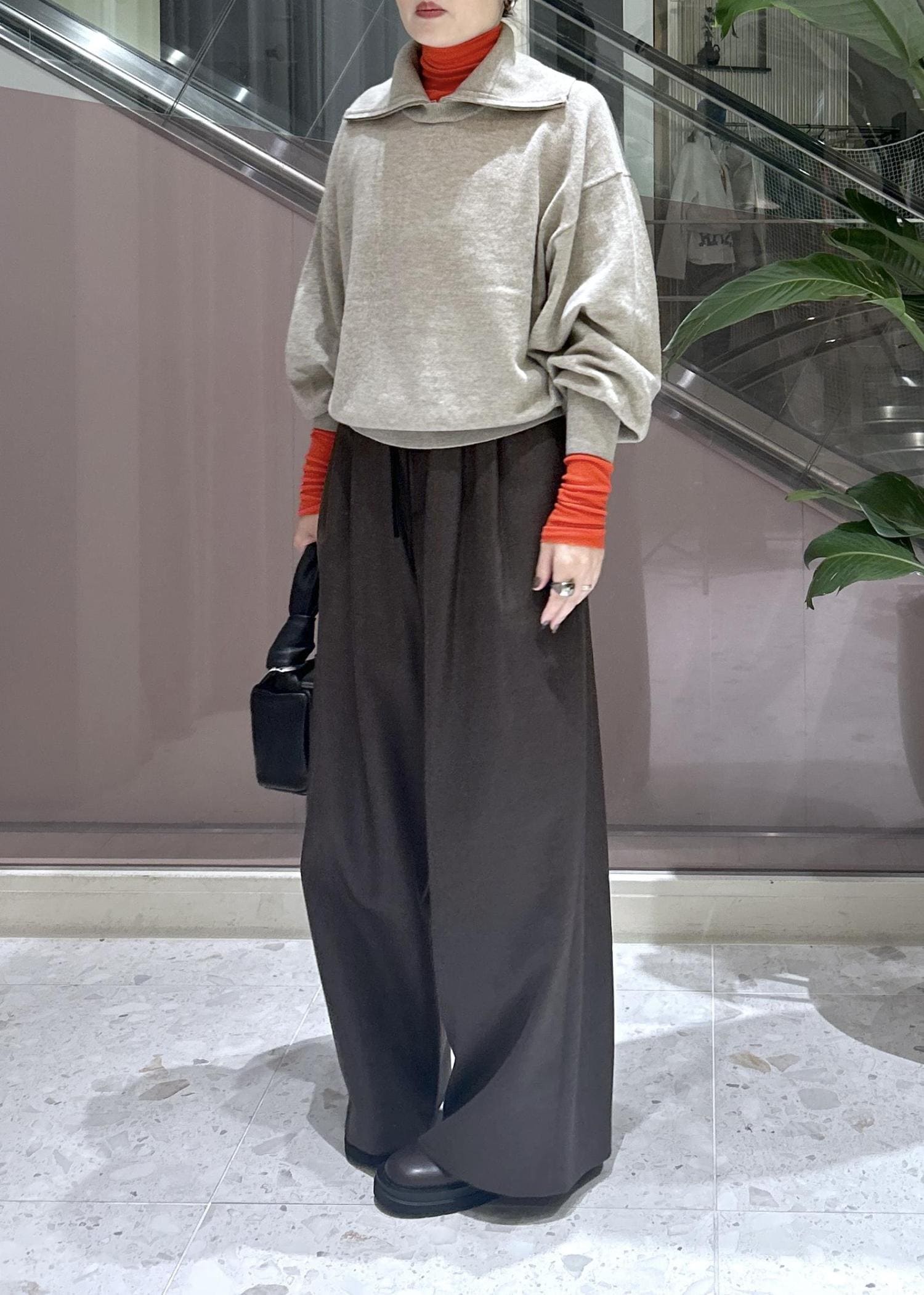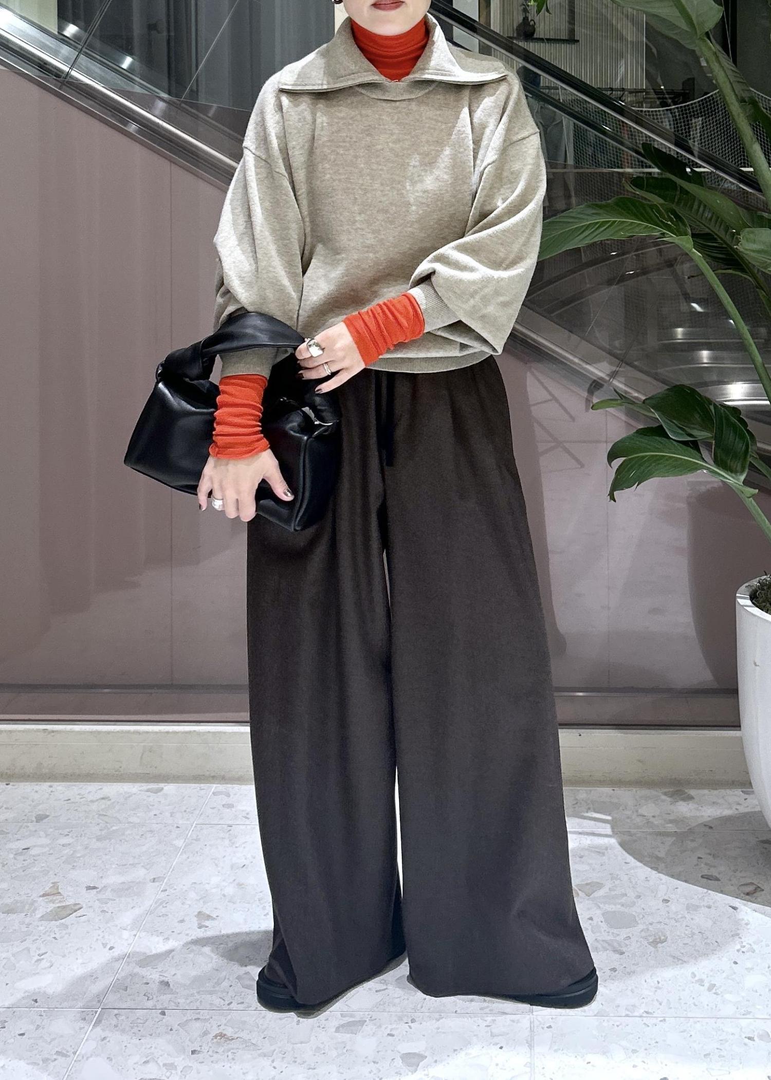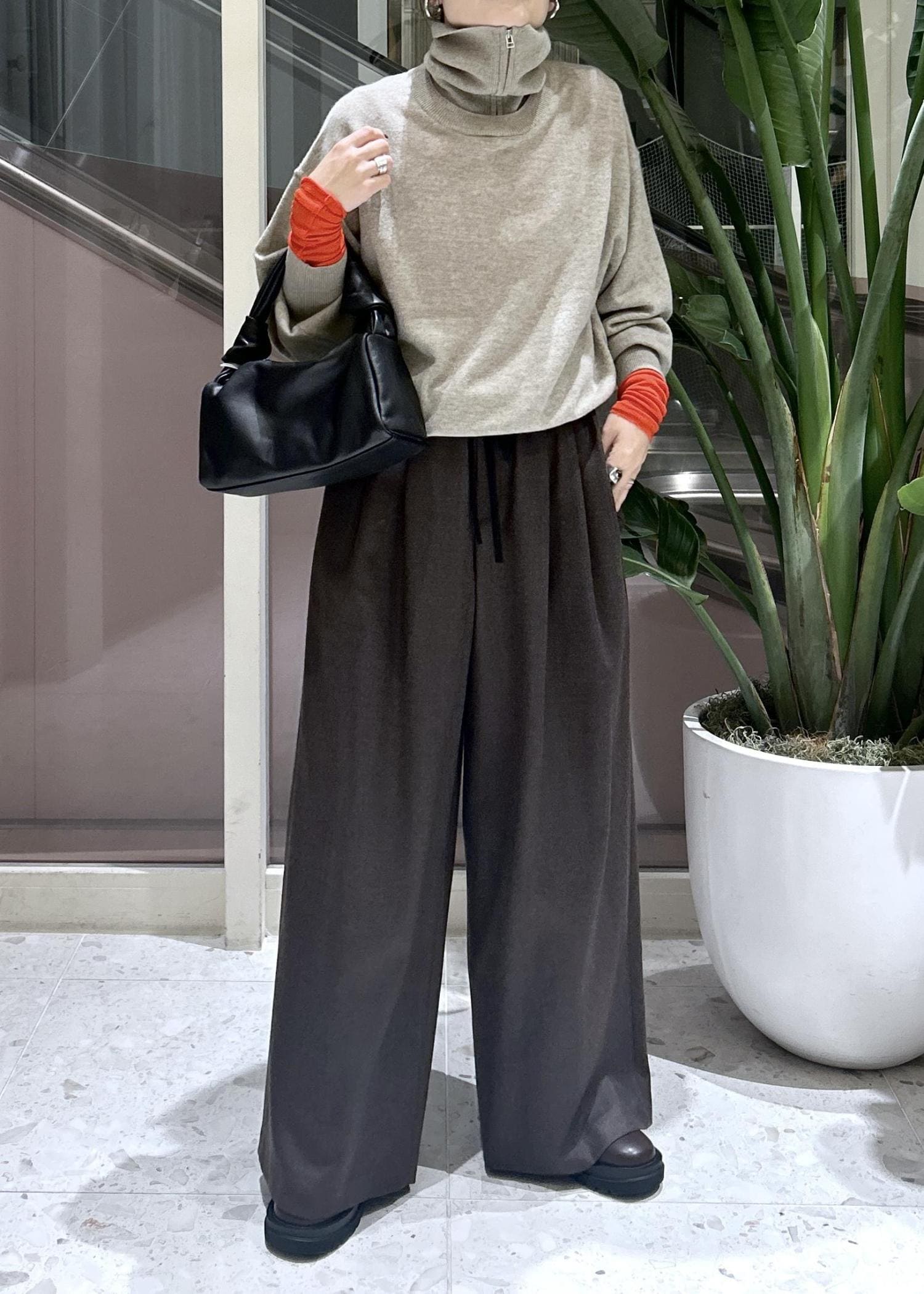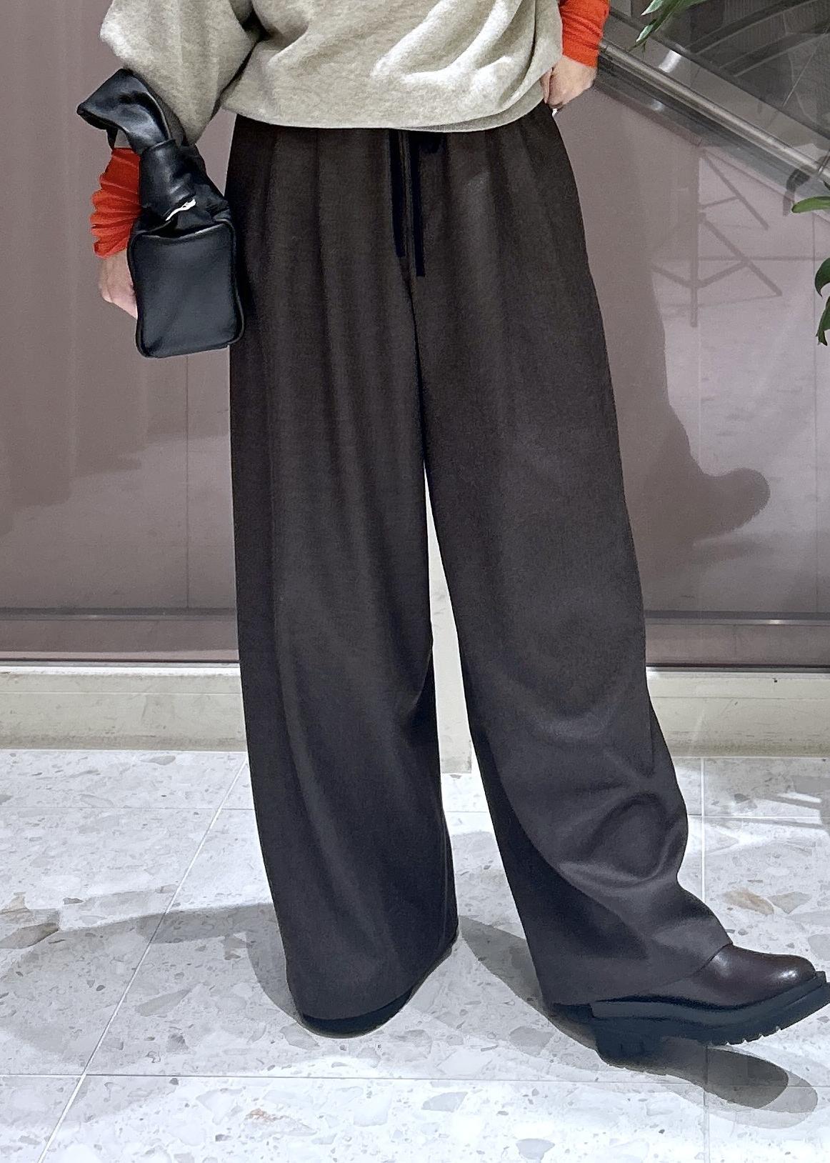 ウール素材のイージーパンツ!ウエストはゴムで、紐でも調節ができるため安心。ゆったりしたシルエットにウールの綺麗め素材がマッチしてこなれ感UP!