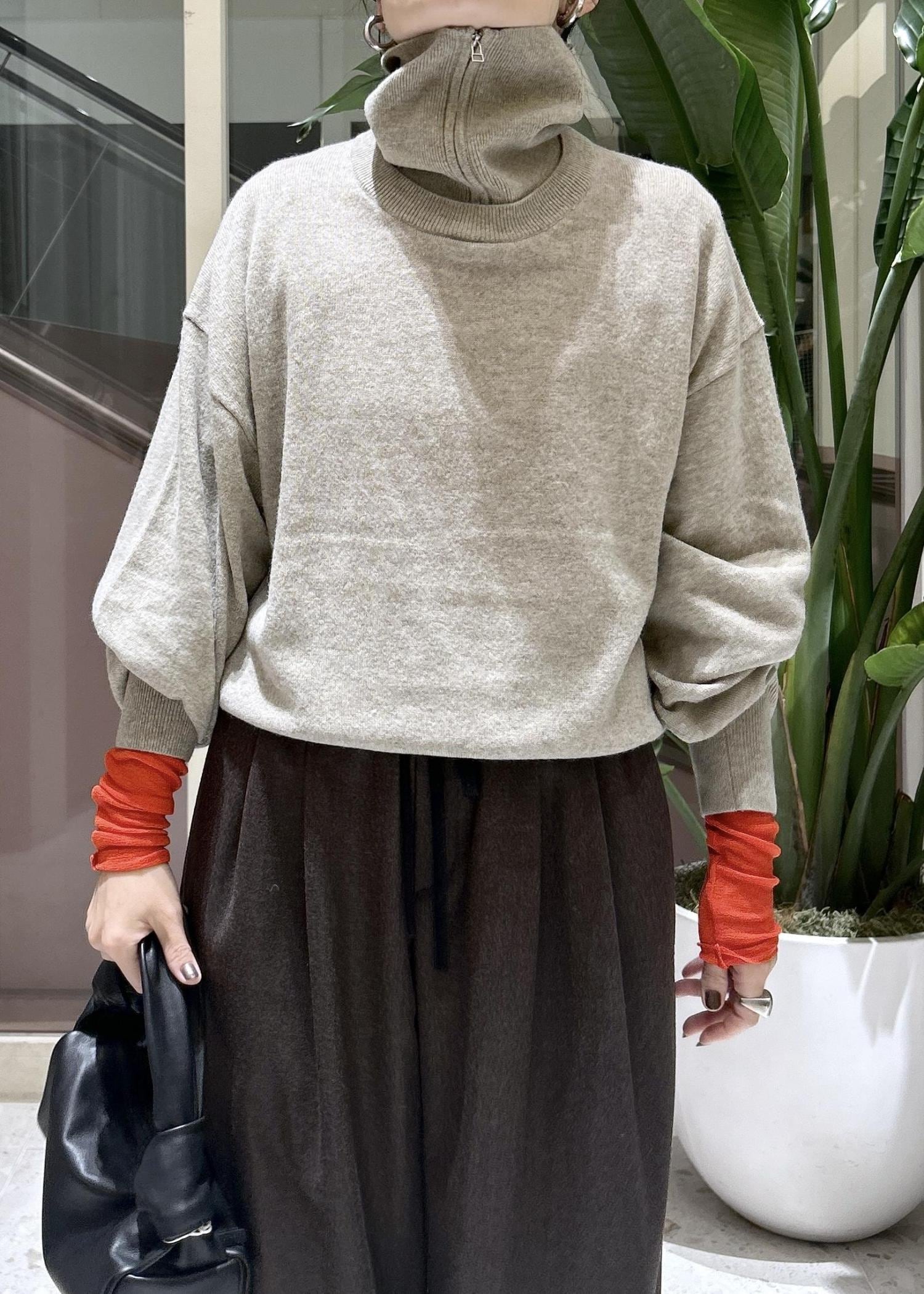 ウールカシミアのふんわりと優しい肌触りで、着ていて気持ちの良いニット。滑らかな素材感は大人な雰囲気を醸し出してくれます。袖先がリブになっており、袖の膨らみが自然と調整されて程よい落ち感に。