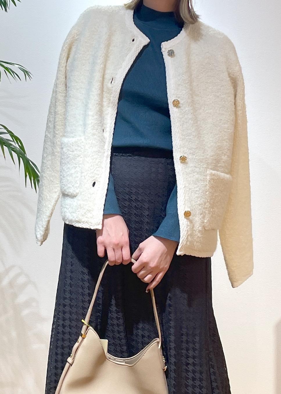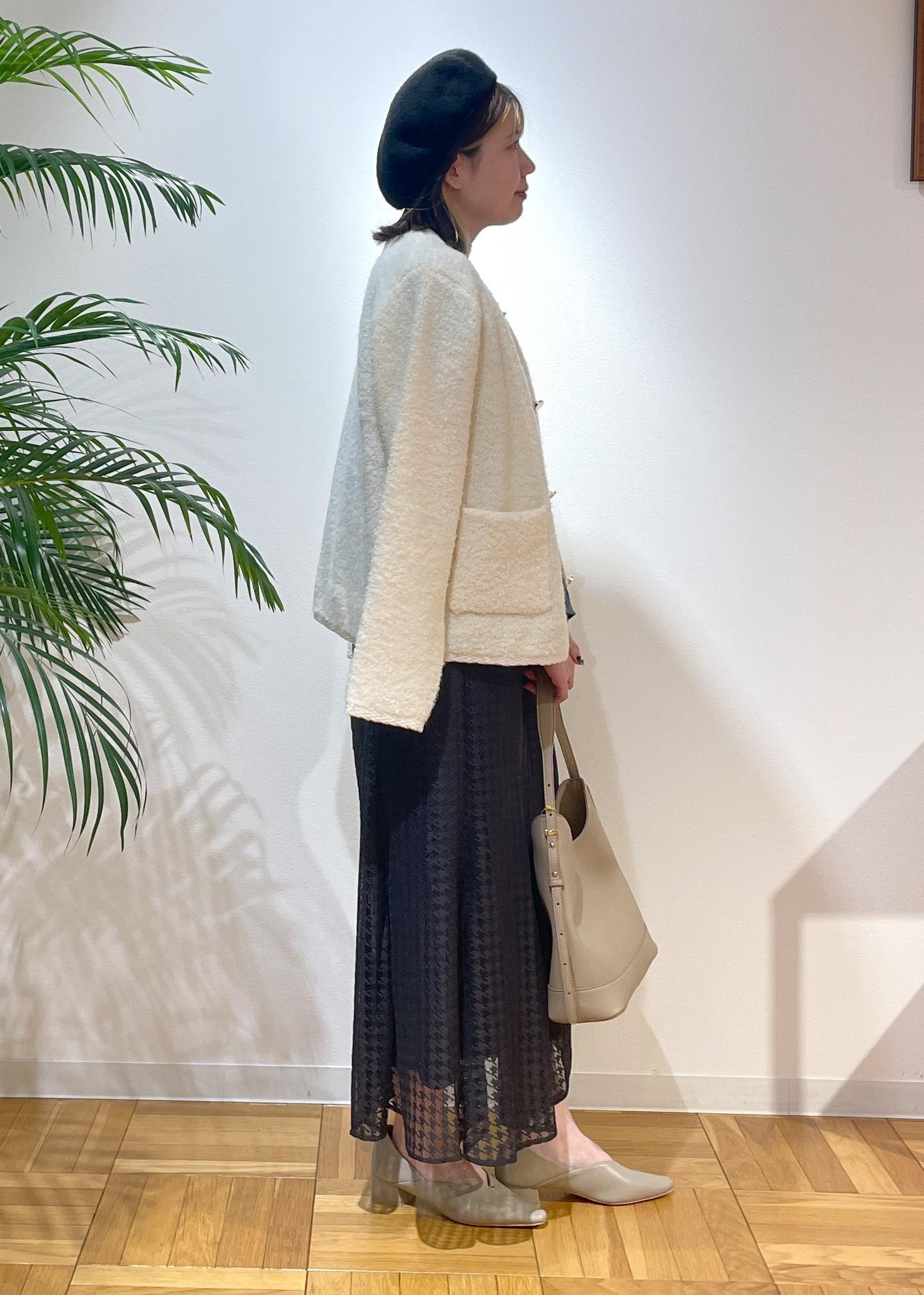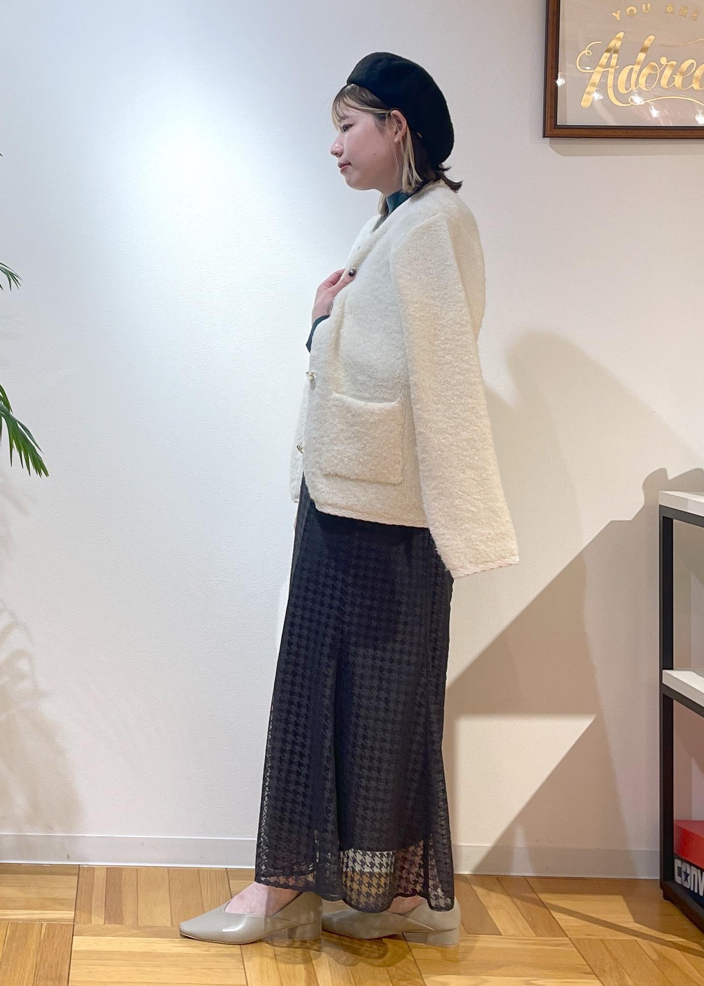 ダークグリーンの色にブラックで落ち着いた印象になりますが、明るいアウターを合わせると顔周りが一気に明るくなり、女性らしさがグッと出てオススメです♩
