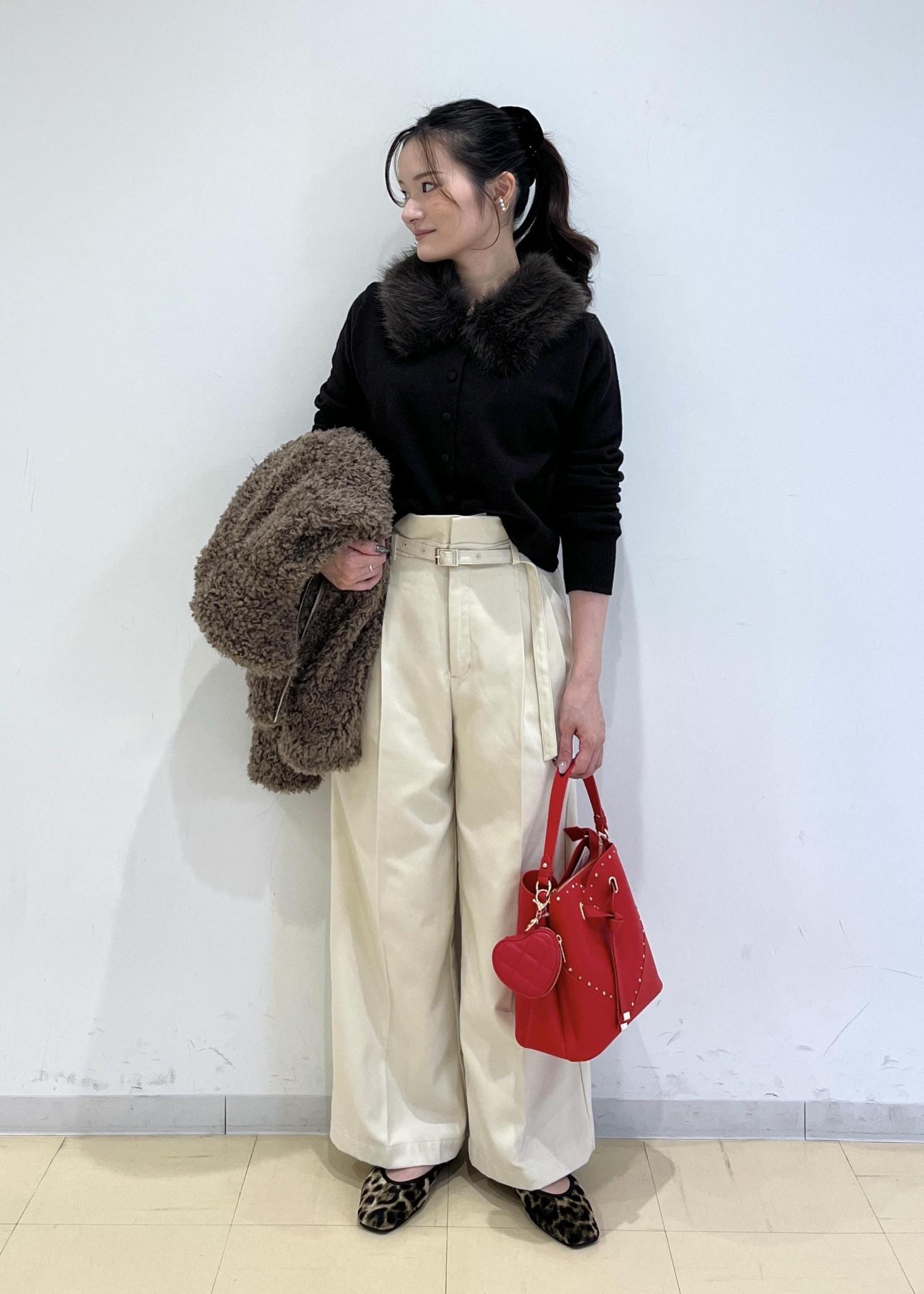トップスのピンクとボトムスのエコレザーブラックで甘辛MIXコーデにしてみました。