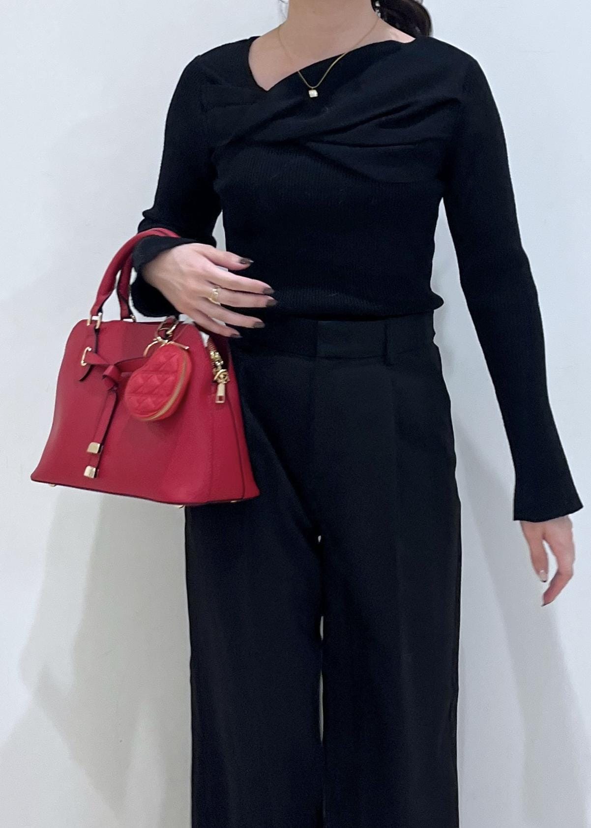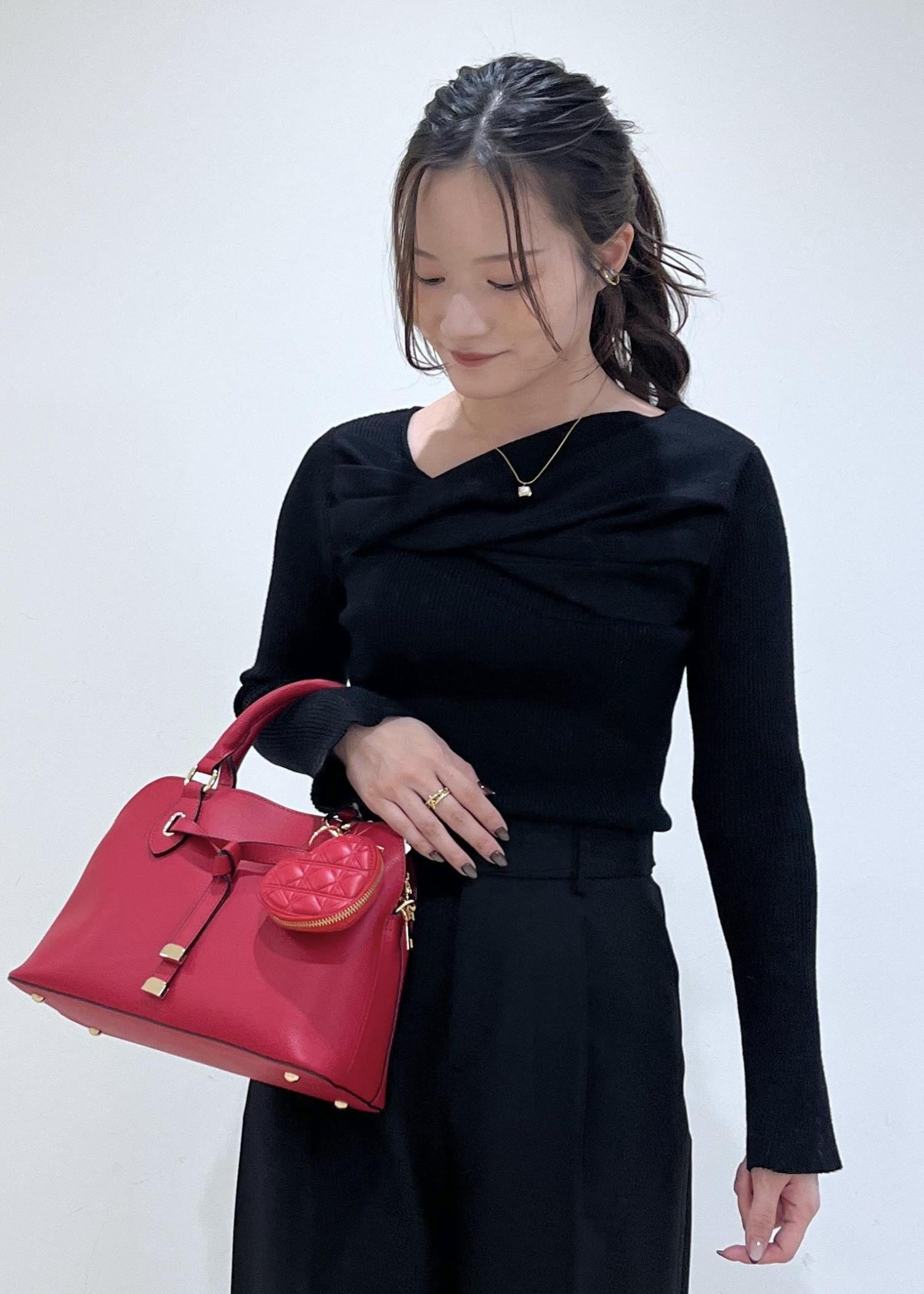 モノトーン系でまとめ、赤のバッグでポイントに♡