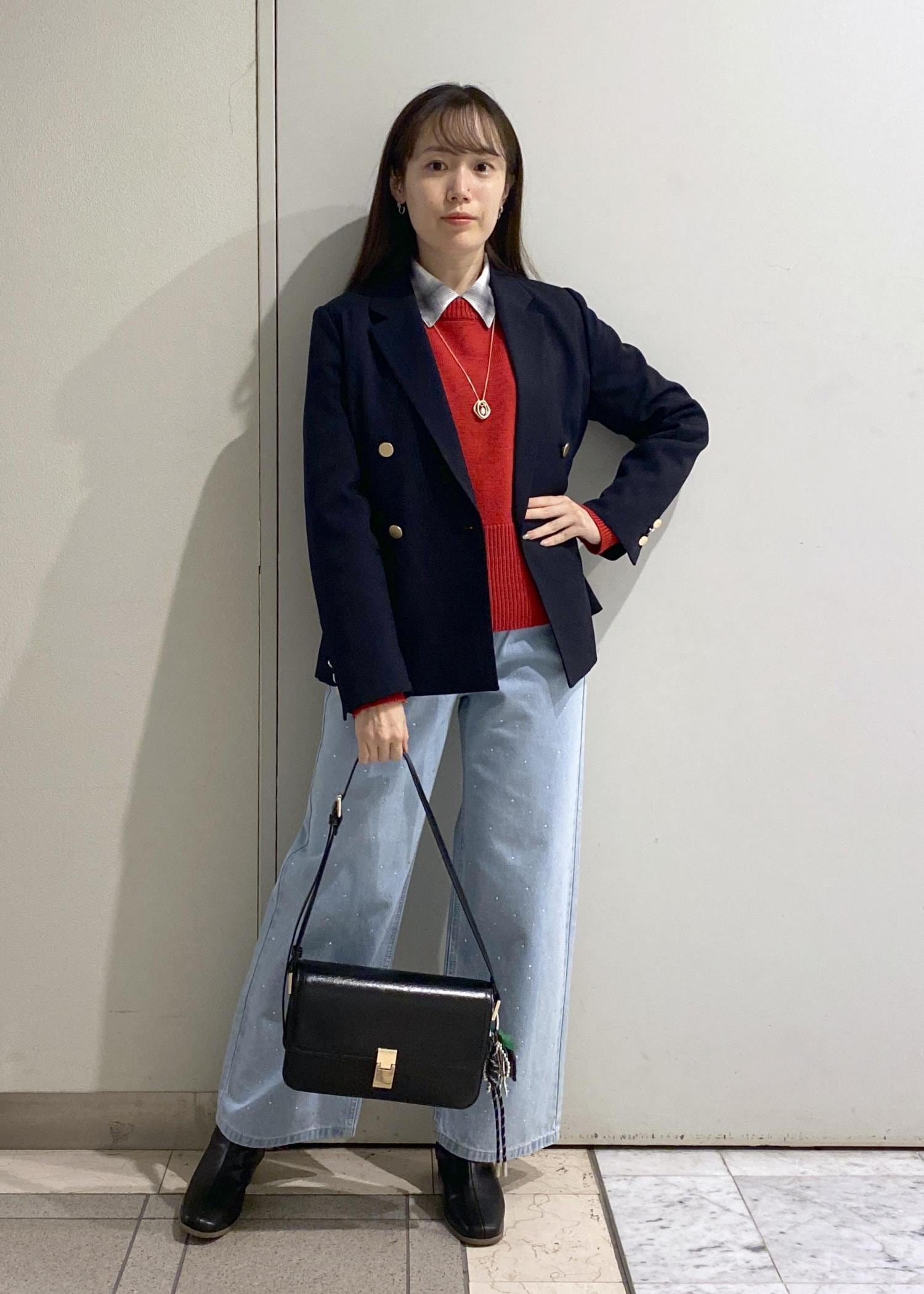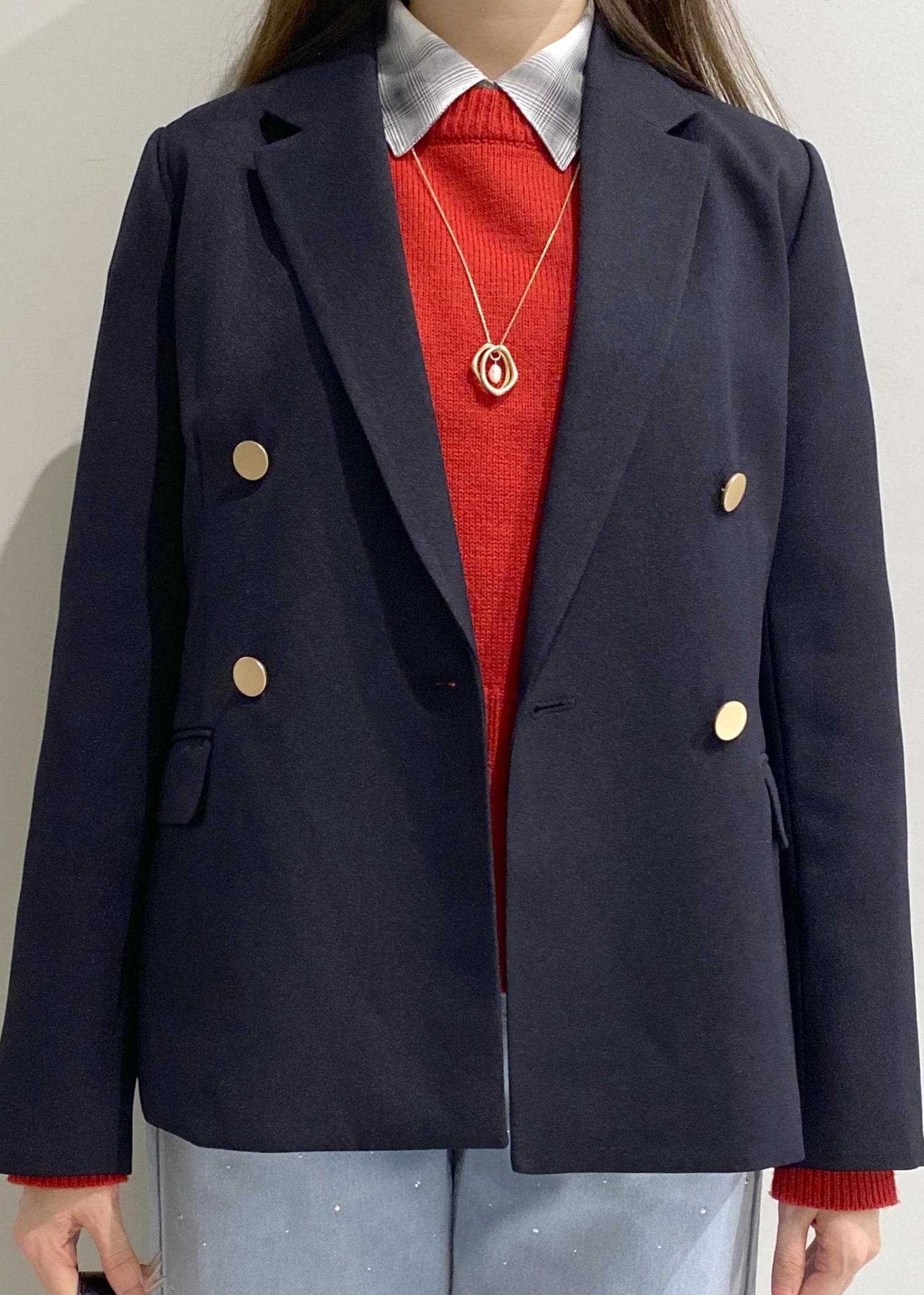 ジャケットのボタンと同じゴールドのネックレスがワンポイント♡