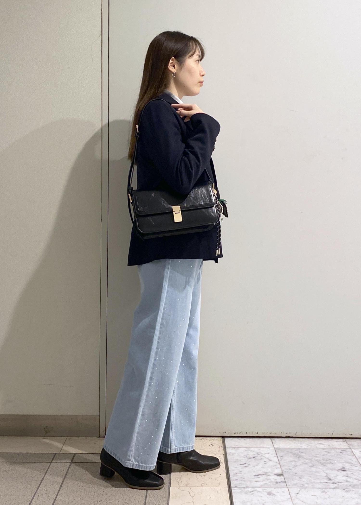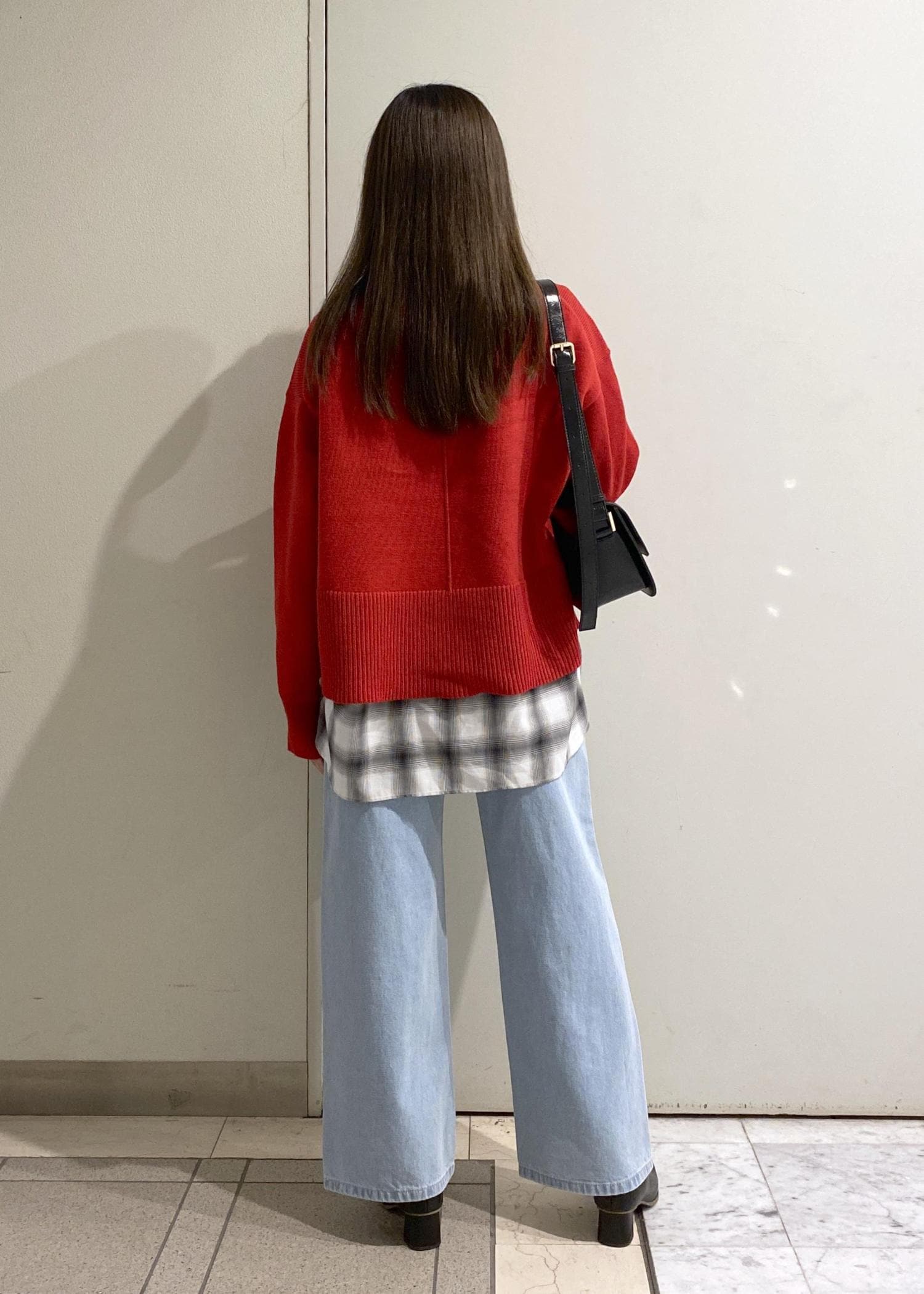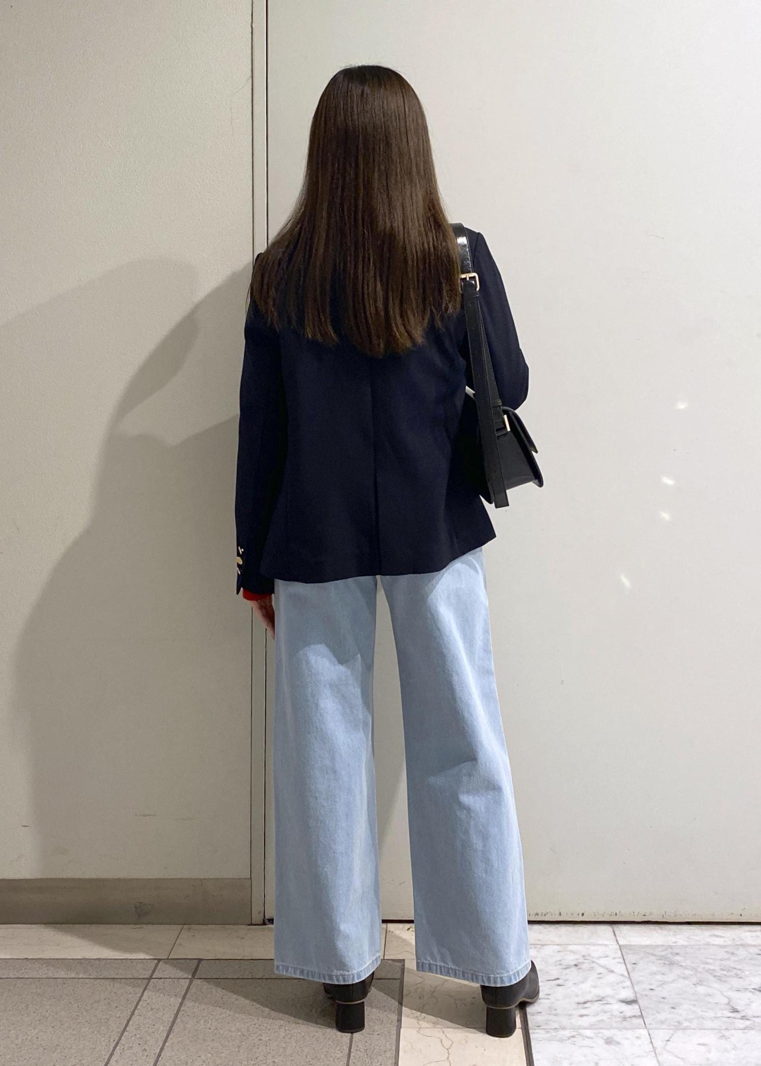 ワイドめのシルエットなので、トップスはスッキリまとめるのがおすすめです。 -