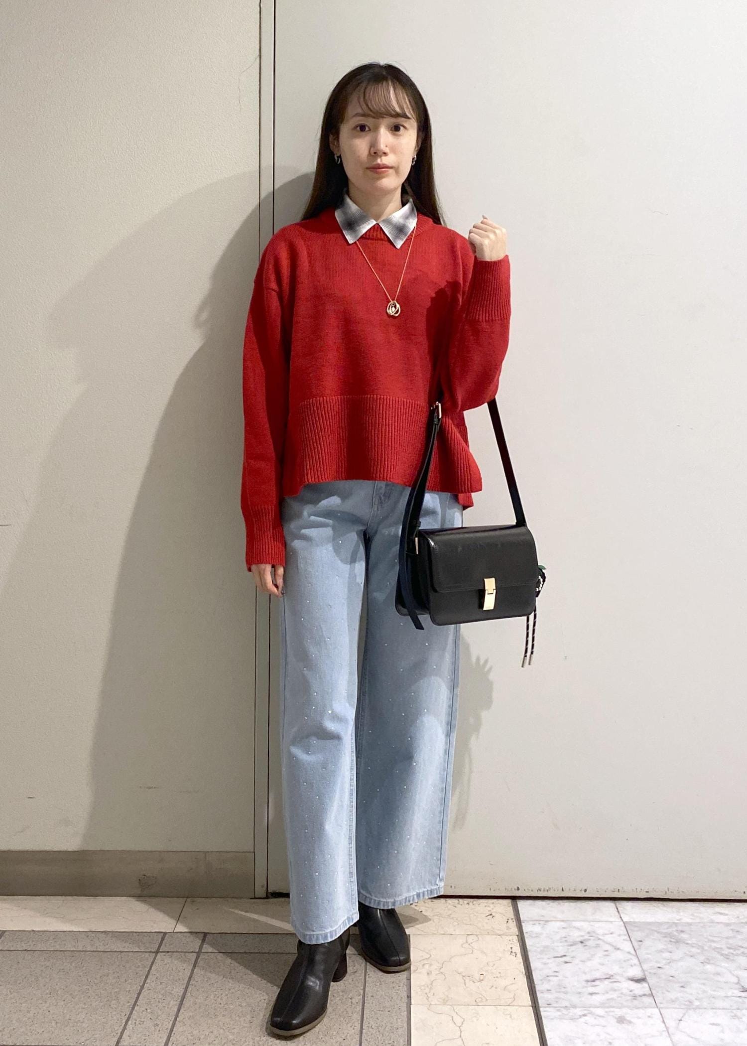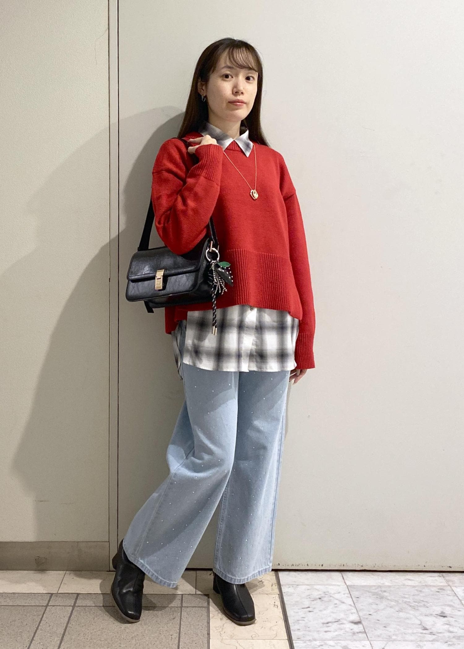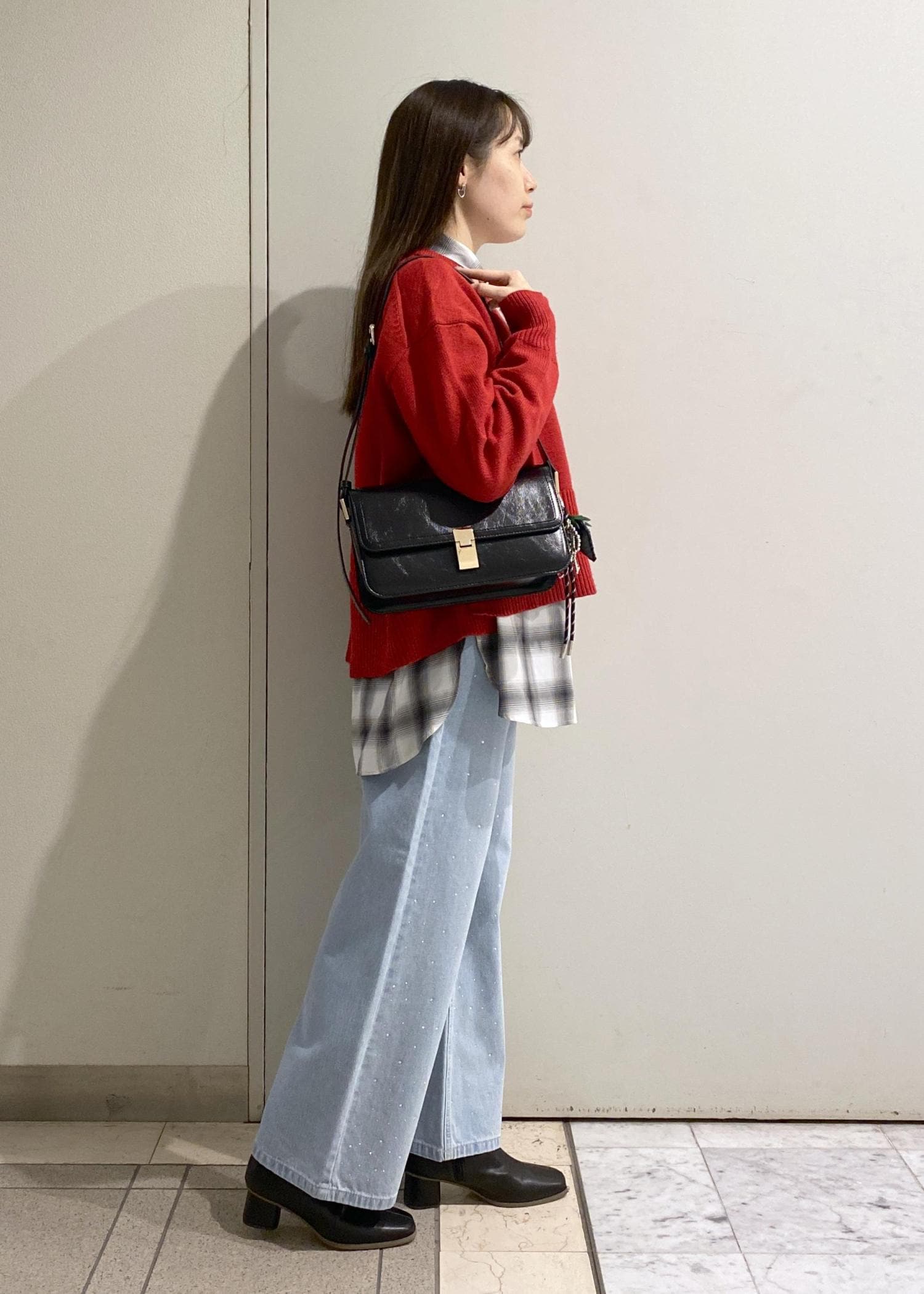 ワイドめのシルエットなので、トップスはスッキリまとめるのがおすすめです。 -