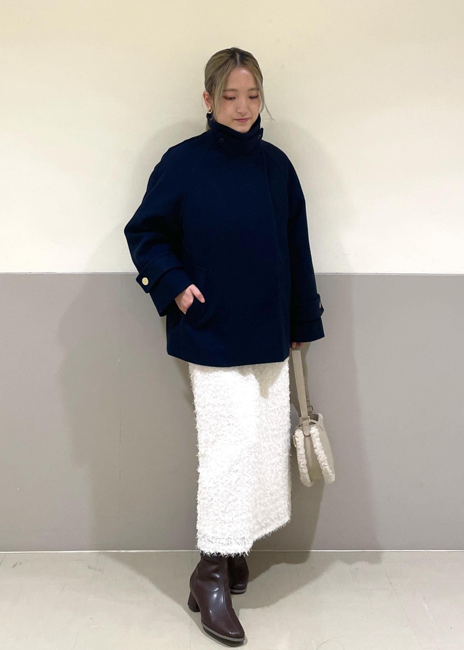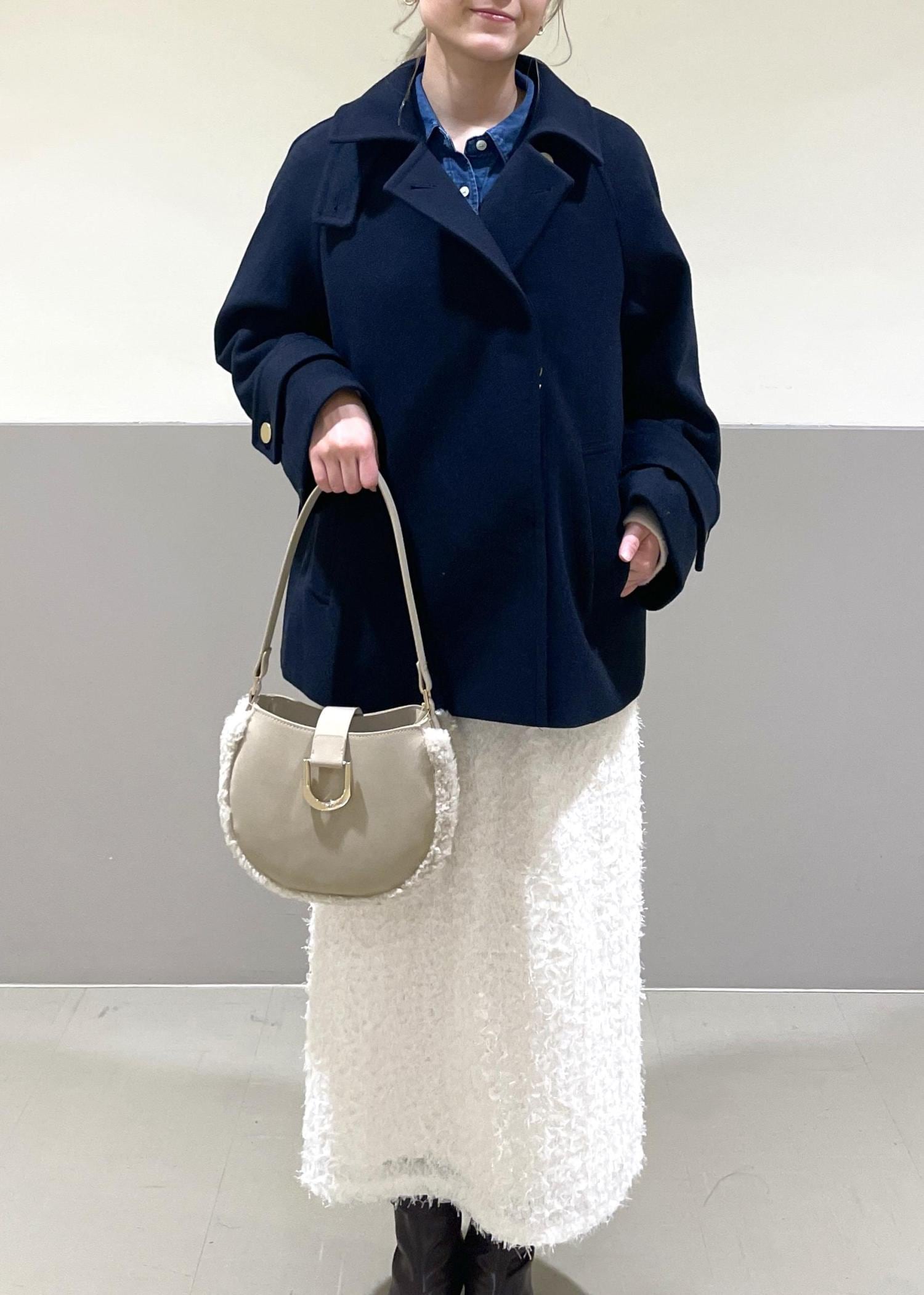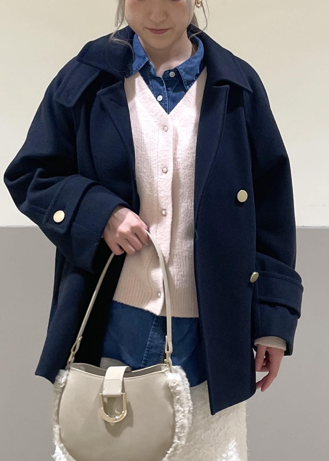 可愛いながらもしっかりと防寒できるネイビーのコートに、ピンクのカーディガンを合わせることで女性らしく暖かいコーディネートに仕上げました!デニムシャツをレイヤードすることで甘くなりすぎないことも意識しました。