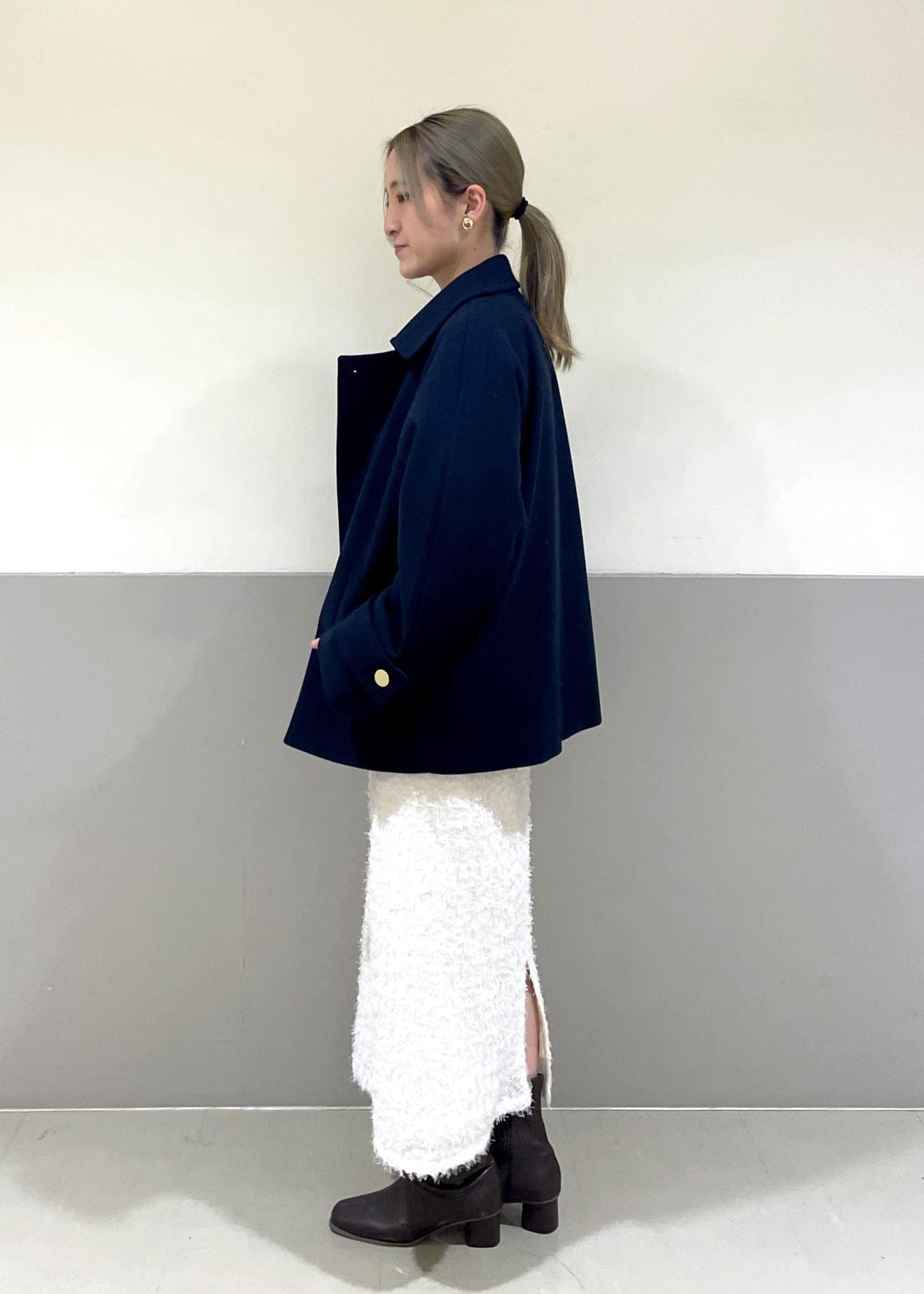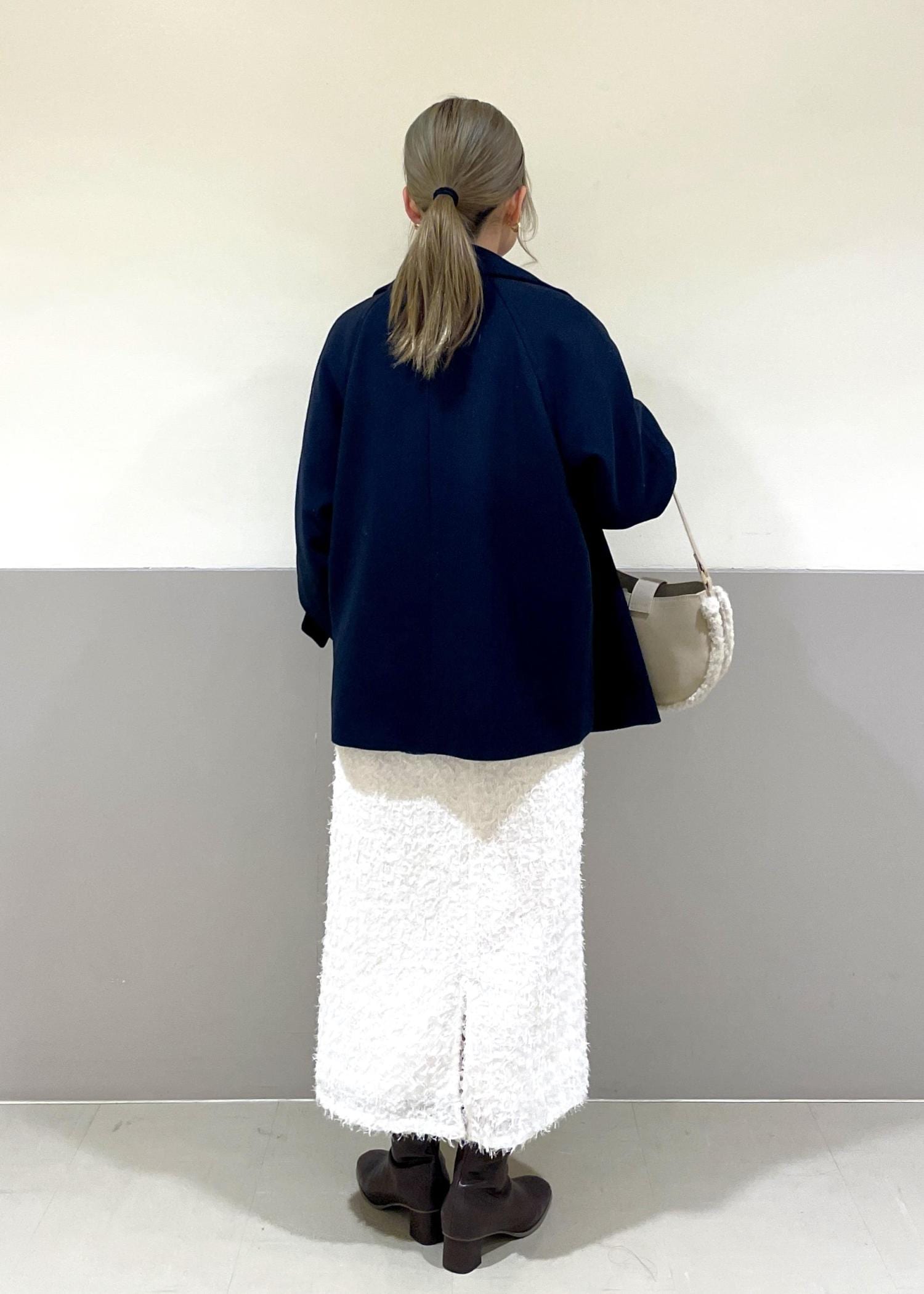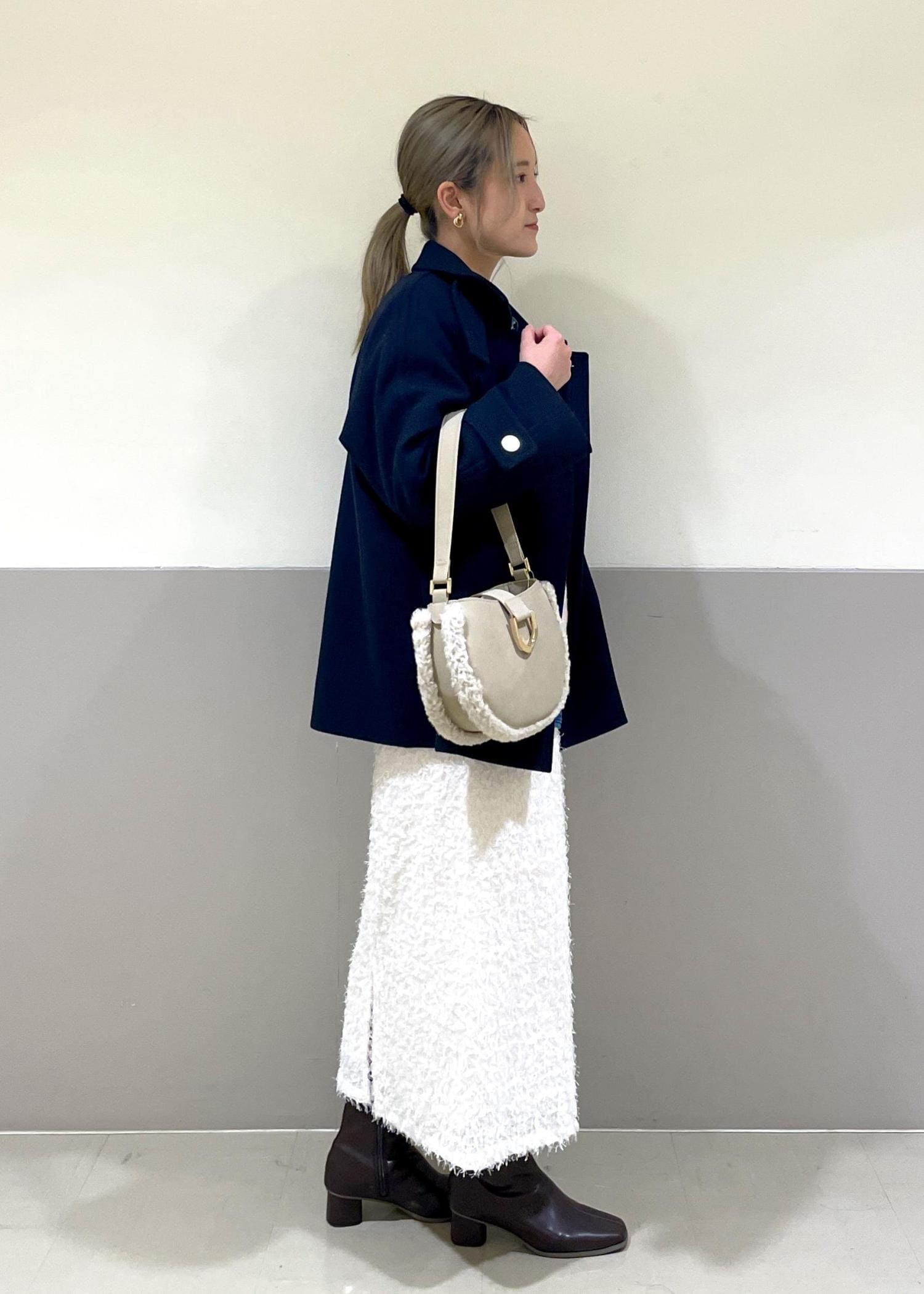 可愛いながらもしっかりと防寒できるネイビーのコートに、ピンクのカーディガンを合わせることで女性らしく暖かいコーディネートに仕上げました!デニムシャツをレイヤードすることで甘くなりすぎないことも意識しました。