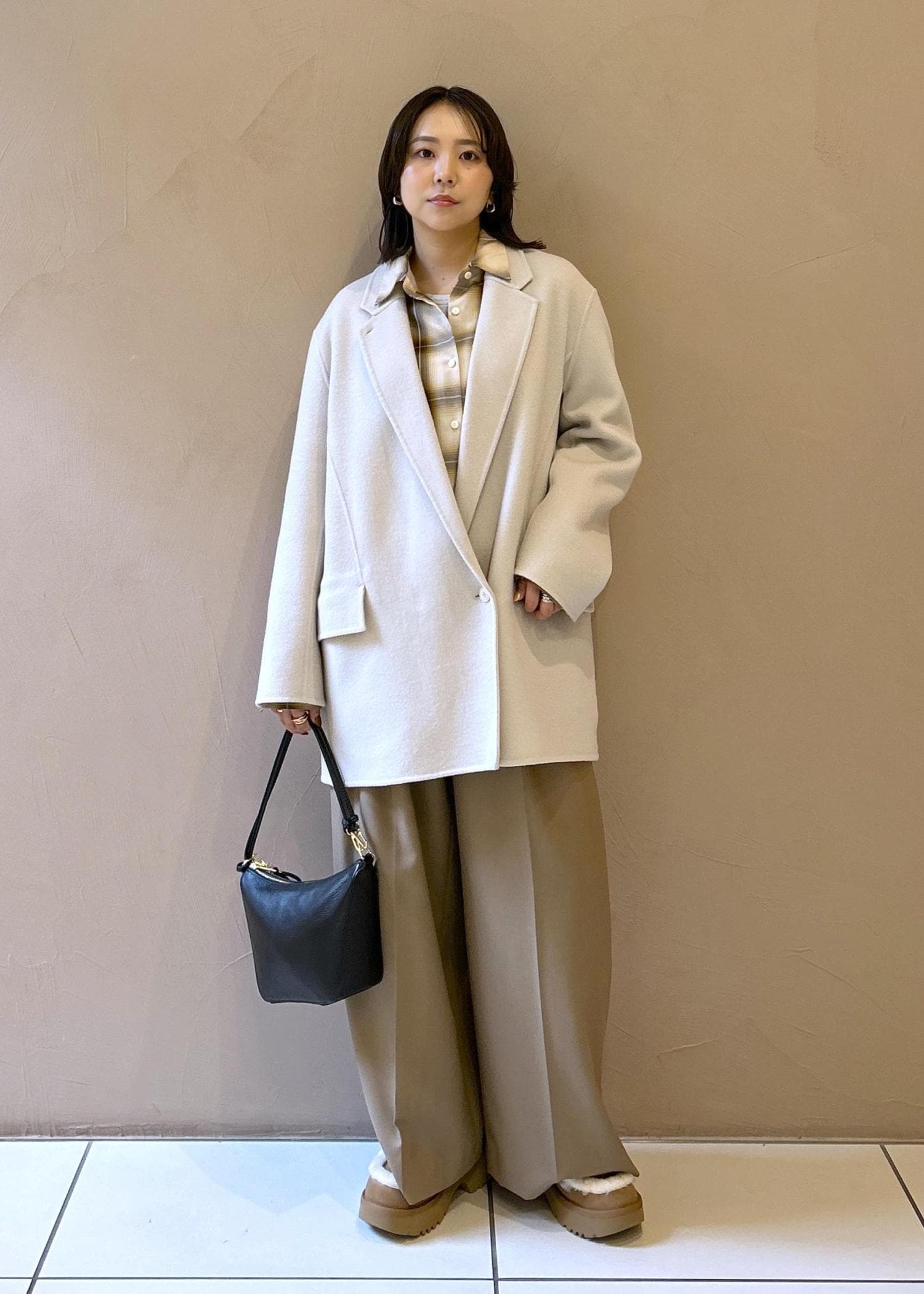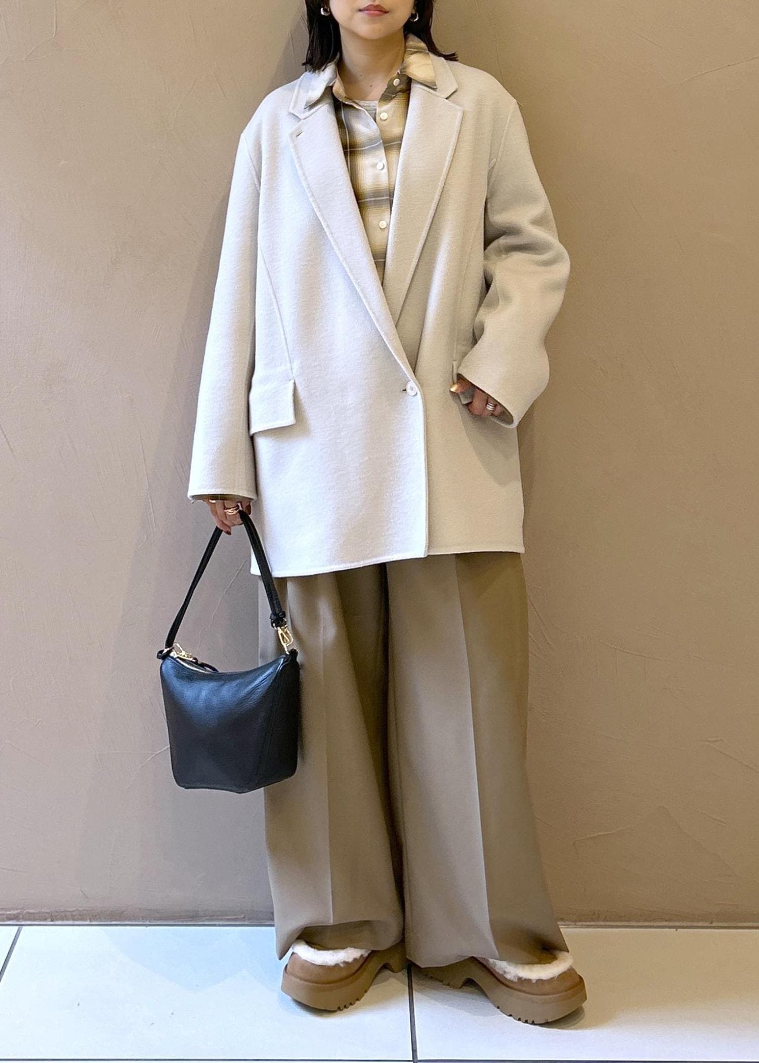 SALON adam et ropéシャルムリバージャケットコート / ミドルウールコートオフホワイト / F¥59,400レビューヒップが隠れるくらいの長めの丈感、身幅もゆったりとしたオーバーサイズなつくりです。
