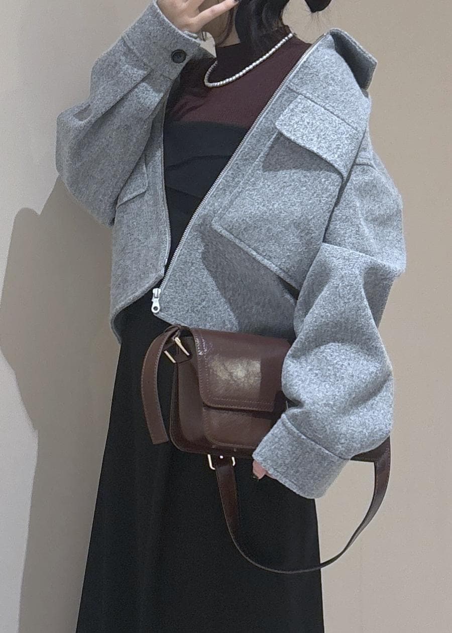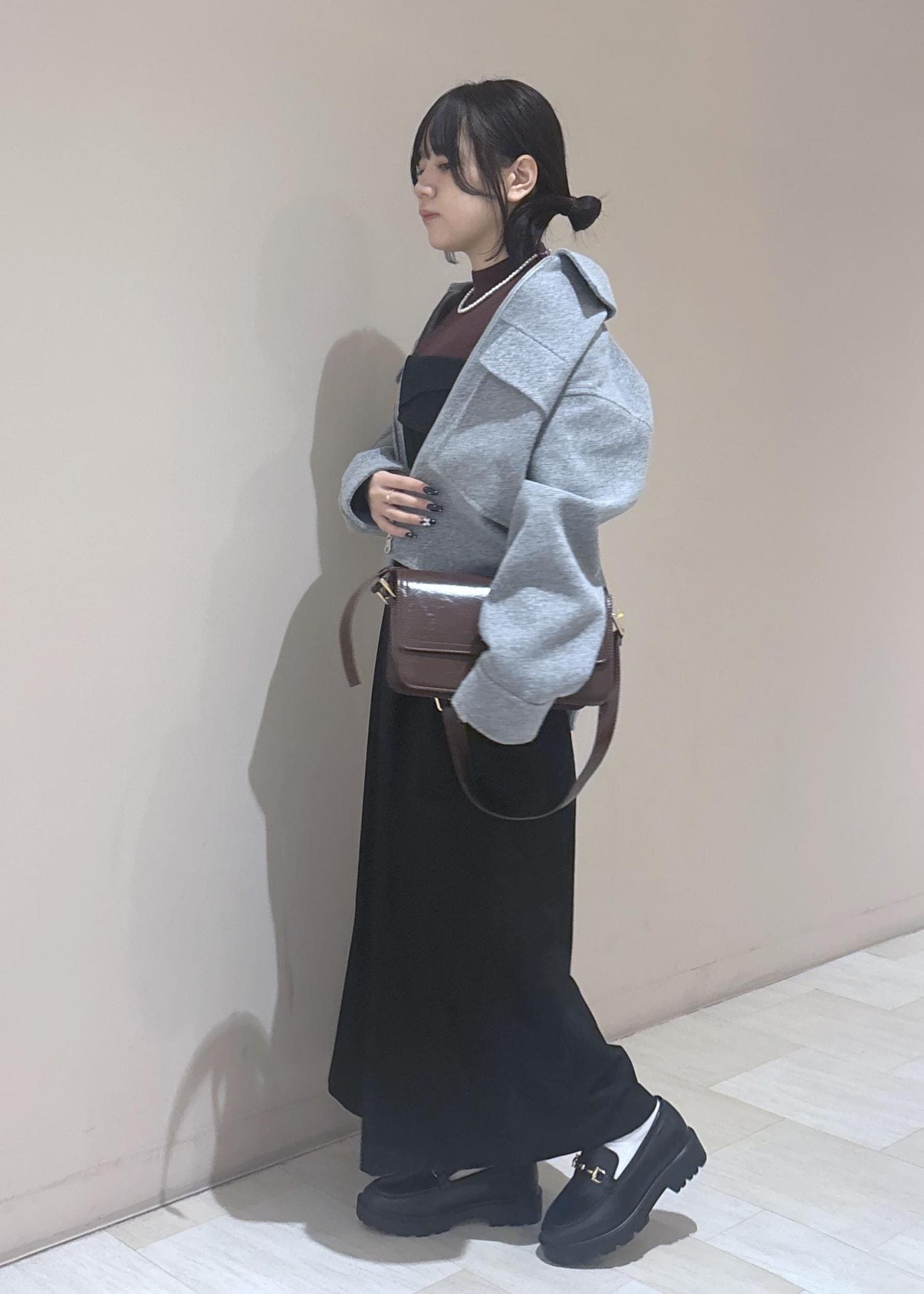 全体的にモノトーンなのですが、中に着てるニットとバッグを