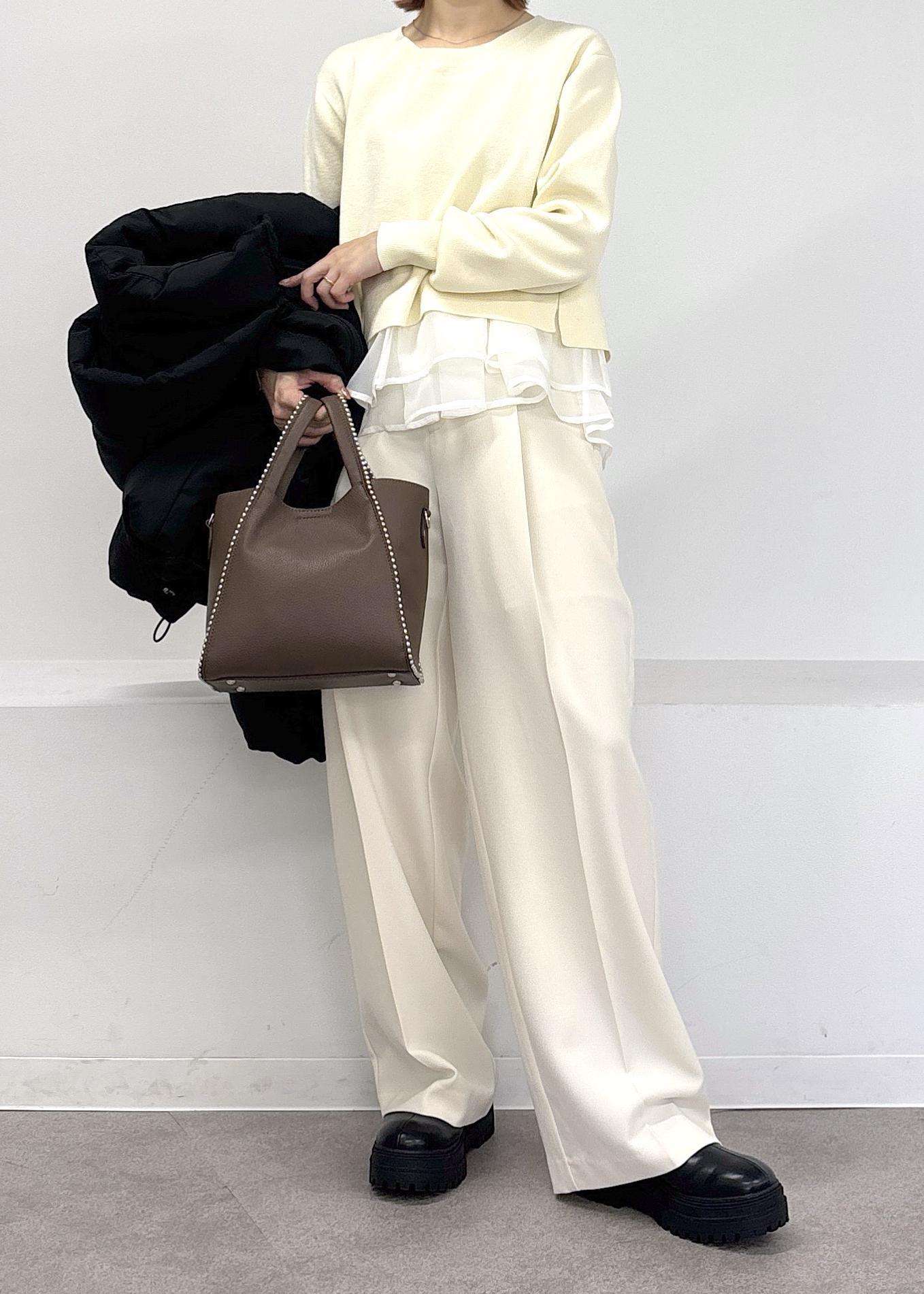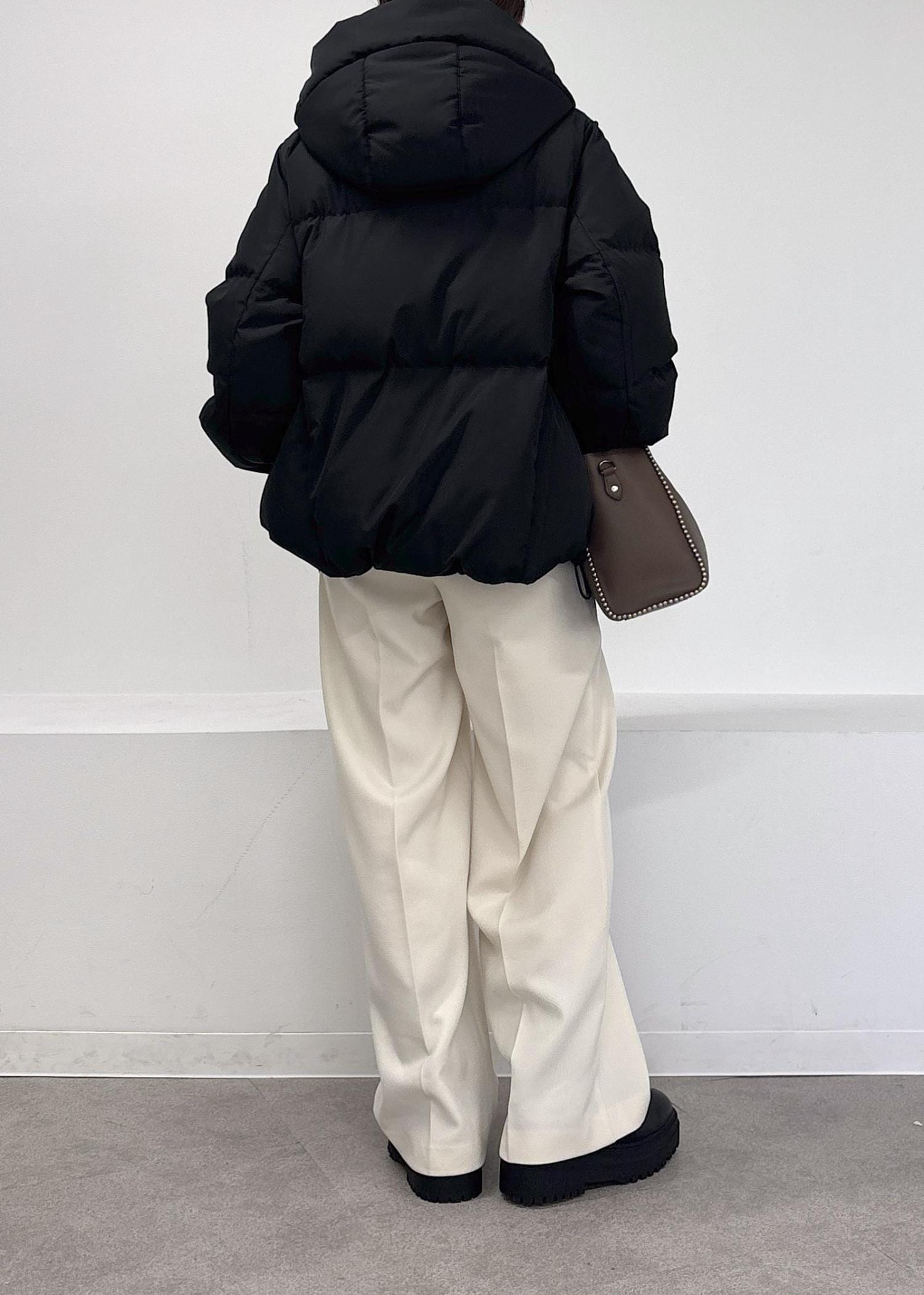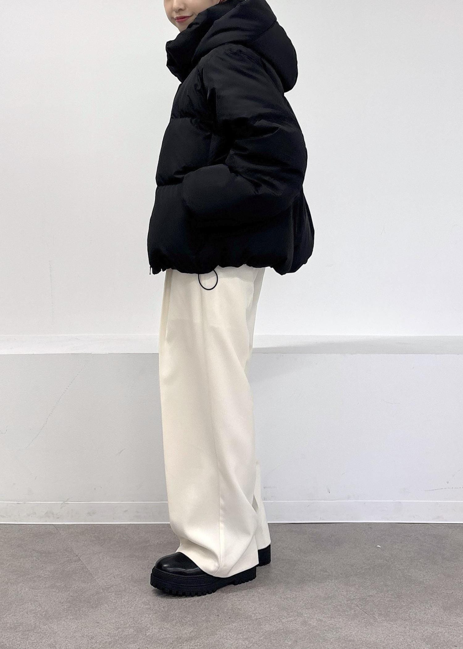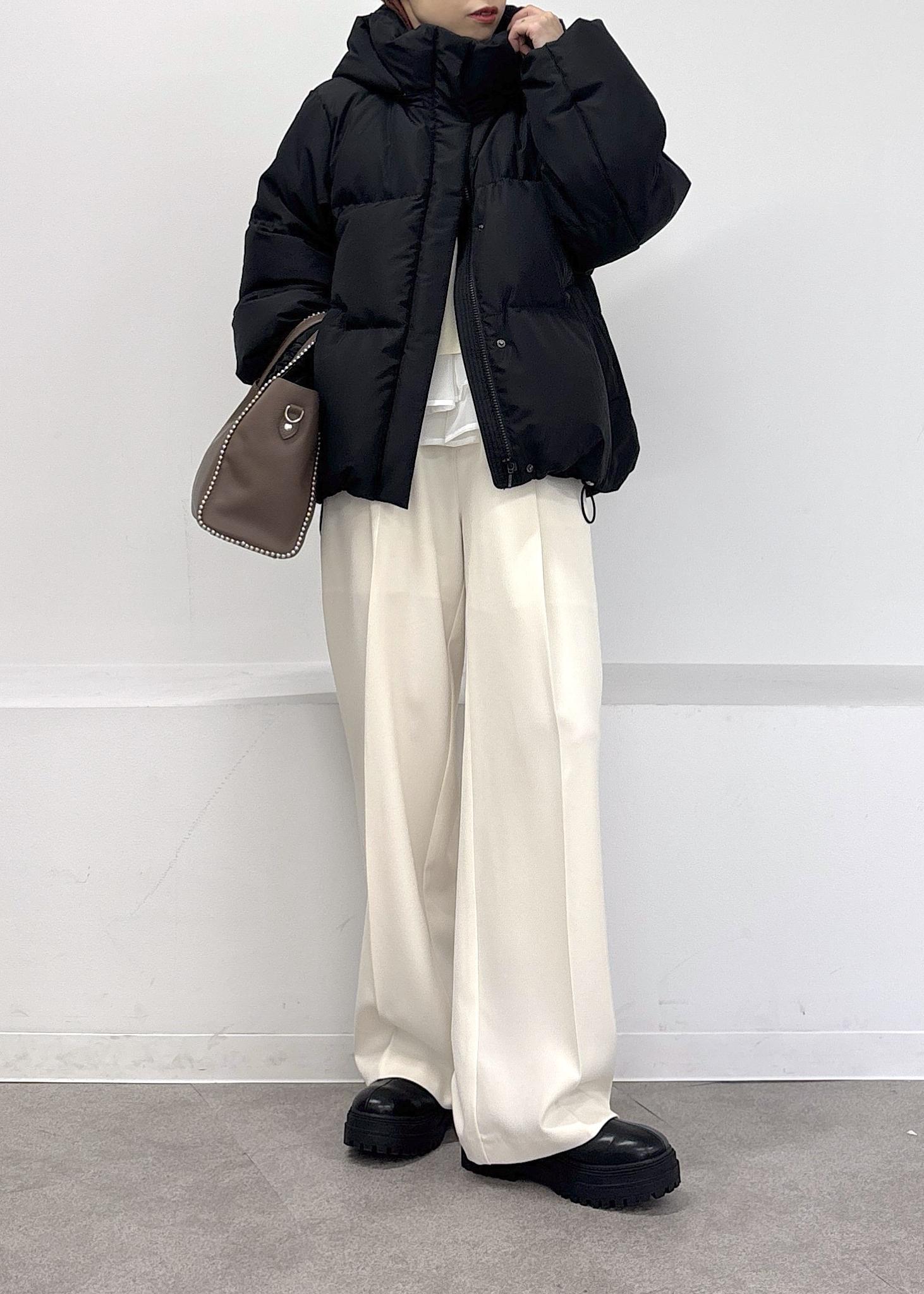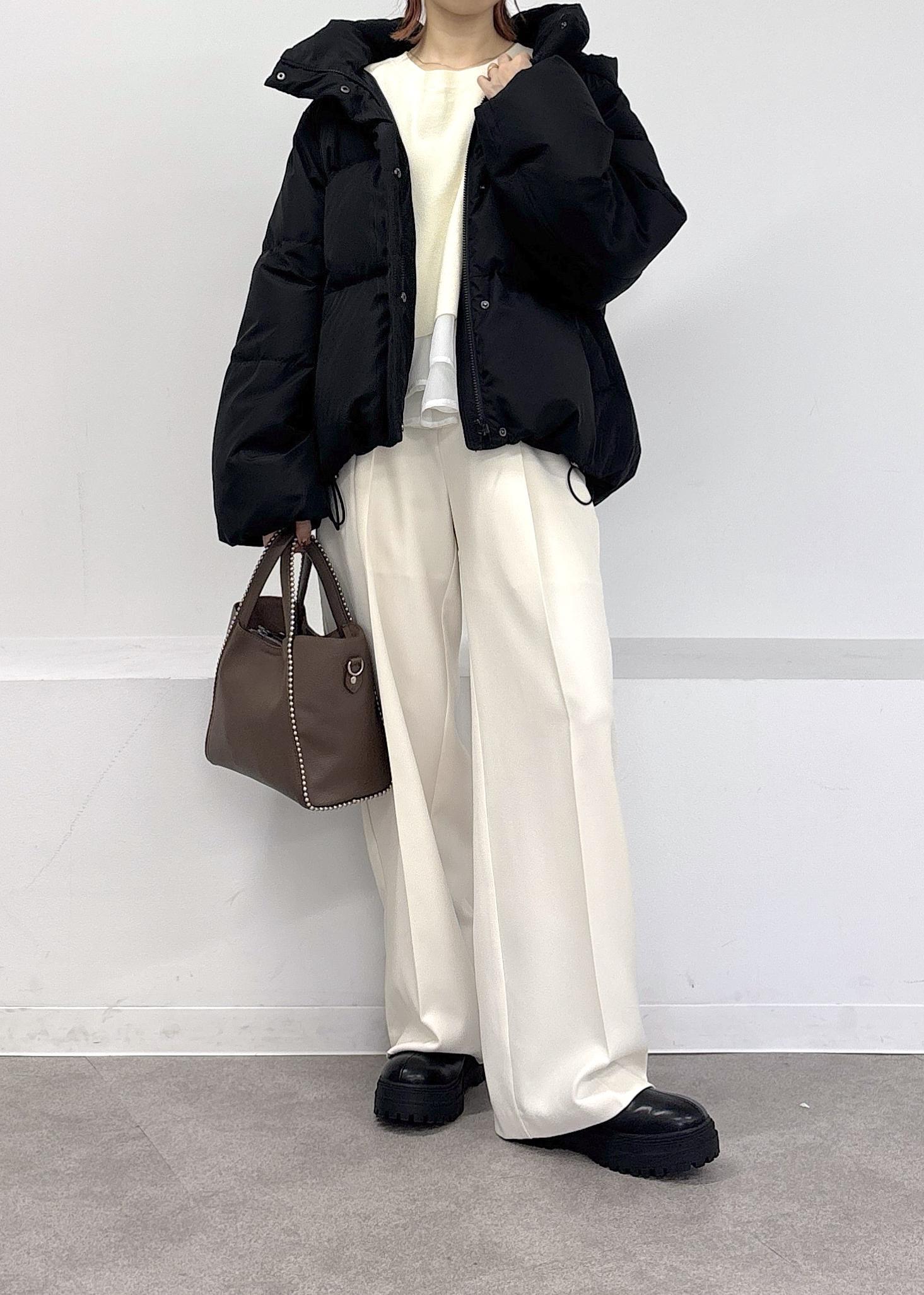 冬の準備にマストなダウンジャケット♪光沢感を抑えたデザインが女性らしいアイテムにもハマる、VISのダウンジャケットは着回し万能です◎今回はニット、パンツとホワイトコーデにブラックのアウターでモノトーンにまとめました◎大人も着やすい冬の大人カジュアルコーデ。