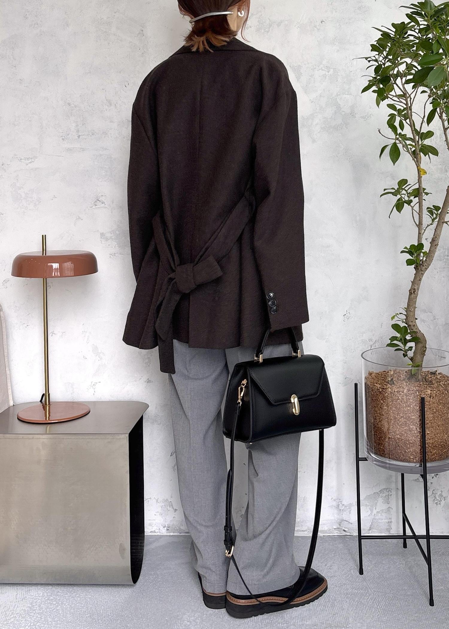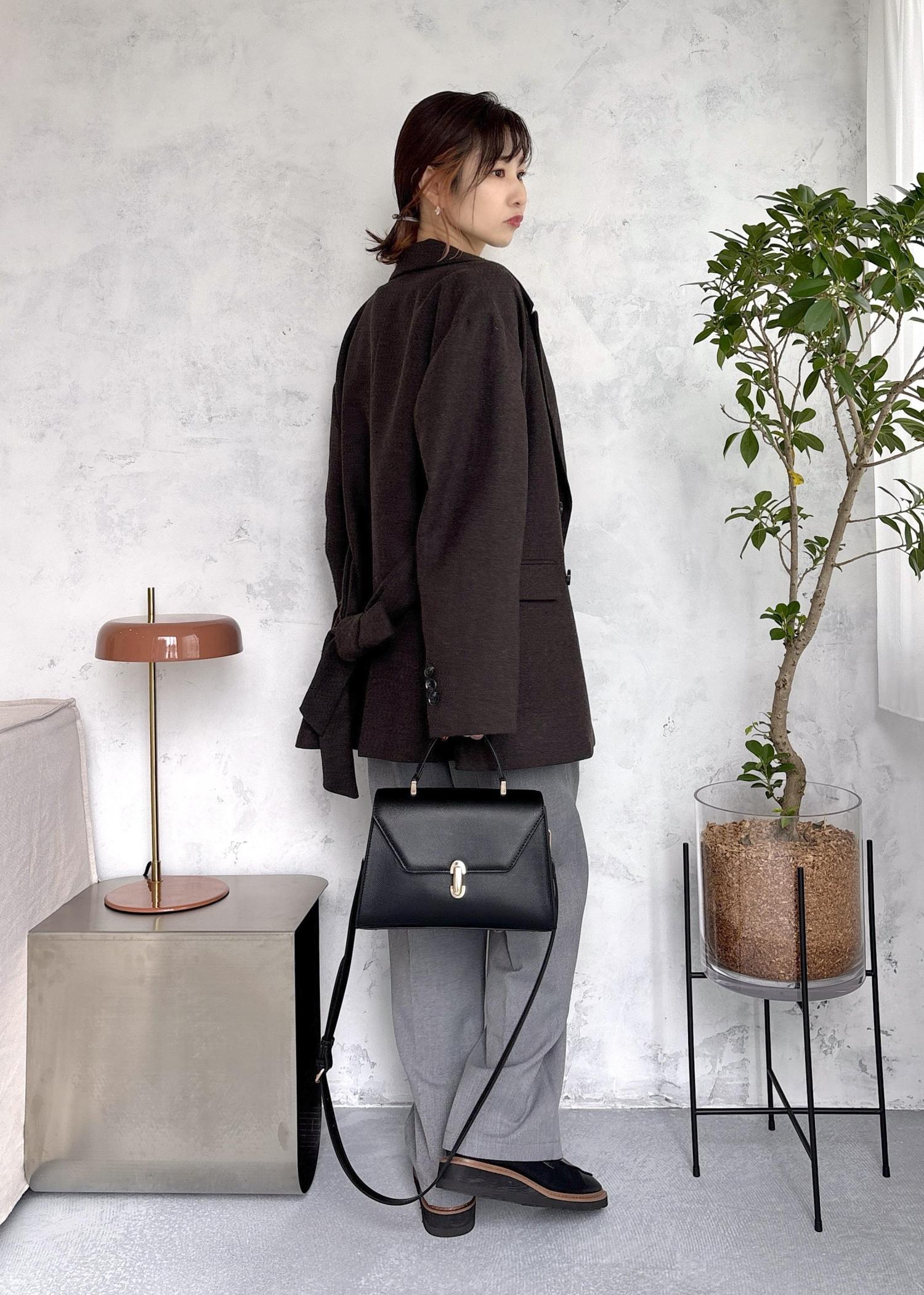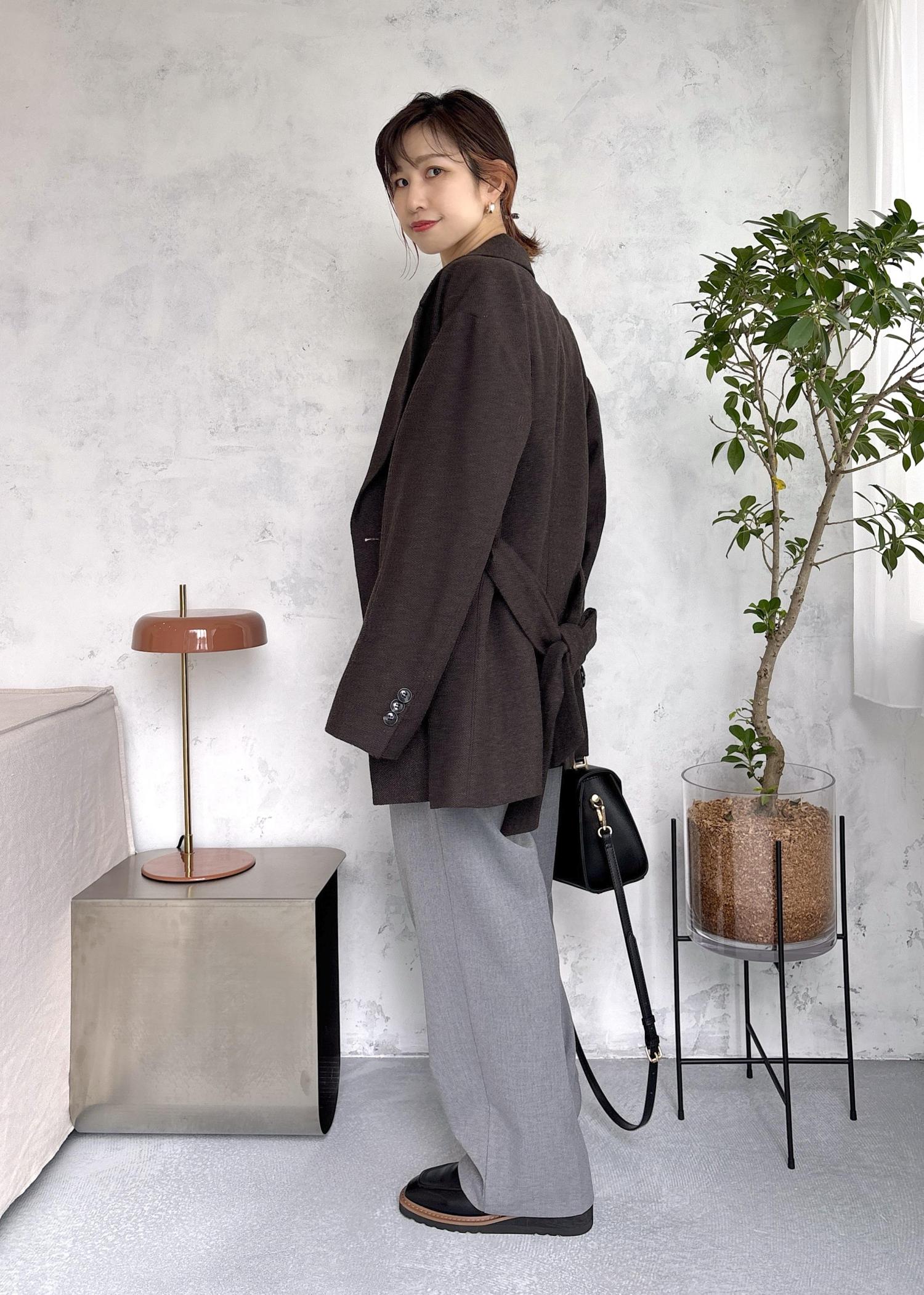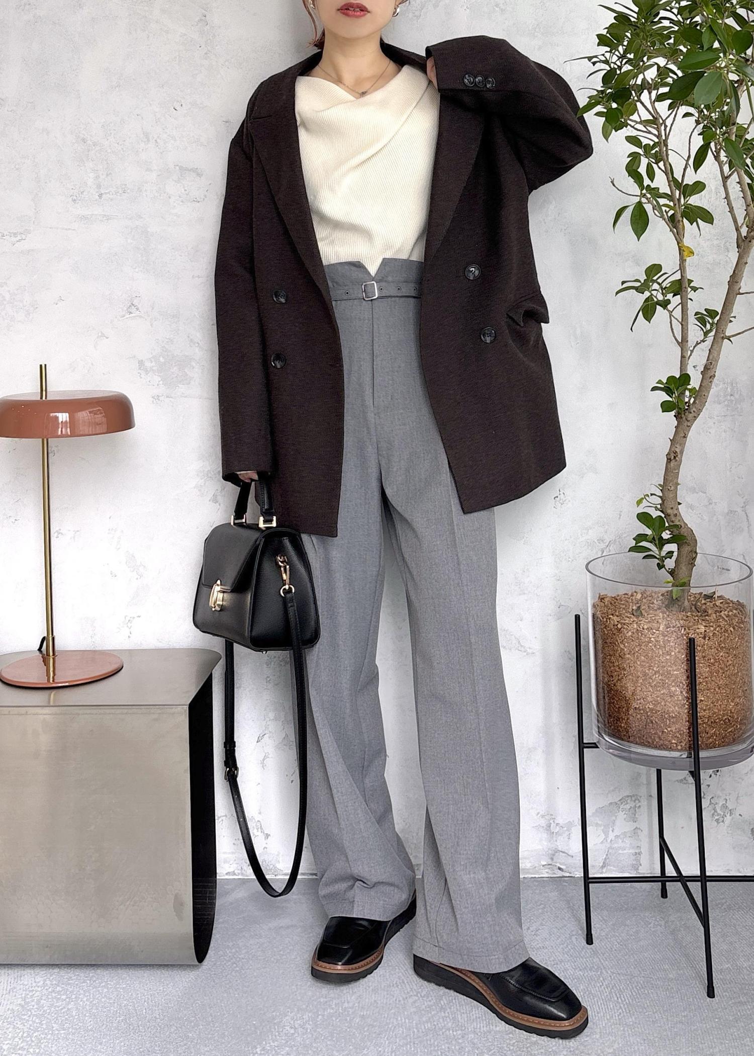 秋のお仕事スタイルにお悩みの方へオススメ!ドレープニットとストレートパンツ、ブラウンのジャケット合わせが今年らしい♪少しずつ肌寒い日も増え、ニットとの合わせも多くなる時期にオーバーシルエットのジャケットはゆったりしていてごわつかず、重ねた時もとても便利◎ドレープニットはシンプルつつ女性らしい印象+ストレートパンツは裏起毛になっていてとても暖かい。小物はブラックでまとめた秋のオフィスカジュアルコーデ。