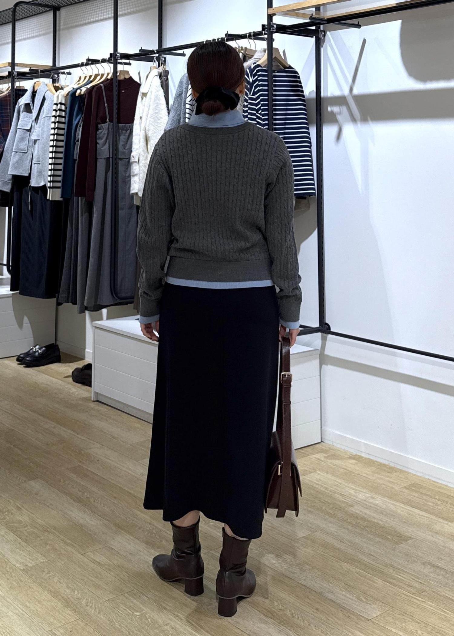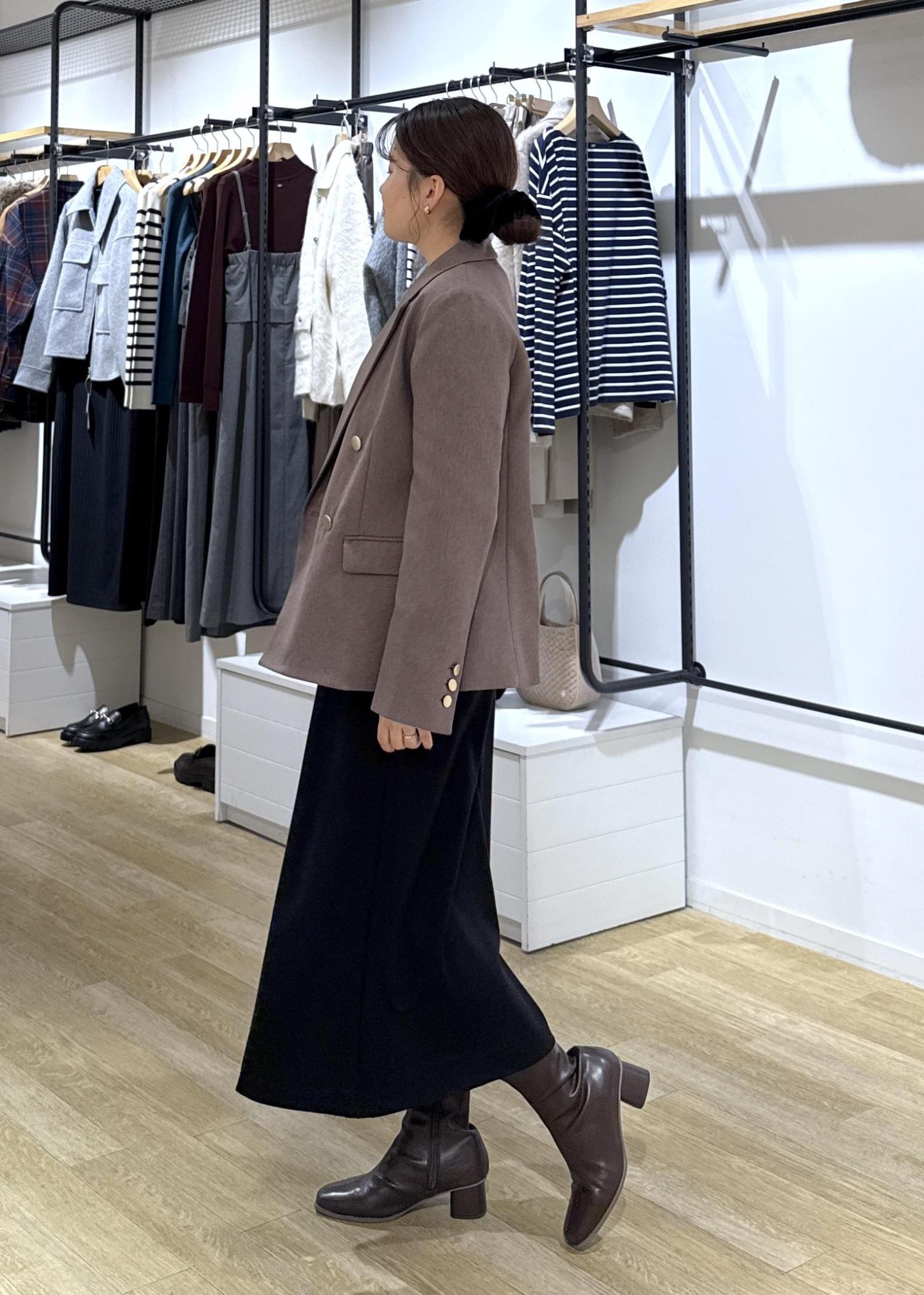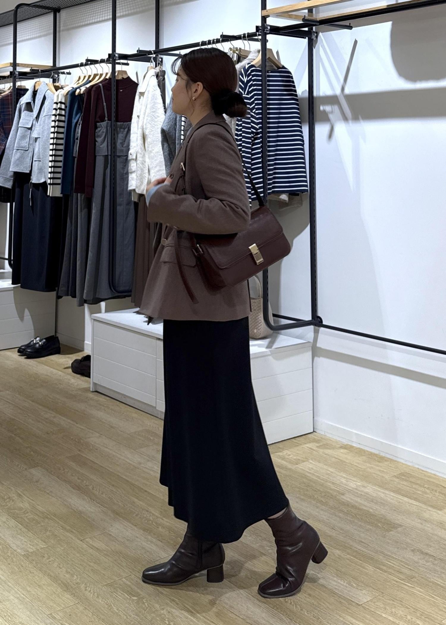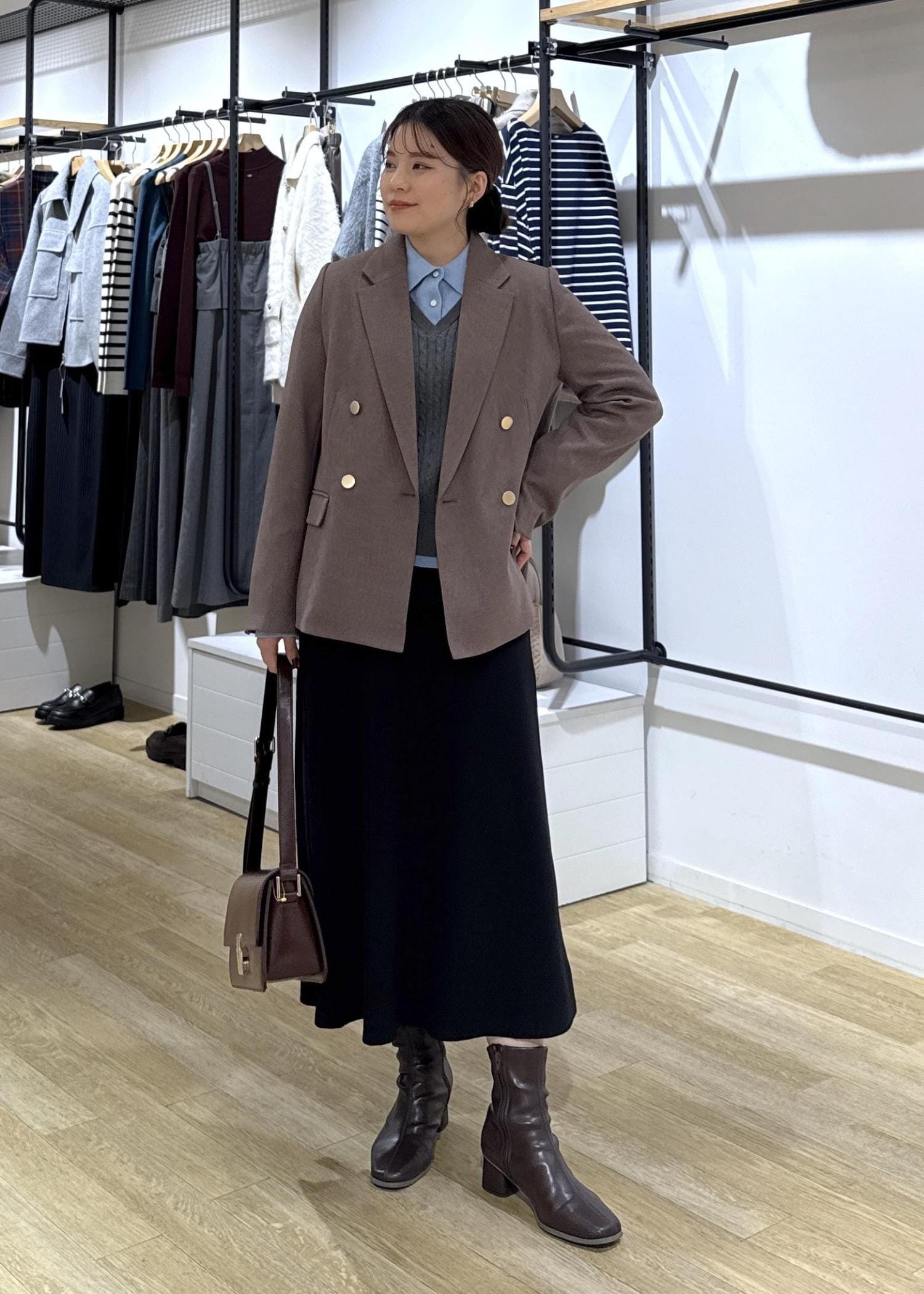 あえてスカートの長さも少し短めのミドル丈で合わせて、より今年らしさをプラスしたところと