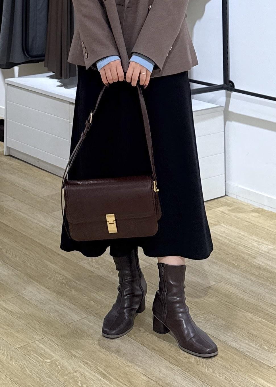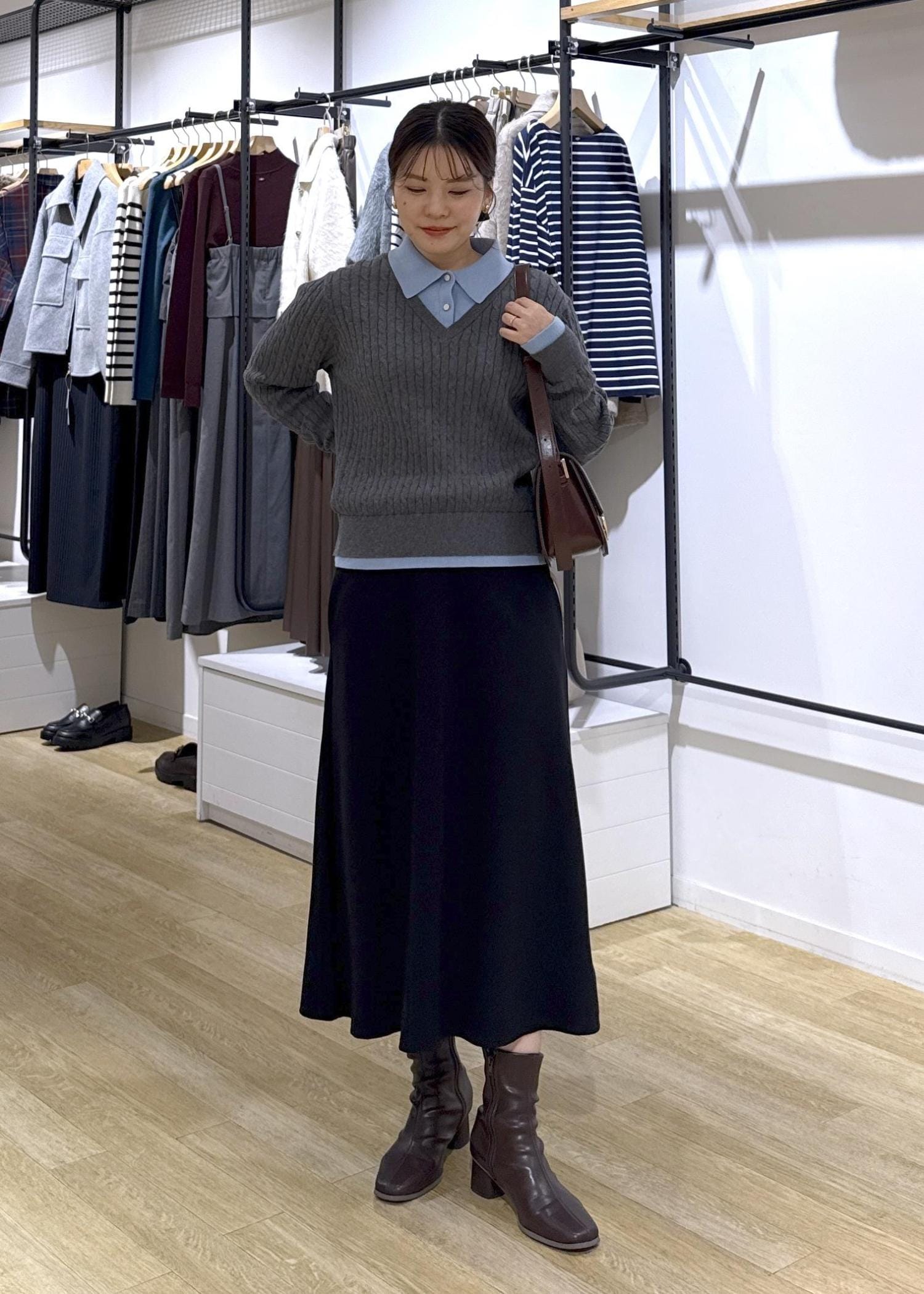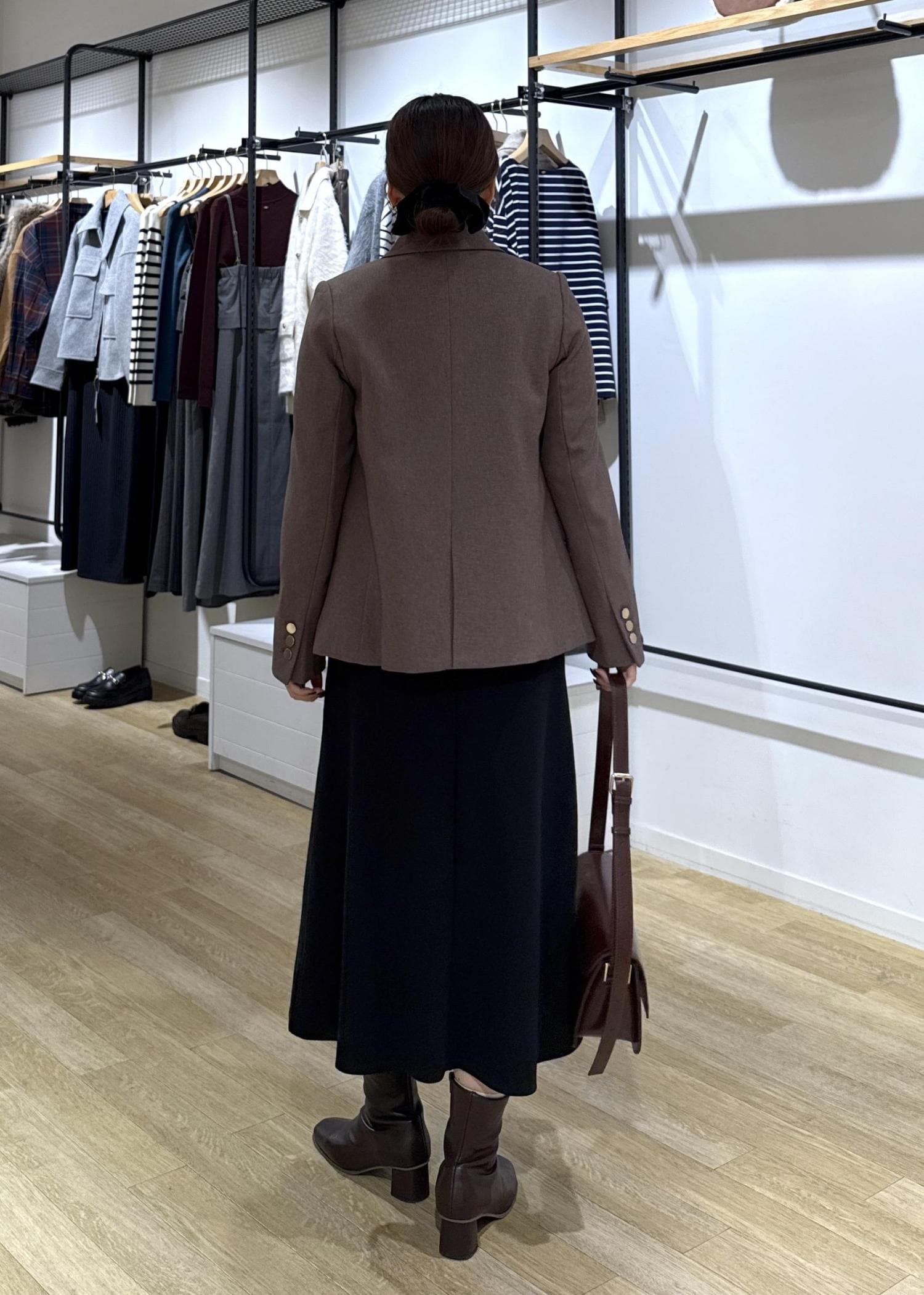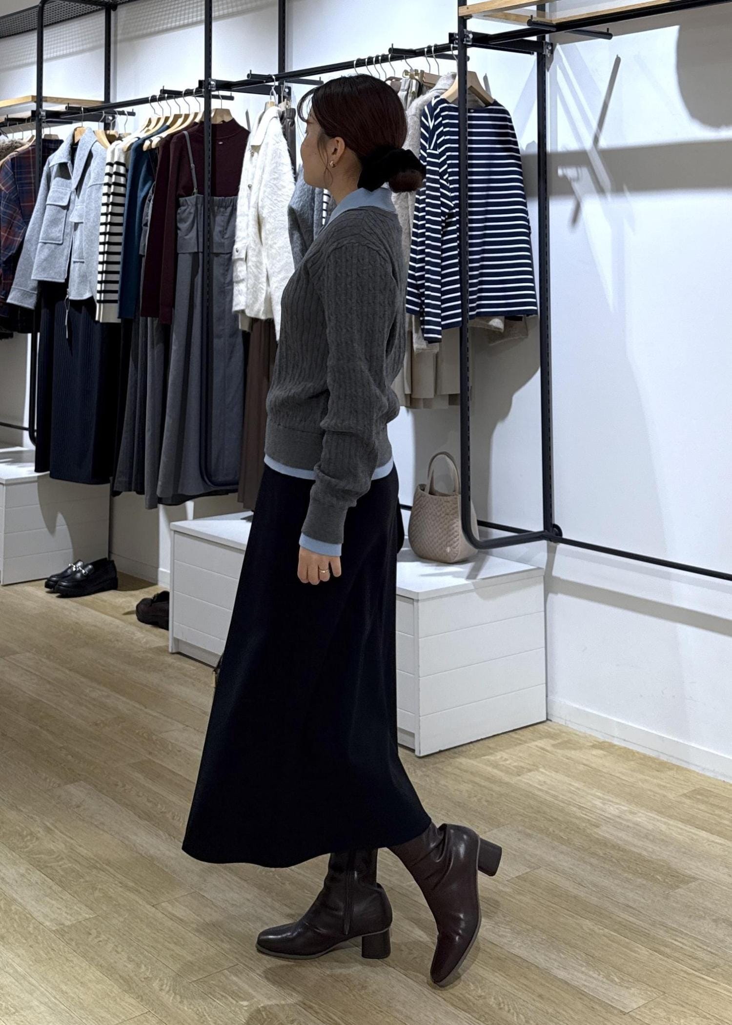 あえてスカートの長さも少し短めのミドル丈で合わせて、より今年らしさをプラスしたところと