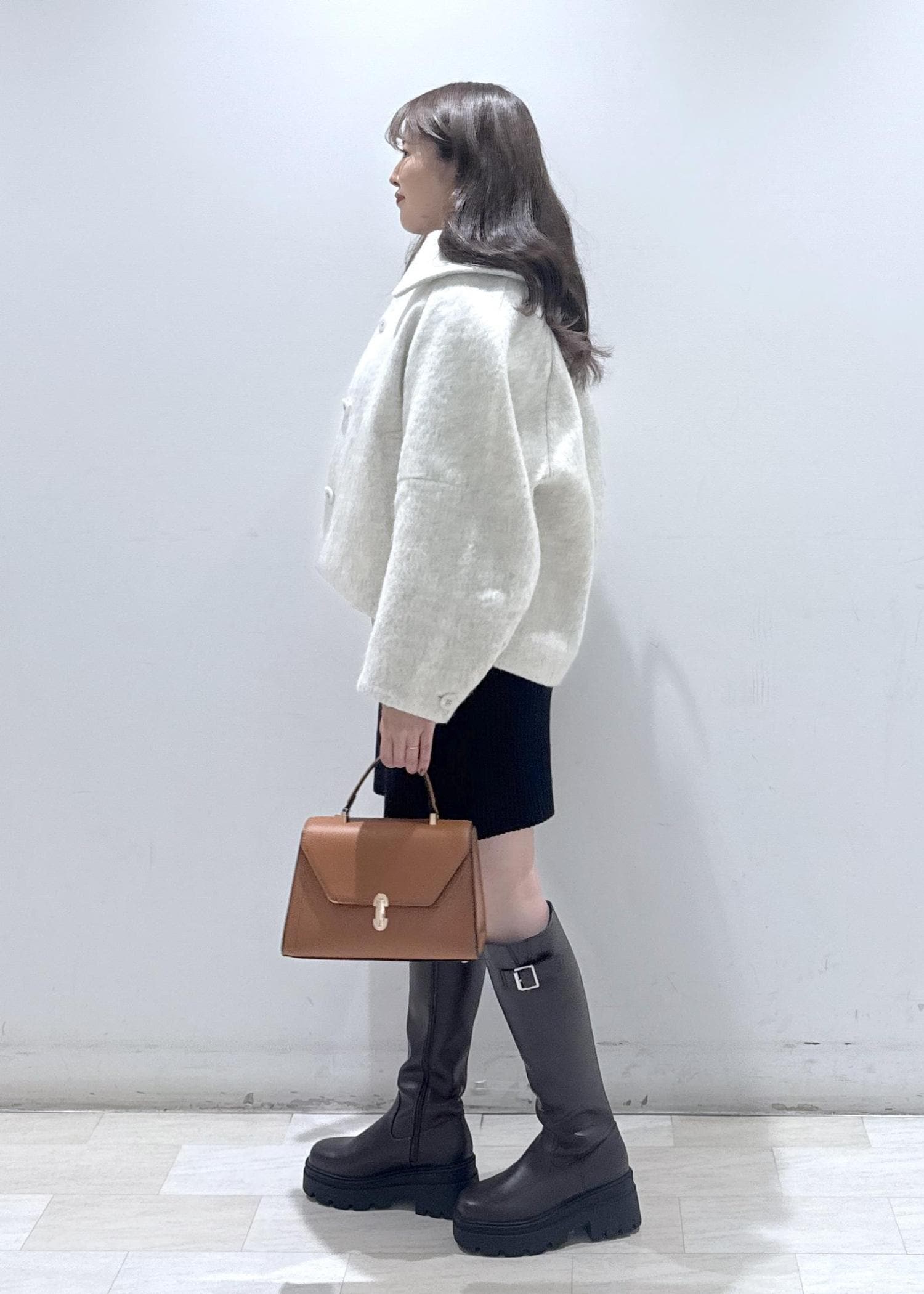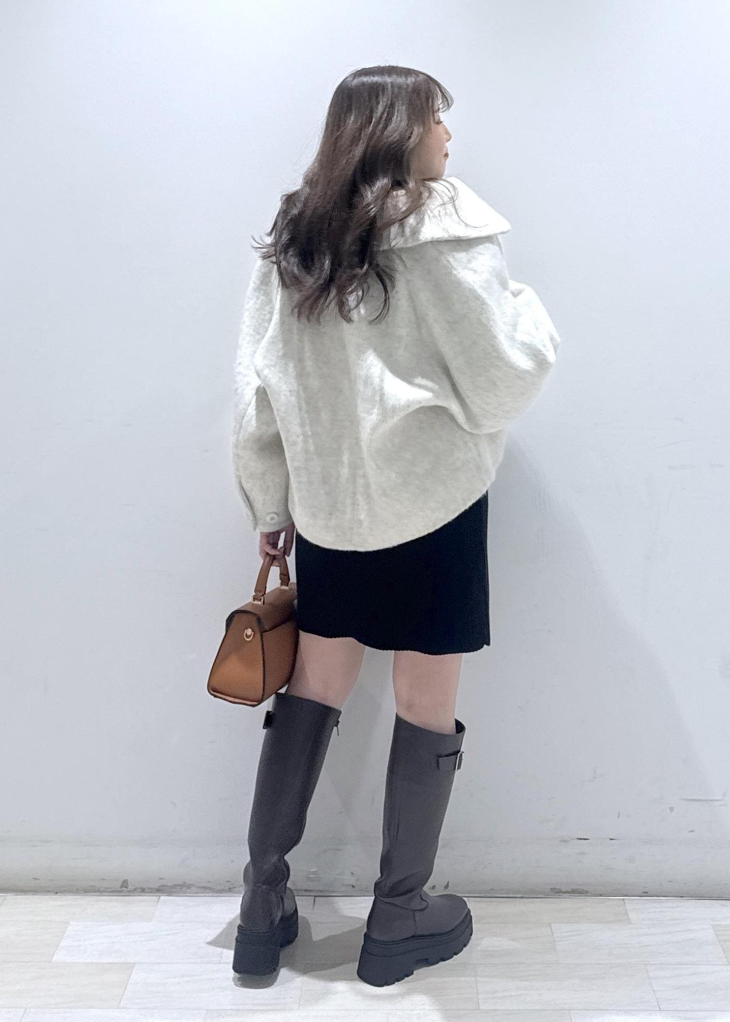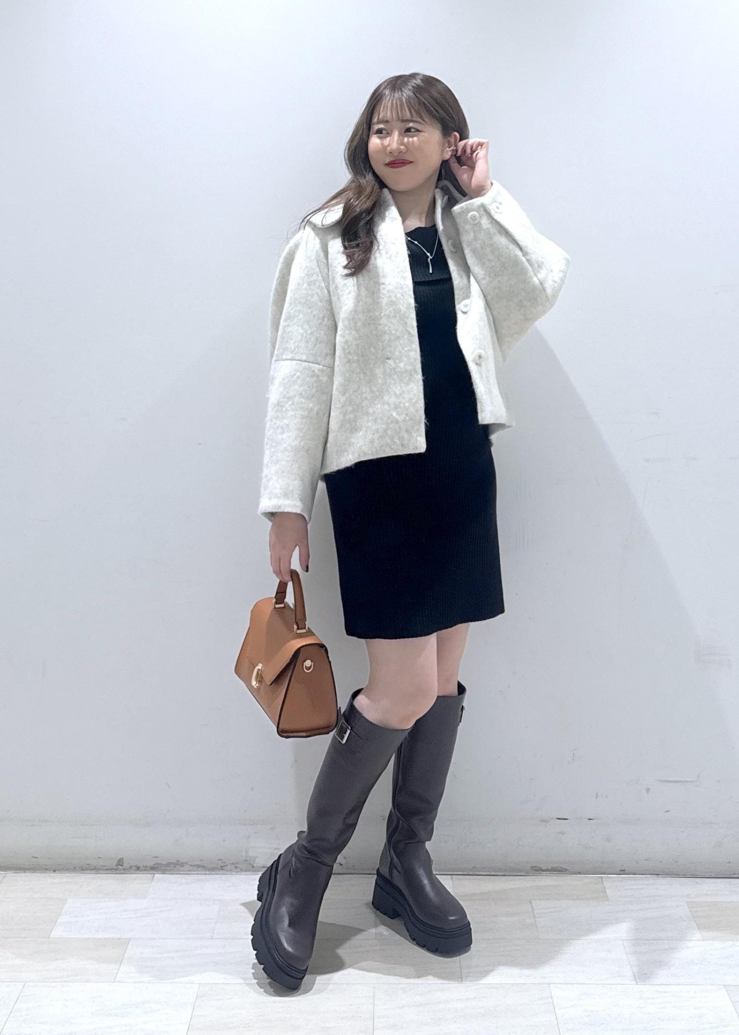 今回はこれからの冬に着れるアウターを着たワンピースコーデです。オーバーサイズのモモンガのシルエットをした白のアウターに、オーソドックスなブラックと合わせて綺麗めに。