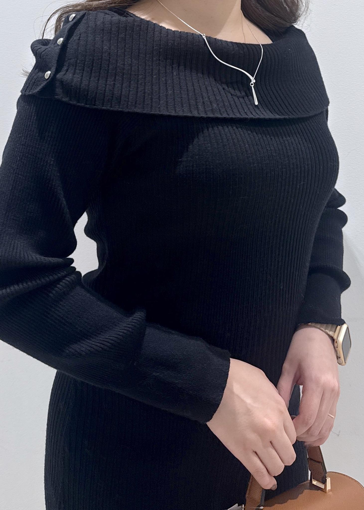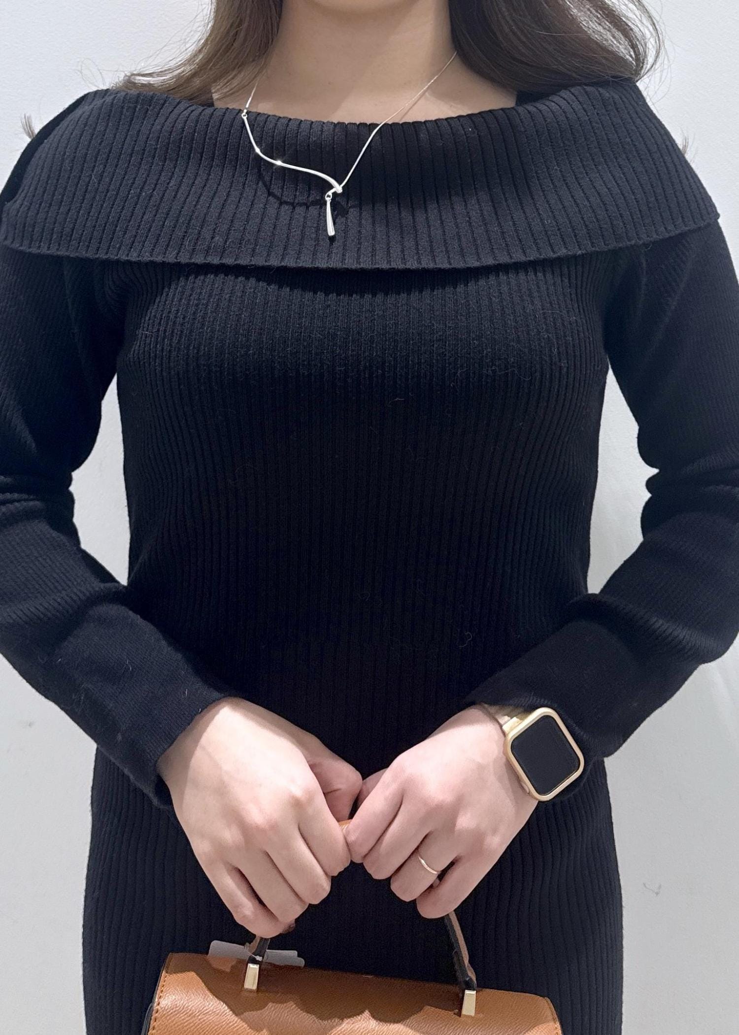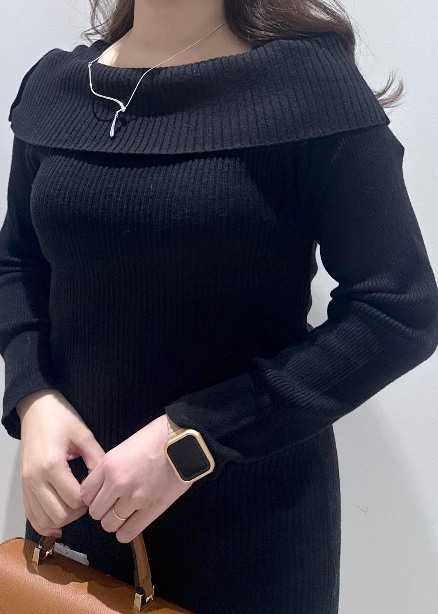 元々Iラインのデザインをしているので、ぜひ骨格ストレートさんの皆さんにオススメしたいワンピースです。見た目がオフショル風なのに、オフショルみたいに肩がズレることも、下着のラインの紐が見えることもないです。程よい女性らしいデコルテラインが見えて、抜け感が出るので綺麗に着こなしができます。タイトめなワンピースなので、グレーのカラーだとお腹周りの透け感がやや気になる印象。下にガードルを履けば問題無し。ブラックは避けにくく、大人っぽくも着こなせるので個人的に好きでした。 -