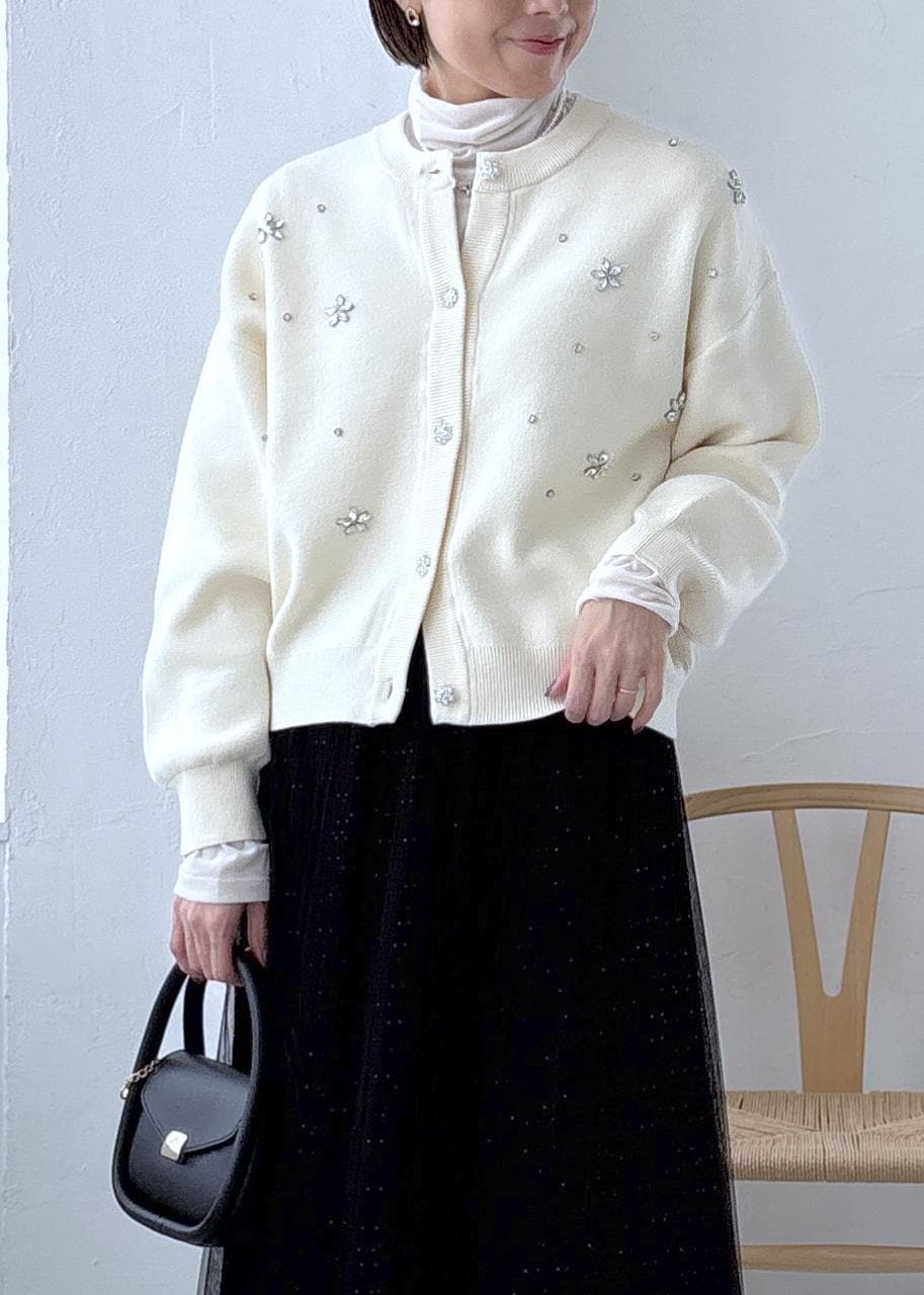 ビジューがコーディネートの主役になってくれるカーディガンです♪ -