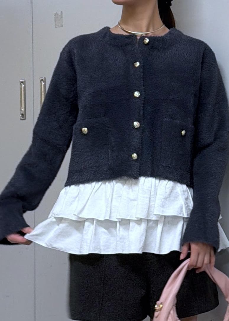 VIS接結ミニフェザーニットジャケットカーディガン/一部WEB限定カラーネイビー / F¥6,919レビュー思わず触りたくなってしまうようなカーディガンになっています!167cmの身長で丈は少し短く感じたのですが、中にブラウスなど入れていただければ気にならないくらいです◎