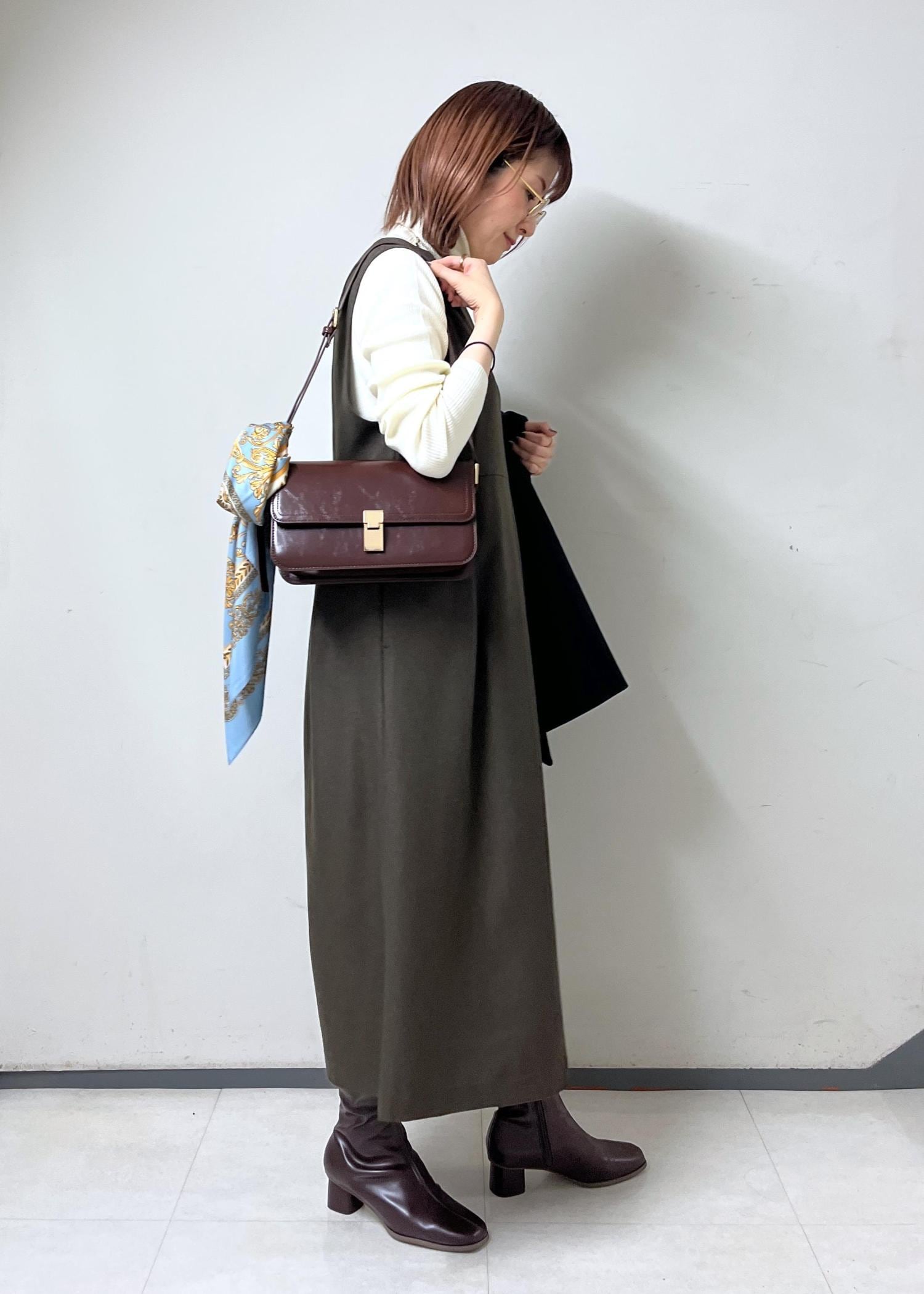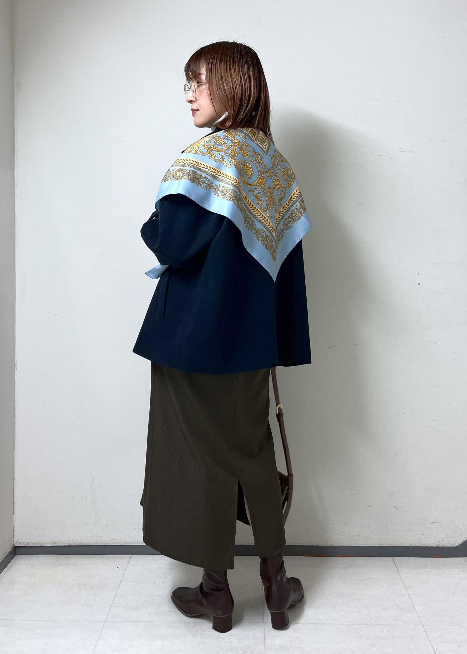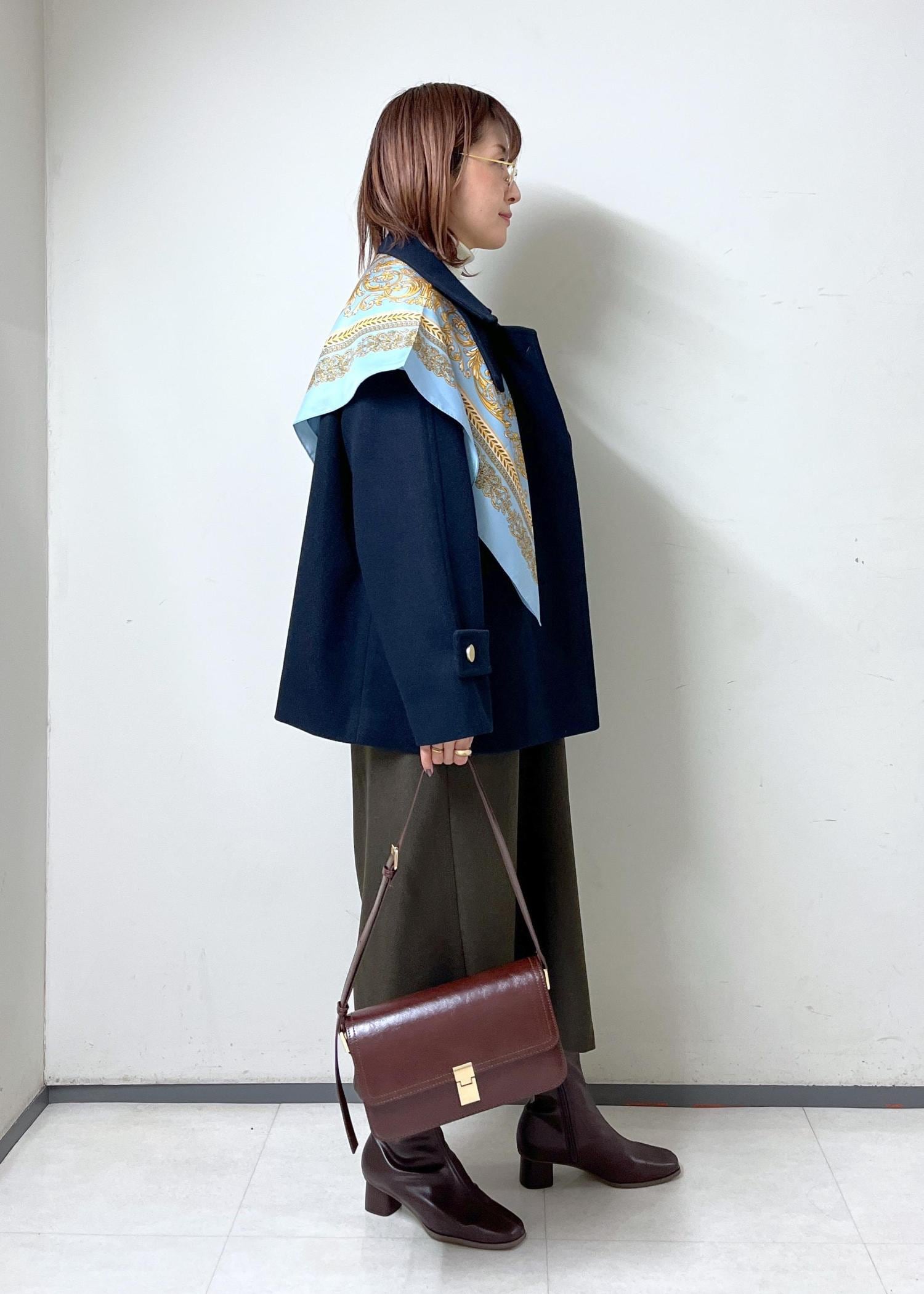 スカーフの柄を引き立てるように、他のアイテムは無地でシンプルにしました☺︎