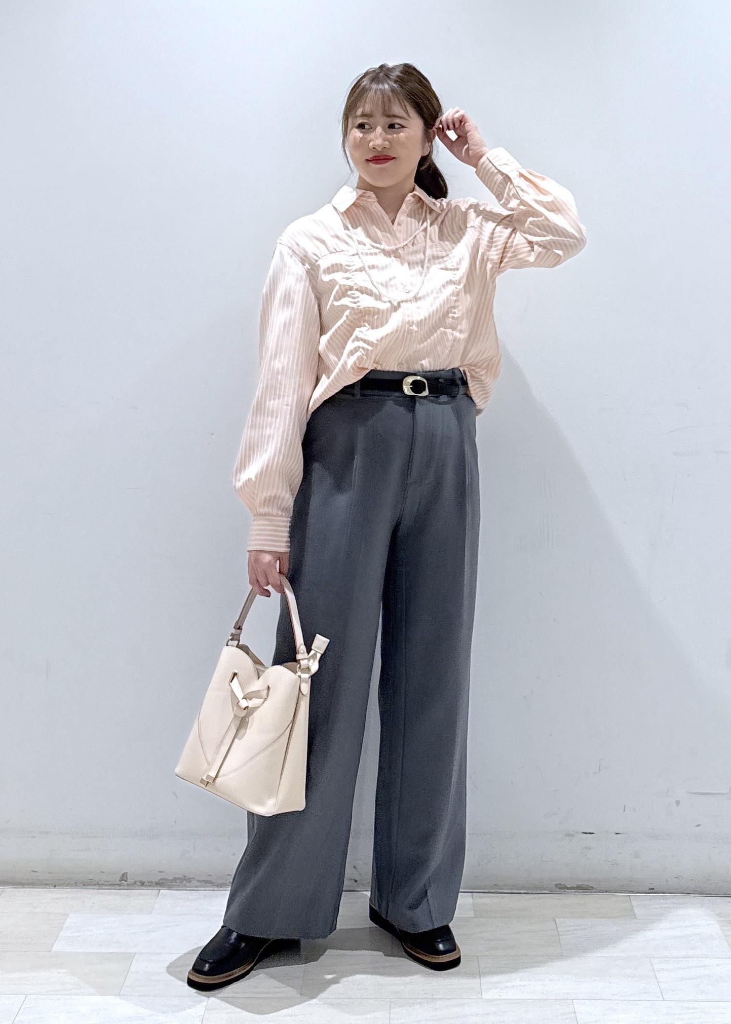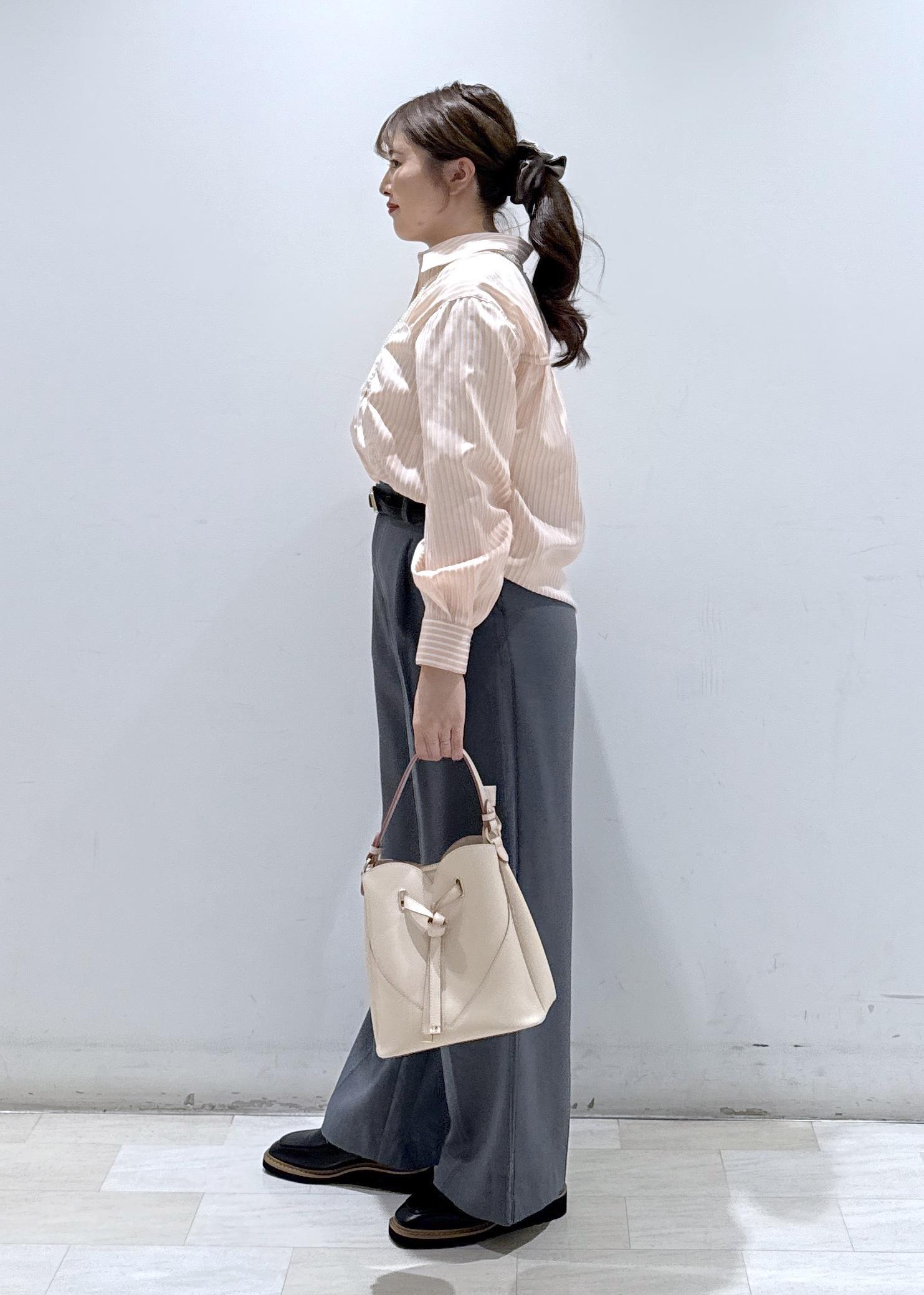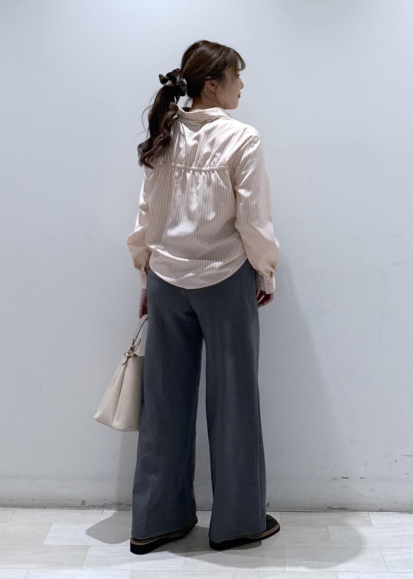 今回は新作で入荷しました胸元にシャーリングギャザーが入ったストライプのシャツに、VISで一番人気のワイドパンツと合わせて綺麗めなコーディネートにしてみました。