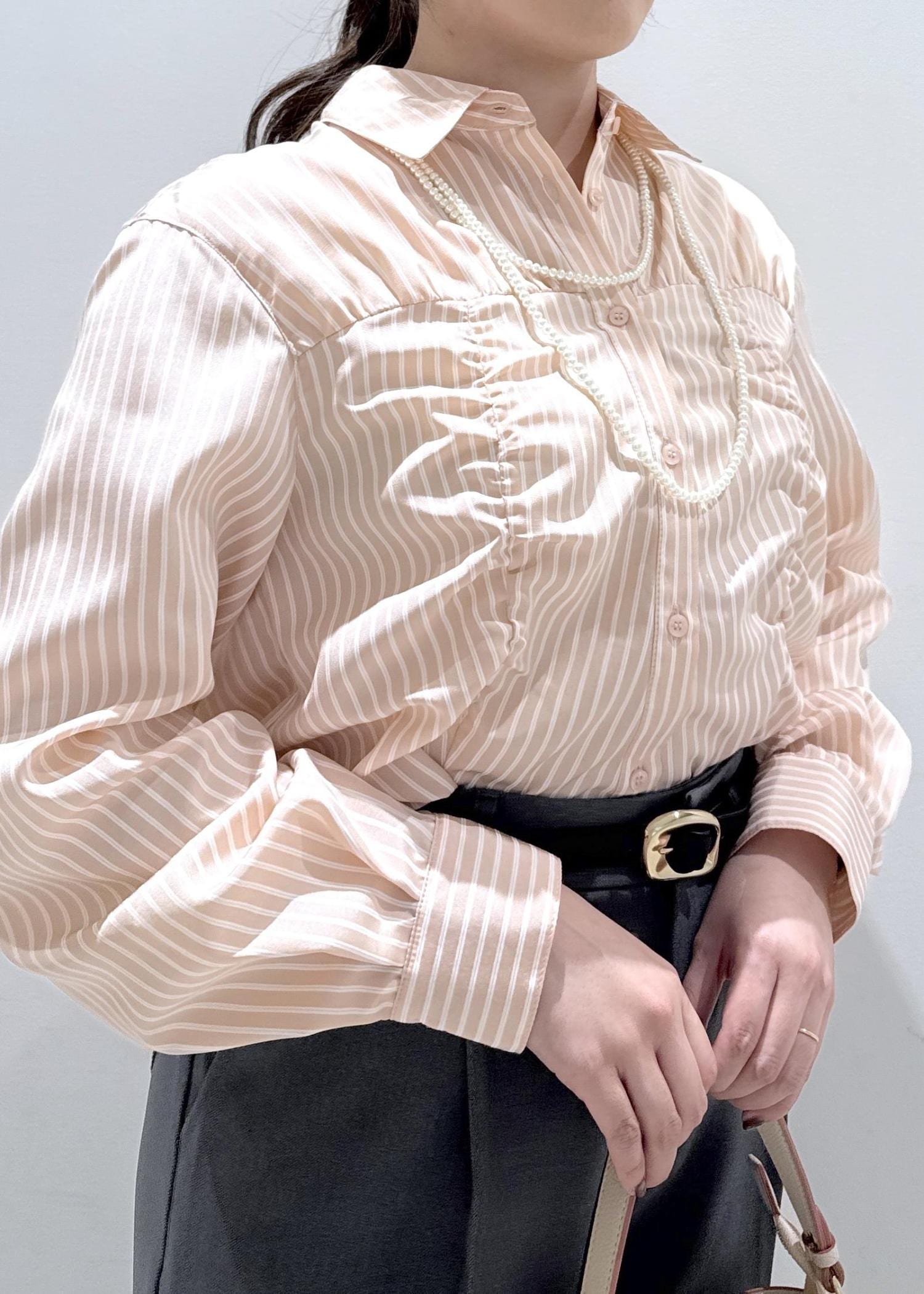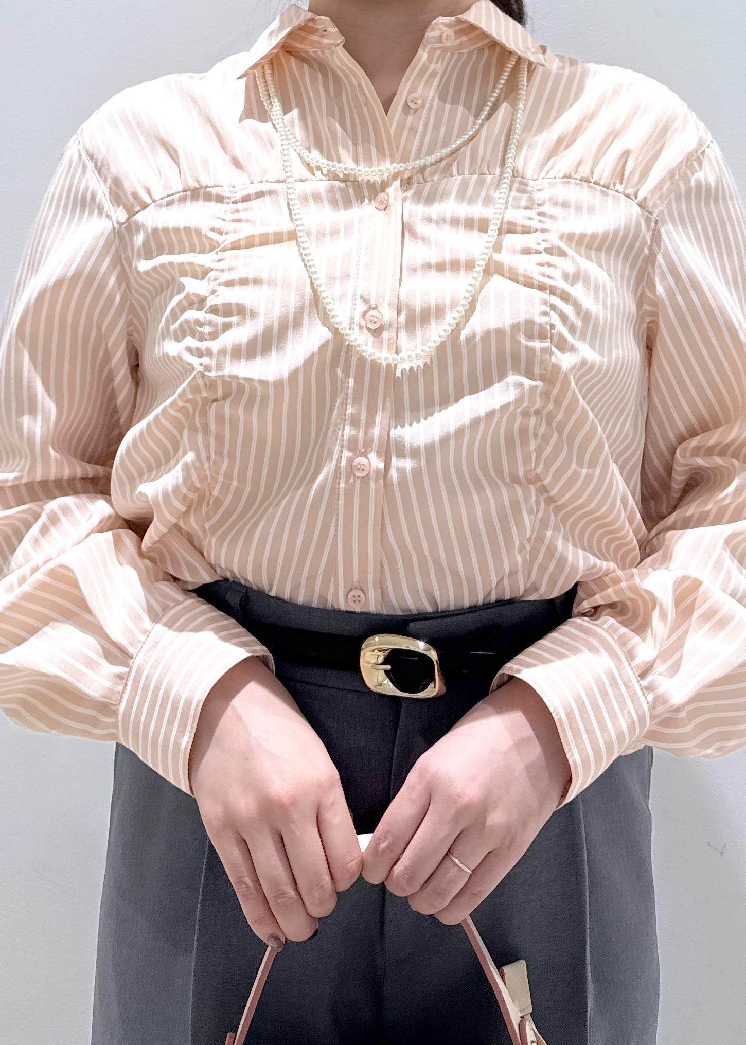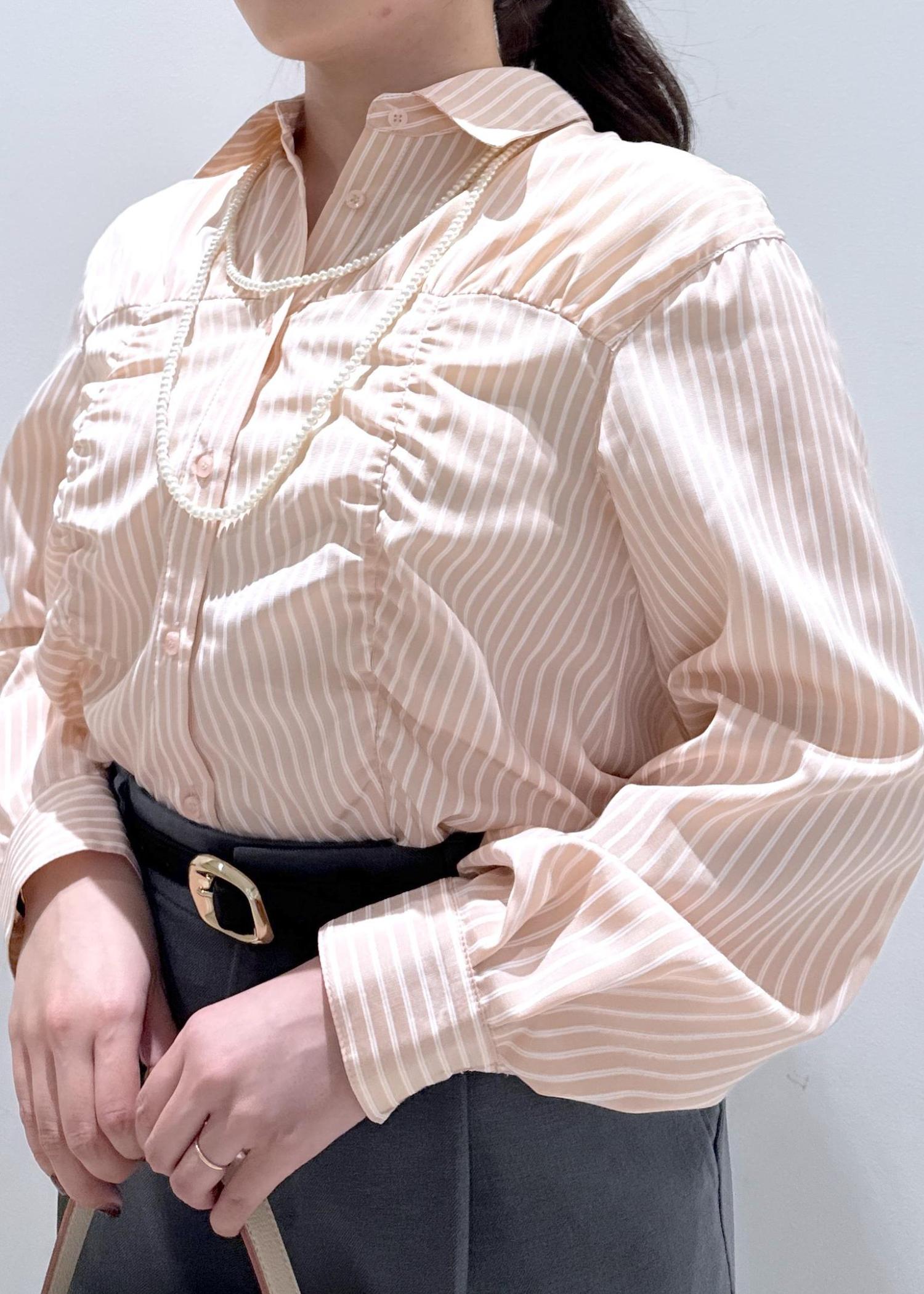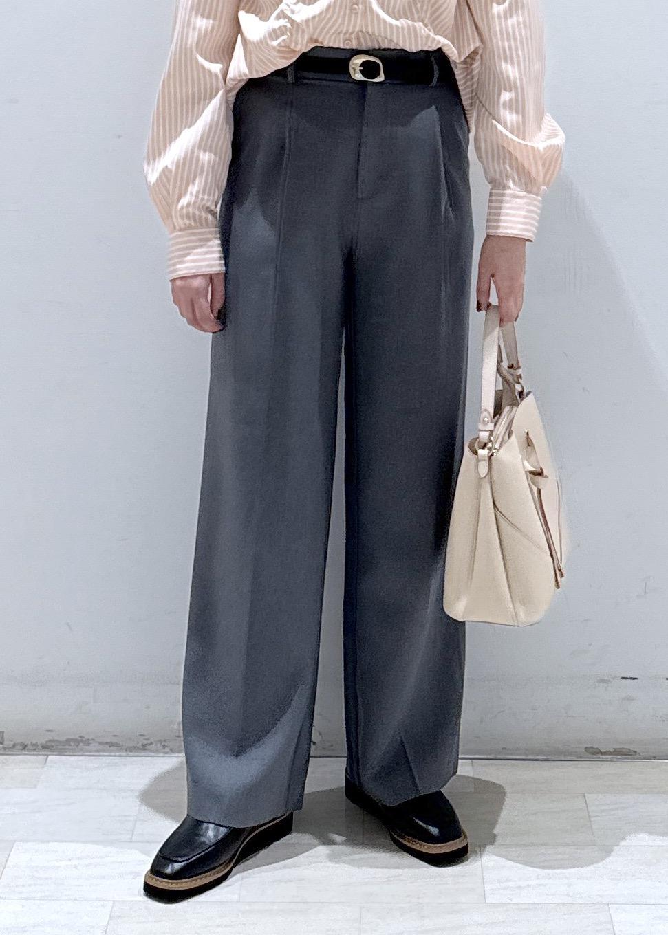 今回は新作で入荷しました胸元にシャーリングギャザーが入ったストライプのシャツに、VISで一番人気のワイドパンツと合わせて綺麗めなコーディネートにしてみました。