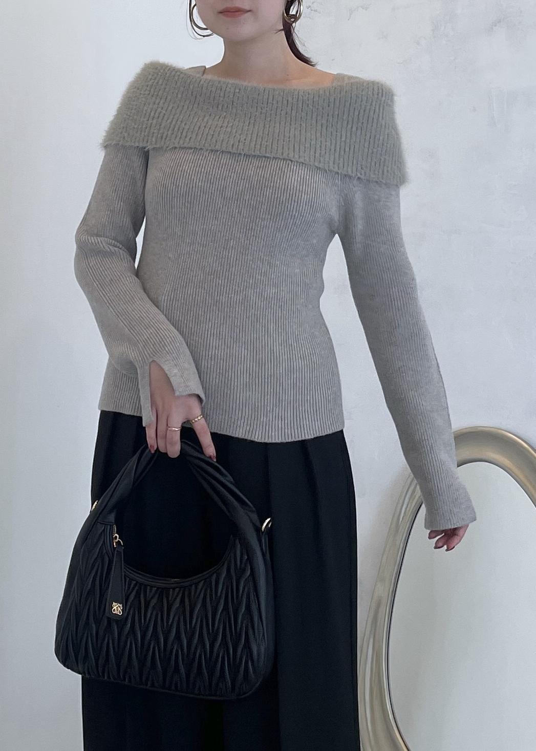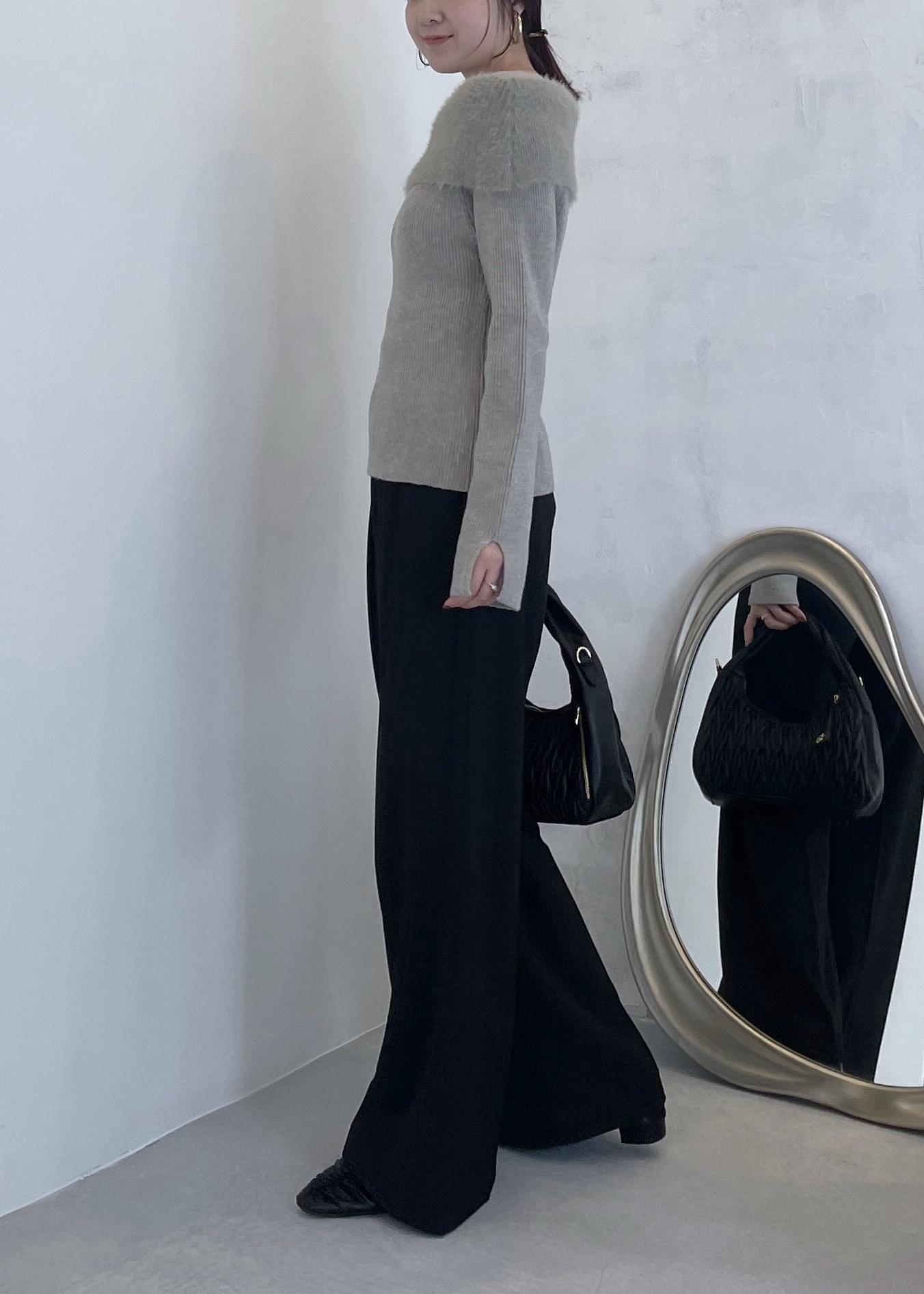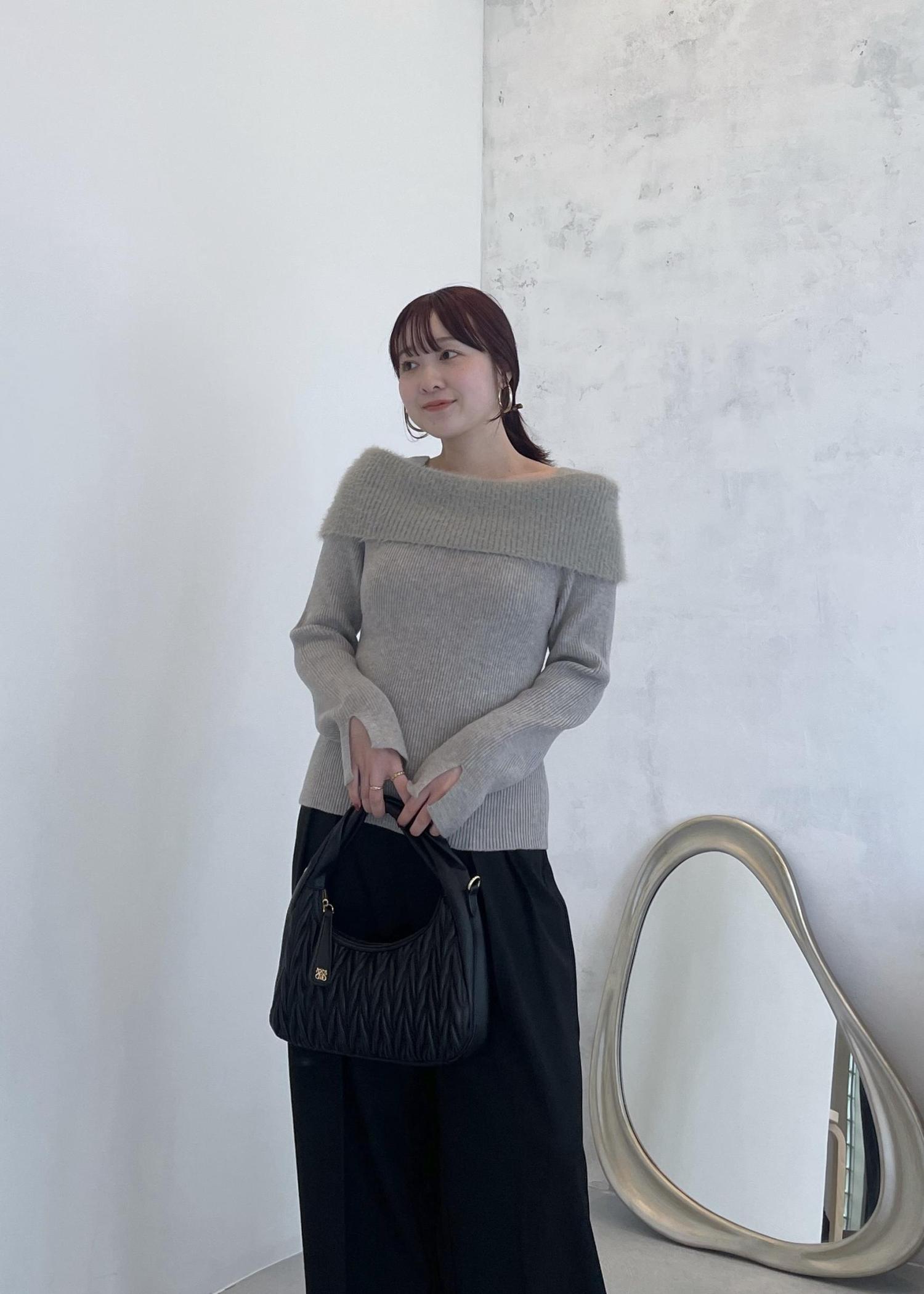 VISフェザーヤーンオフショルもちもちリブニット/イージーケアライトグレー / F¥5,929レビュー1枚で大人可愛いオフショルニット♡程よいボリューム感のフェザーヤーン、華やかさと上品さをプラスしてくれます!程よいフィット感はありますが、ボディラインを拾いすぎないです。首元はデコルテが覗くので華奢見え+ヘルシーな女性らしさも◎