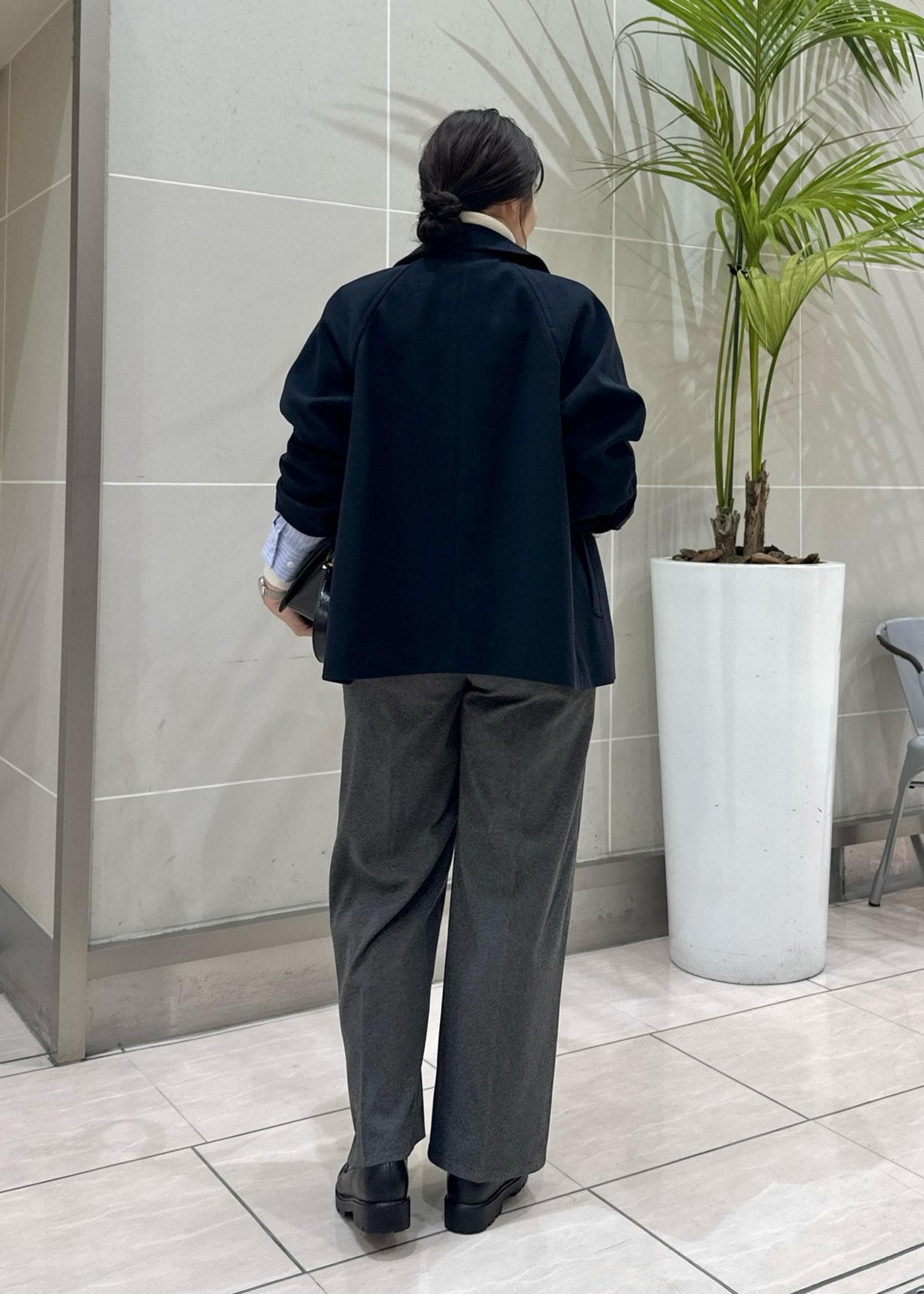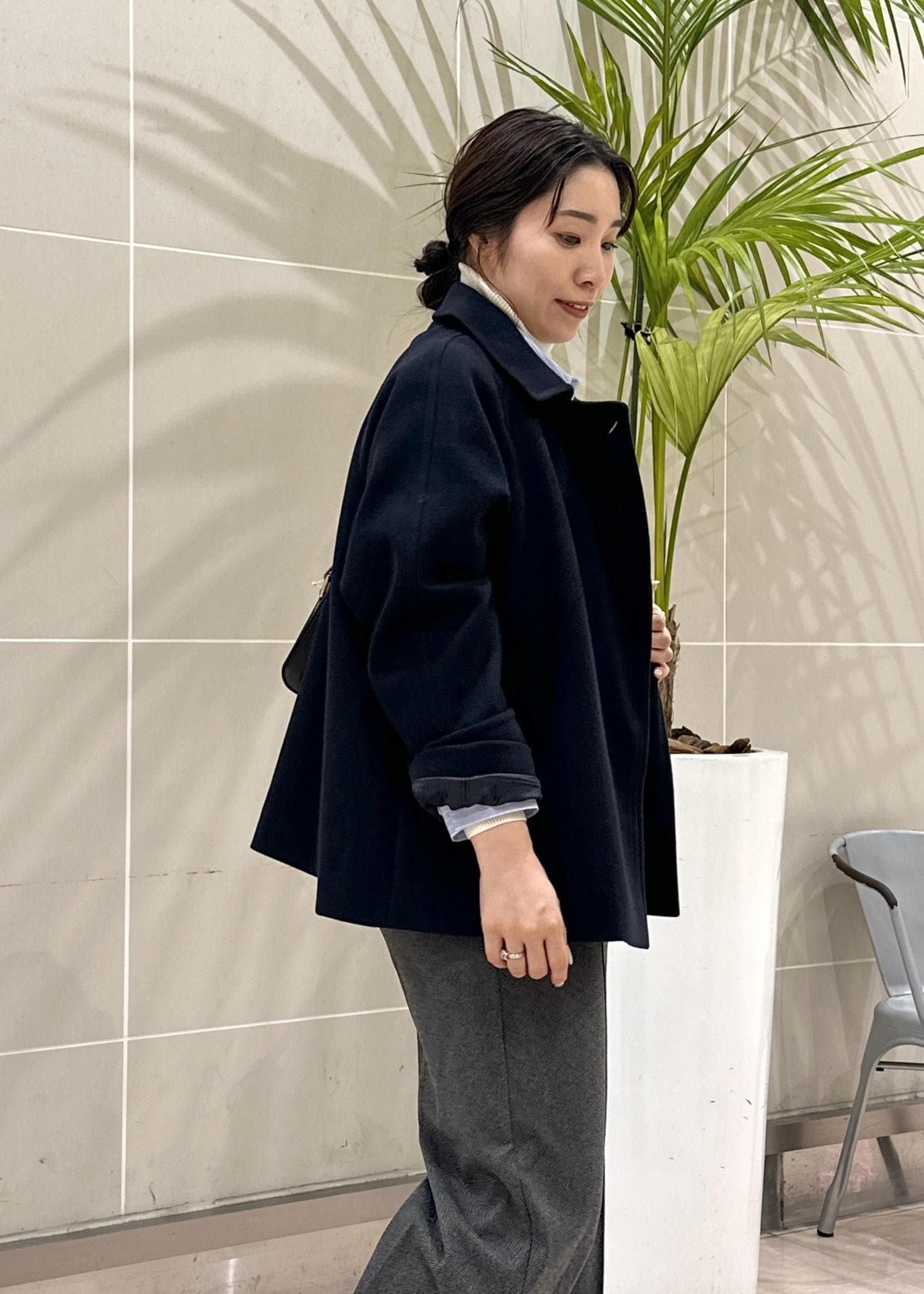 ミドル丈でゆったりシルエットのコートなので体型カバーにもなります。