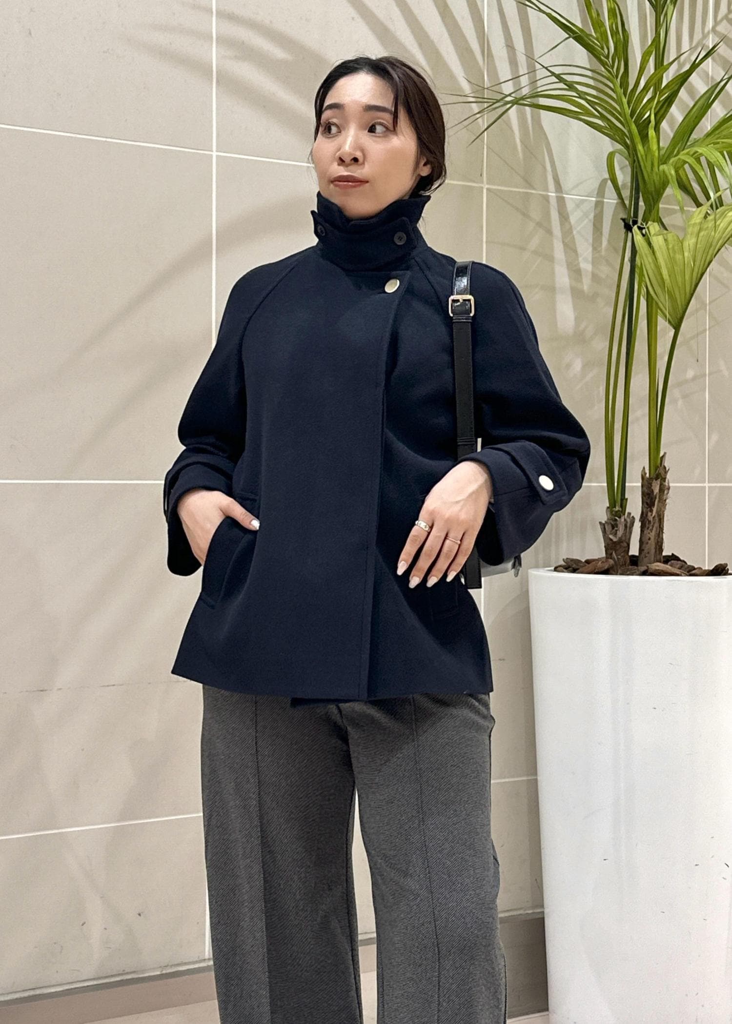 襟は2way仕様になっていてスタンドカラーにもなるのでマフラー要らずで着用出来る優れもの。