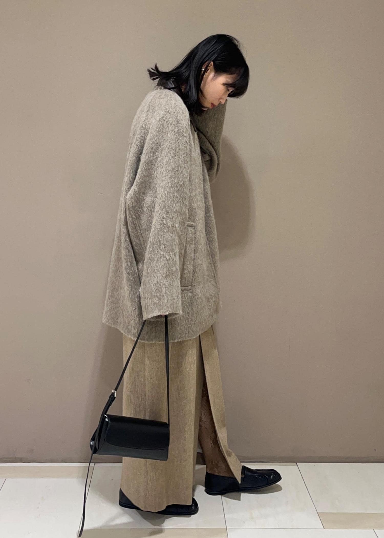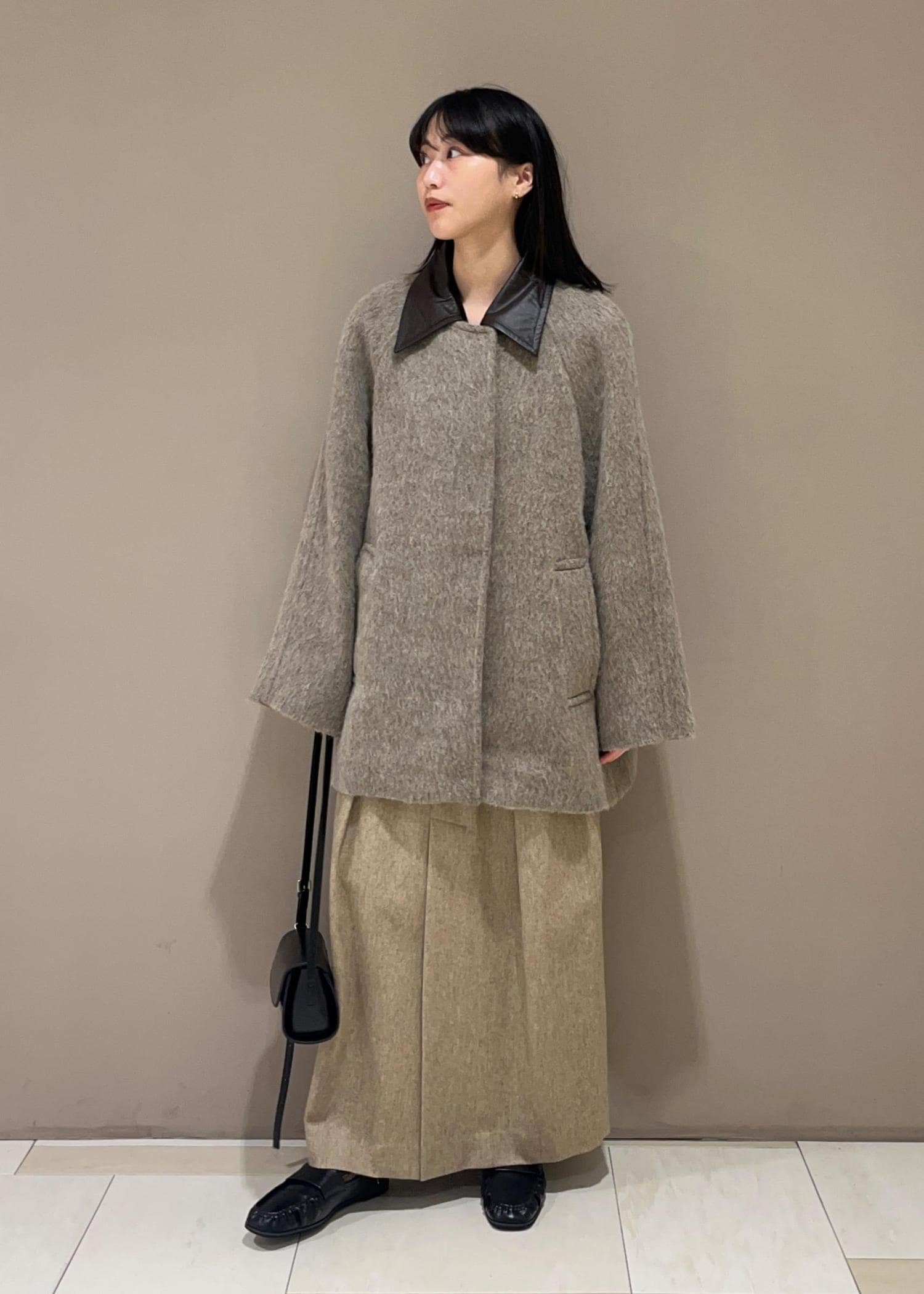本日は【EMOELLE】レザーカラーミドルコートを着用いたしました。