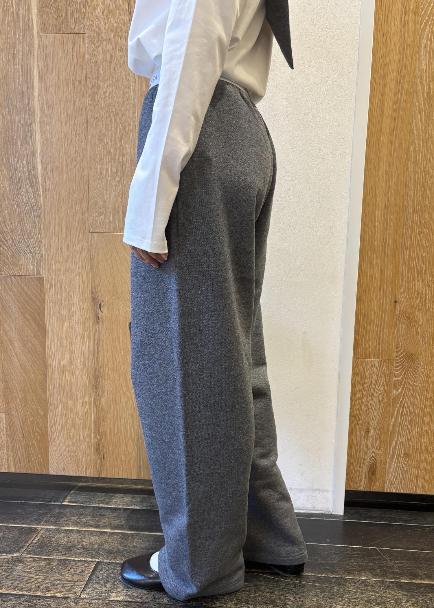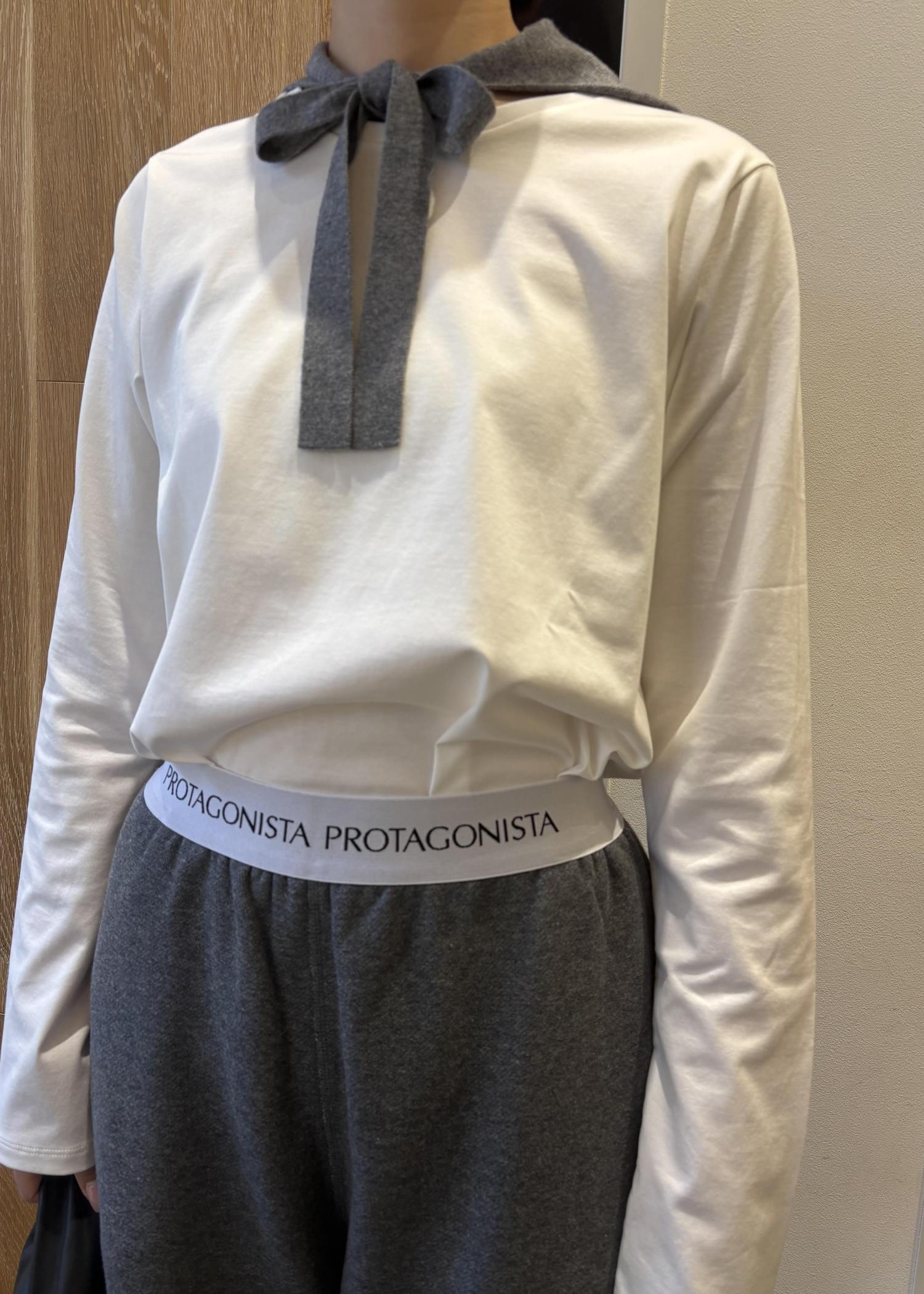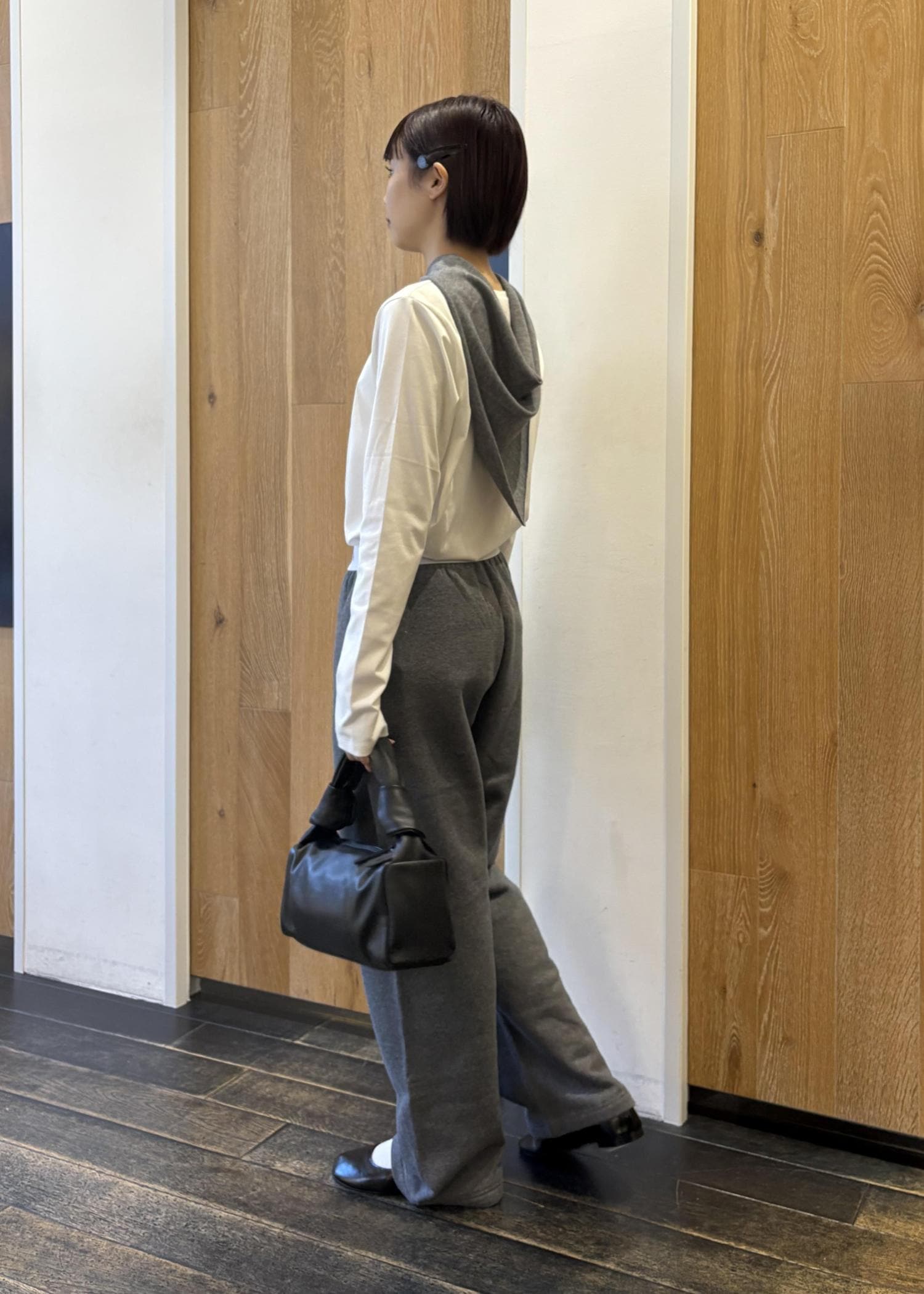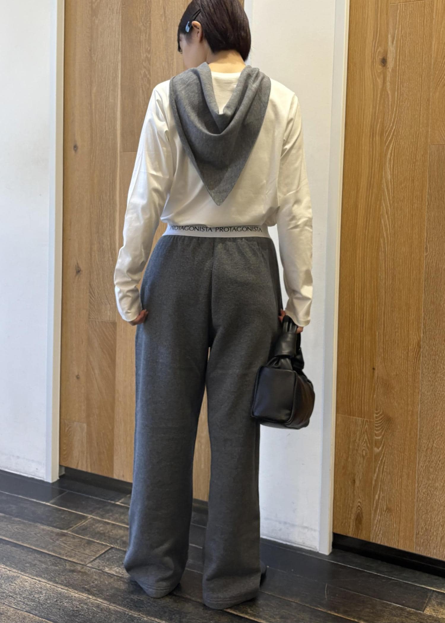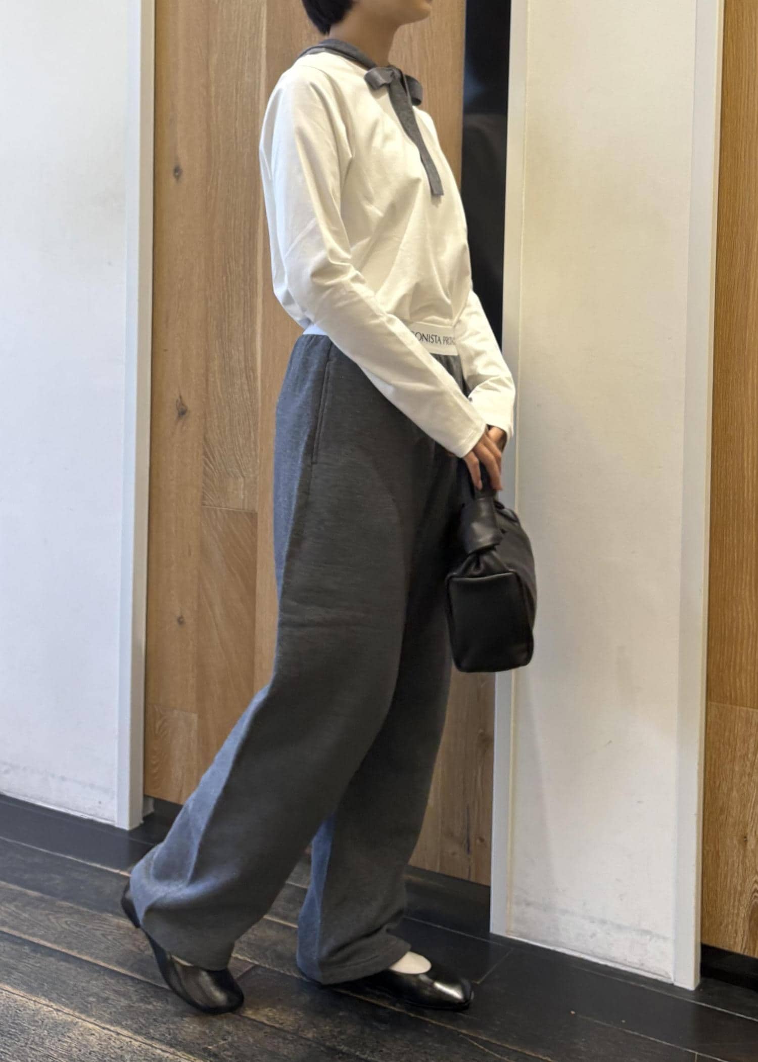 スウェットパンツを履きカジュアルなスタイルになりすぎないよう首元にスカーフを巻いたstylingにしてみました。