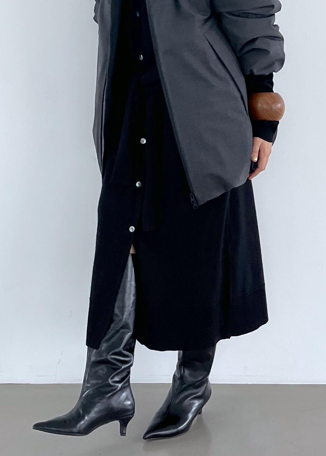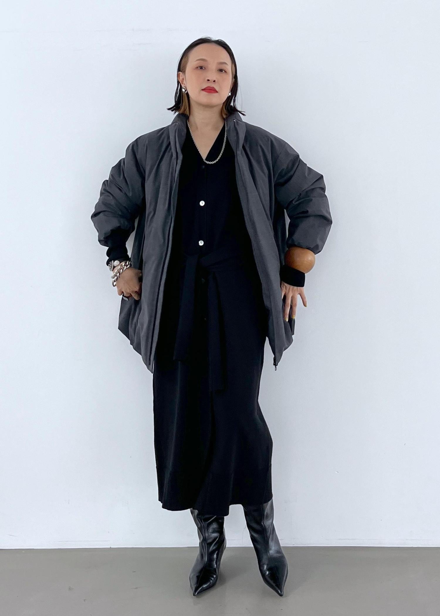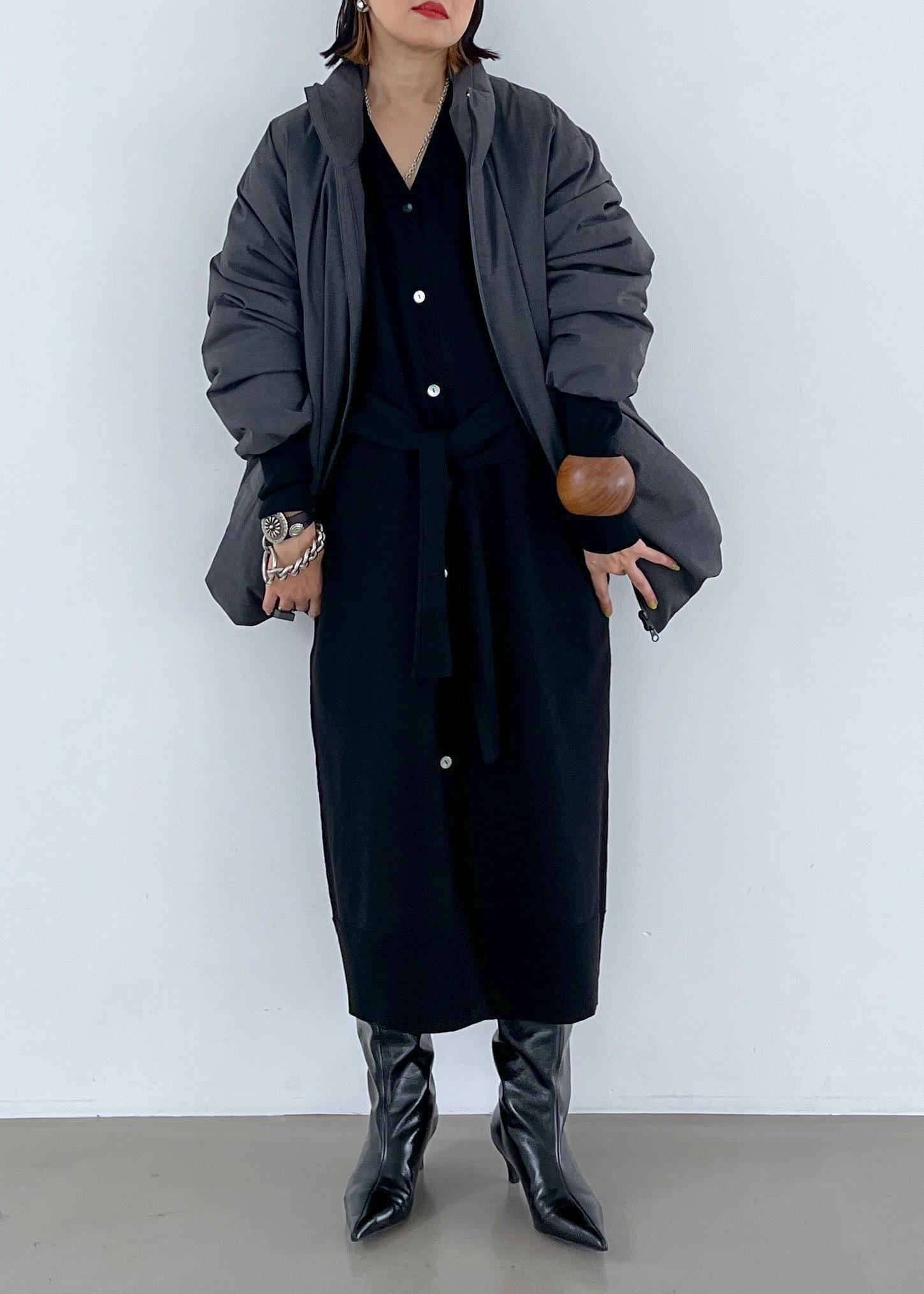 ロングブーツを合わせて、モードな印象に仕上げました。