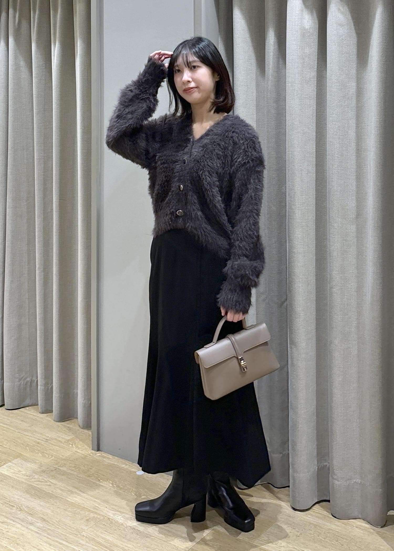VISラビットファーVネックカーディガン/イージーケア・WEB限定カラーチャコール / F¥5,929レビュー身長158cm、Fサイズ着用。