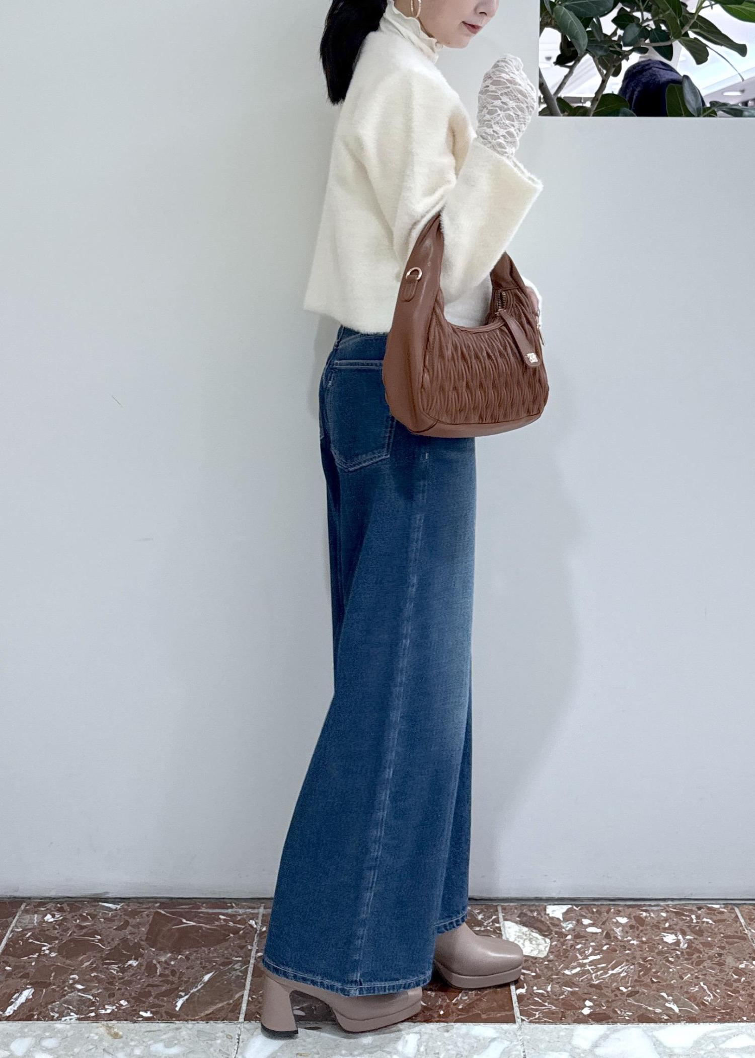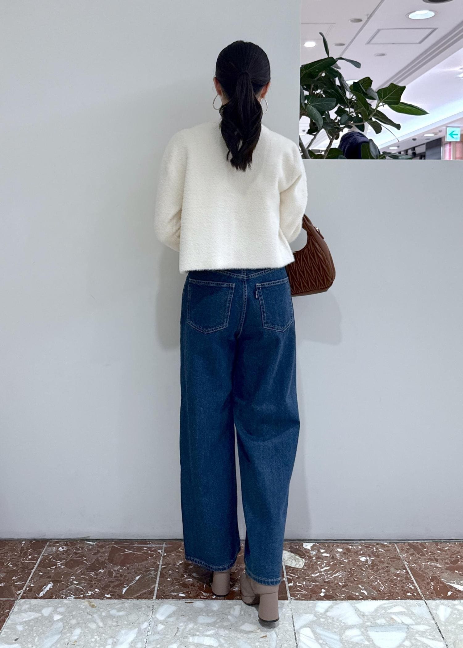 フェミニンな印象のカーディガンにデニムを合わせた女っぽカジュアルコーデ。