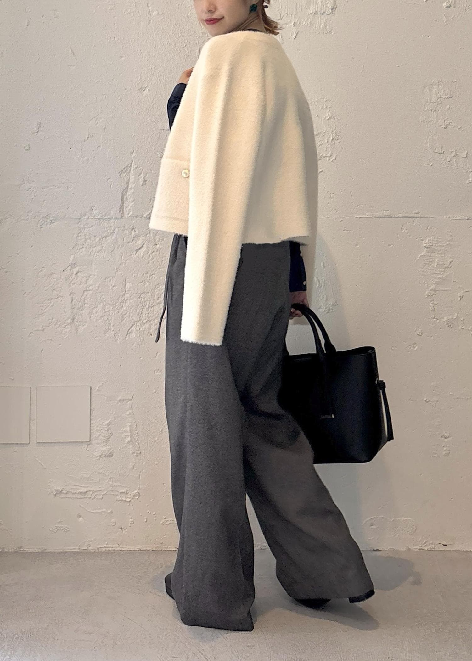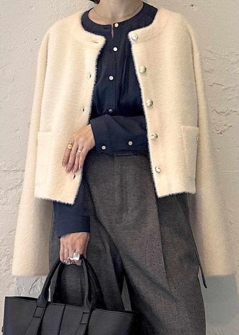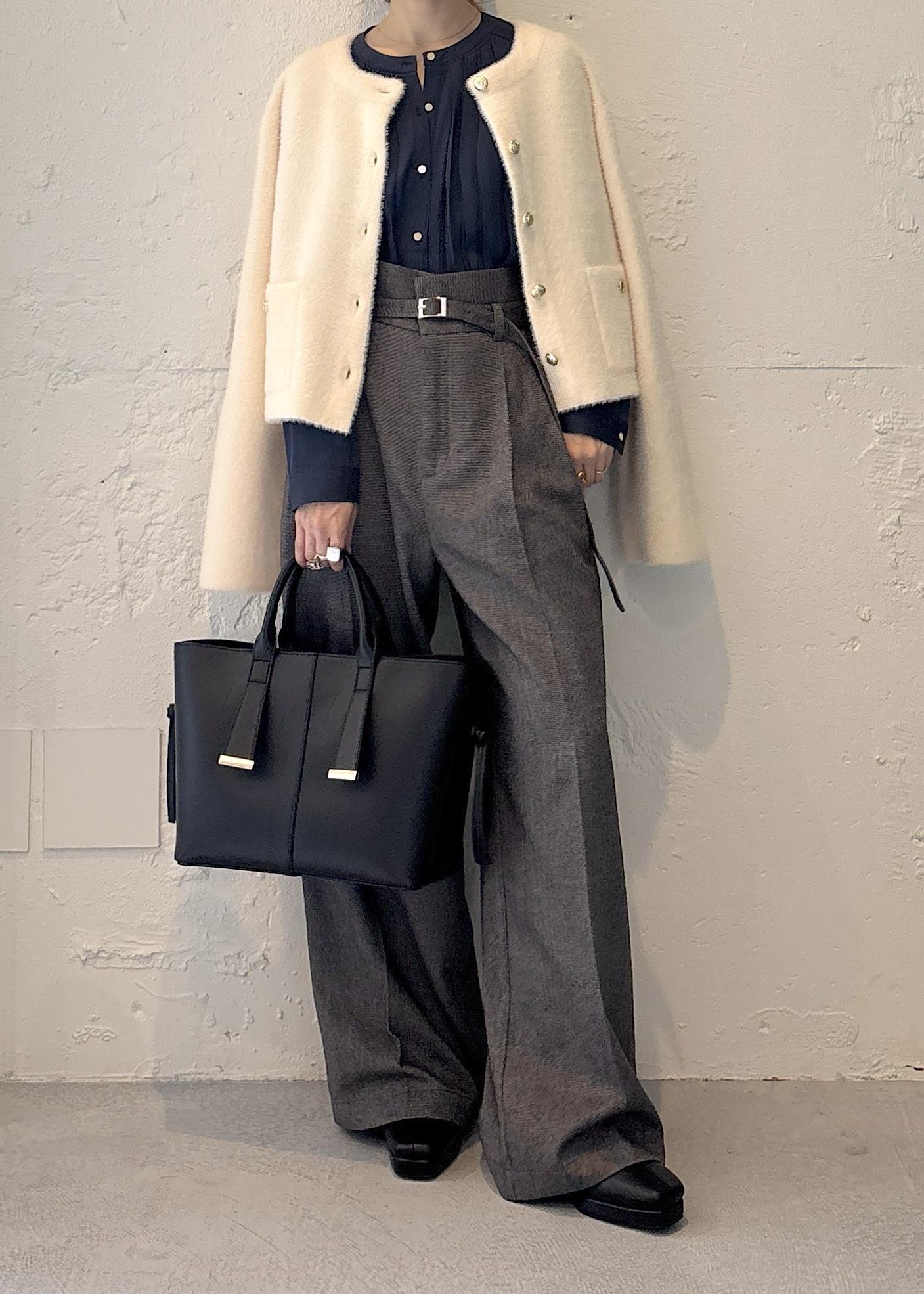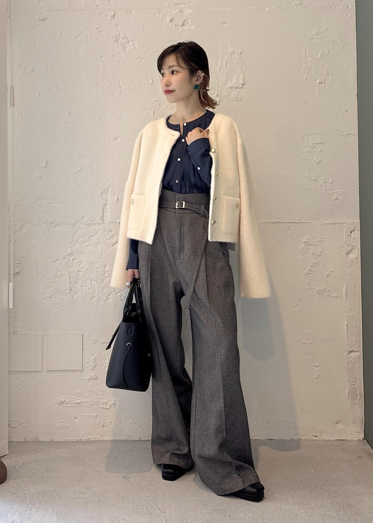 キチンと感は欲しいけど、季節感も出したい方へオススメのお仕事スタイル♪ネイビーのブラウスは品の良い印象で、ハイウエストのパンツと合わせることでスタイルup見えします◎寒くなってきたので、ミニフェザーのアウターで暖かさを感じられるようまとめました。秋から冬オススメのオフィスカジュアルコーデ。