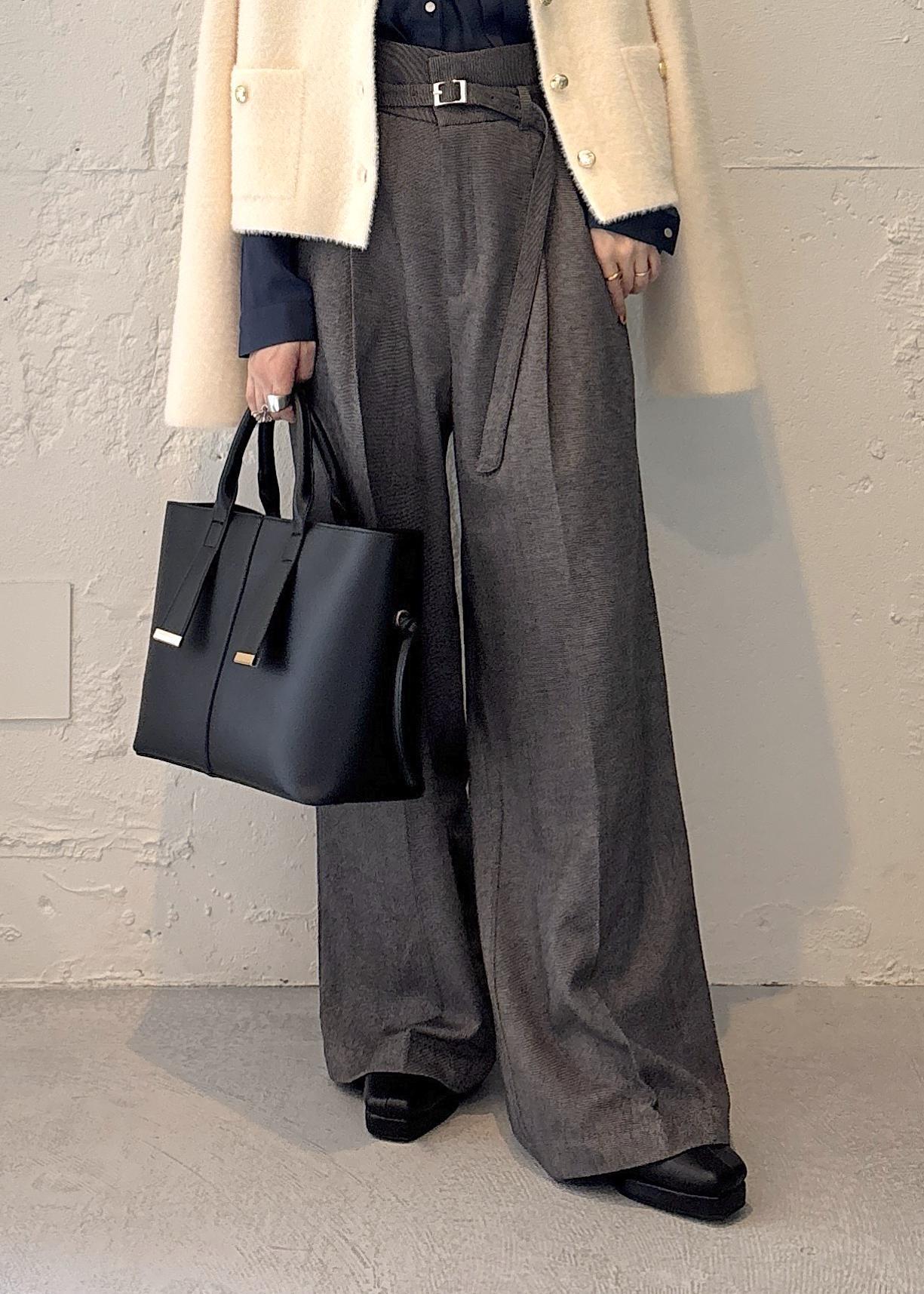 VIS起毛ウールライク版ベルトディテールタックワイドパンツグレー / M¥6,589レビュー季節を感じる起毛素材がさりげない、大人可愛いワイドパンツ♪ハイウエストデザインが脚長効果抜群で、スタイルupが叶う優秀パンツです。厚みは強くなく、優しい起毛の素材感が温かみのある印象◎サンプルの為Mサイズ着用、全体的にかなりゆとりがあり、6cmヒールでギリギリでした。普段ならSサイズを選びます。