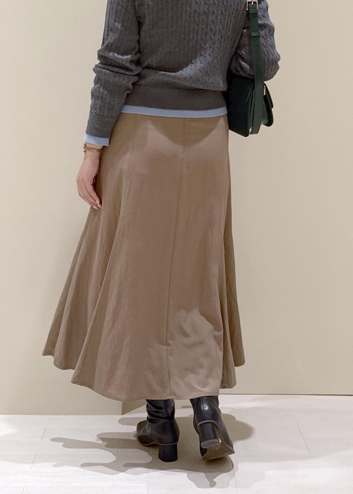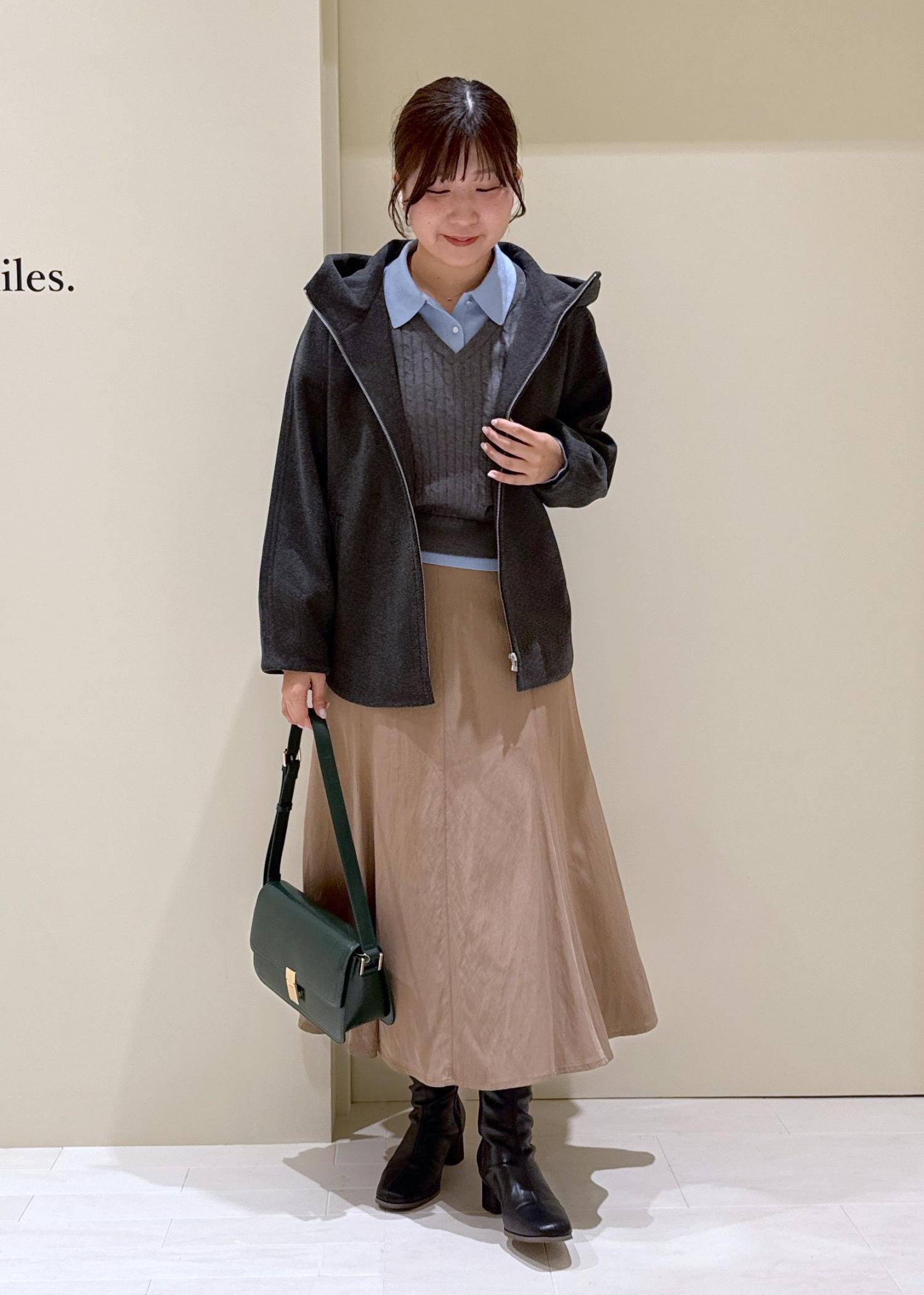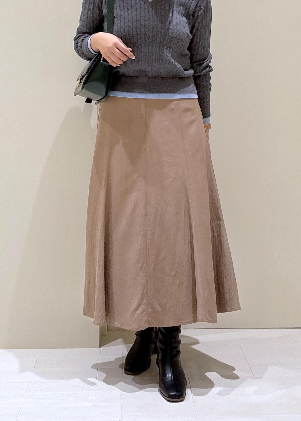 キャメルのスカート合わせで温かみのあるコーデに。