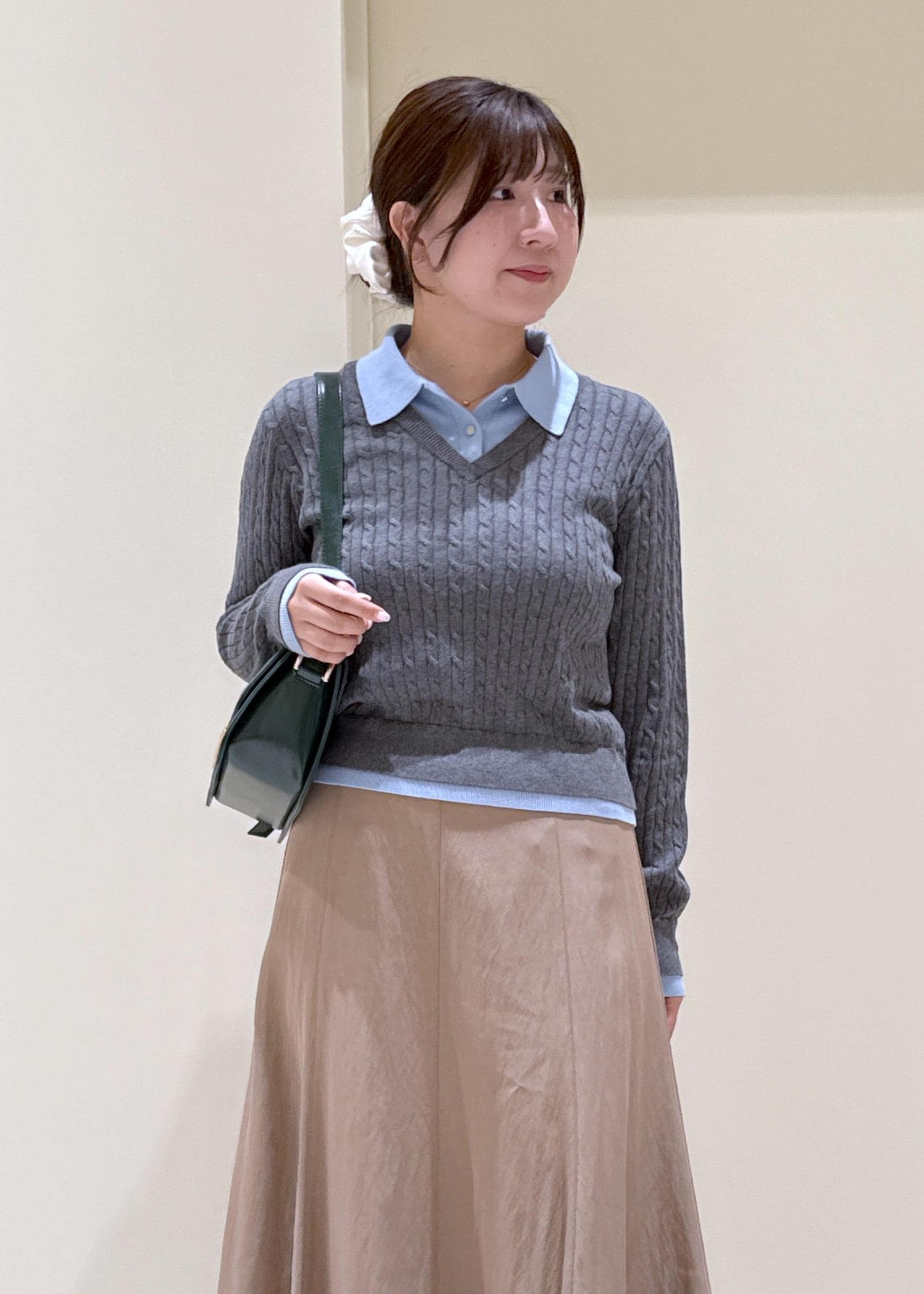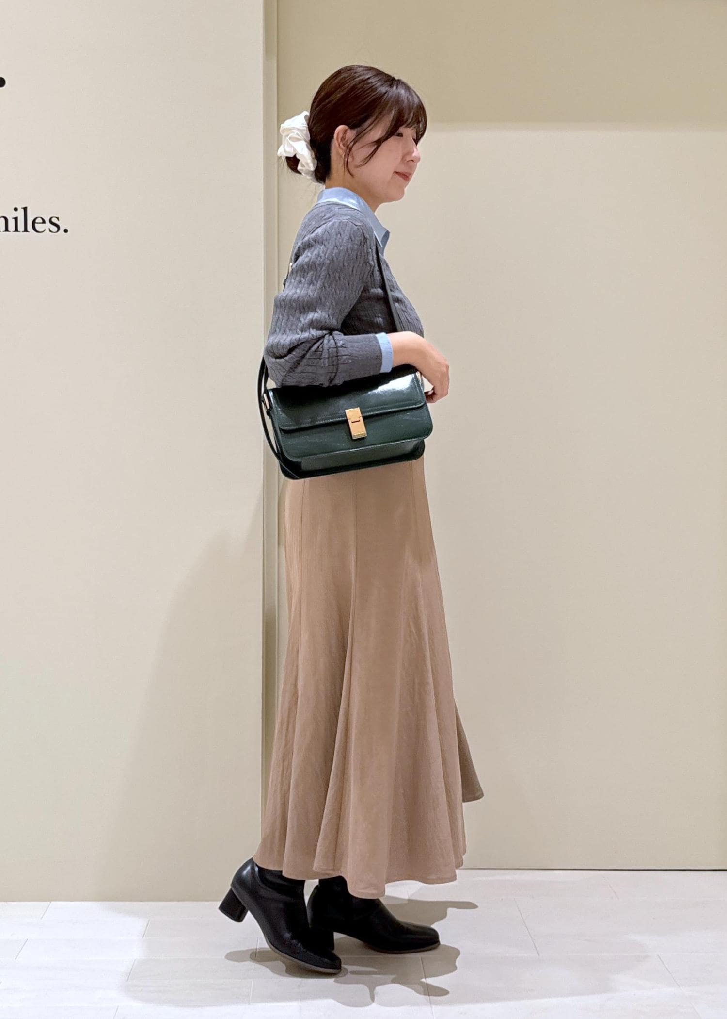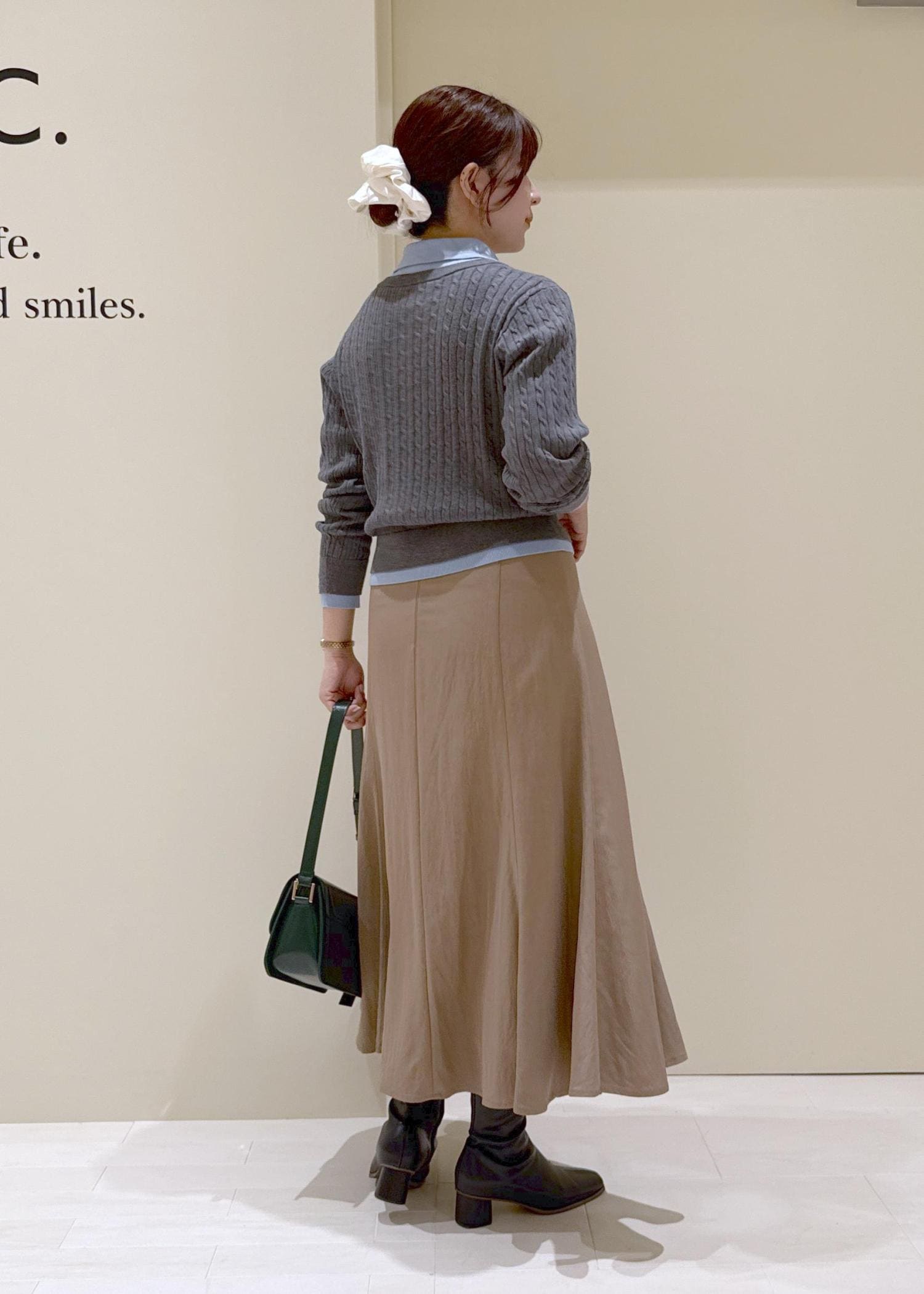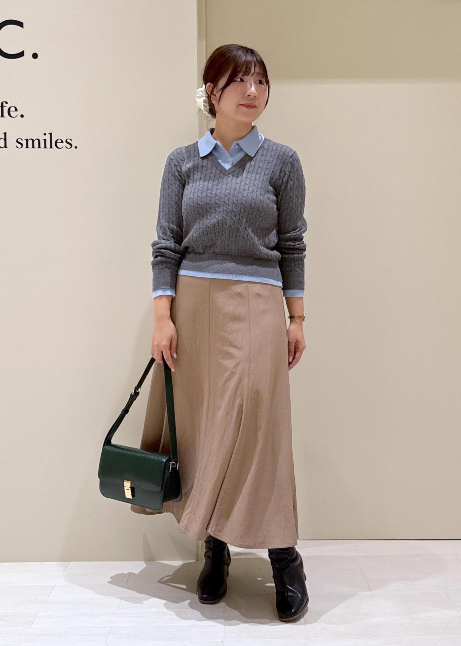 キャメルのスカート合わせで温かみのあるコーデに。