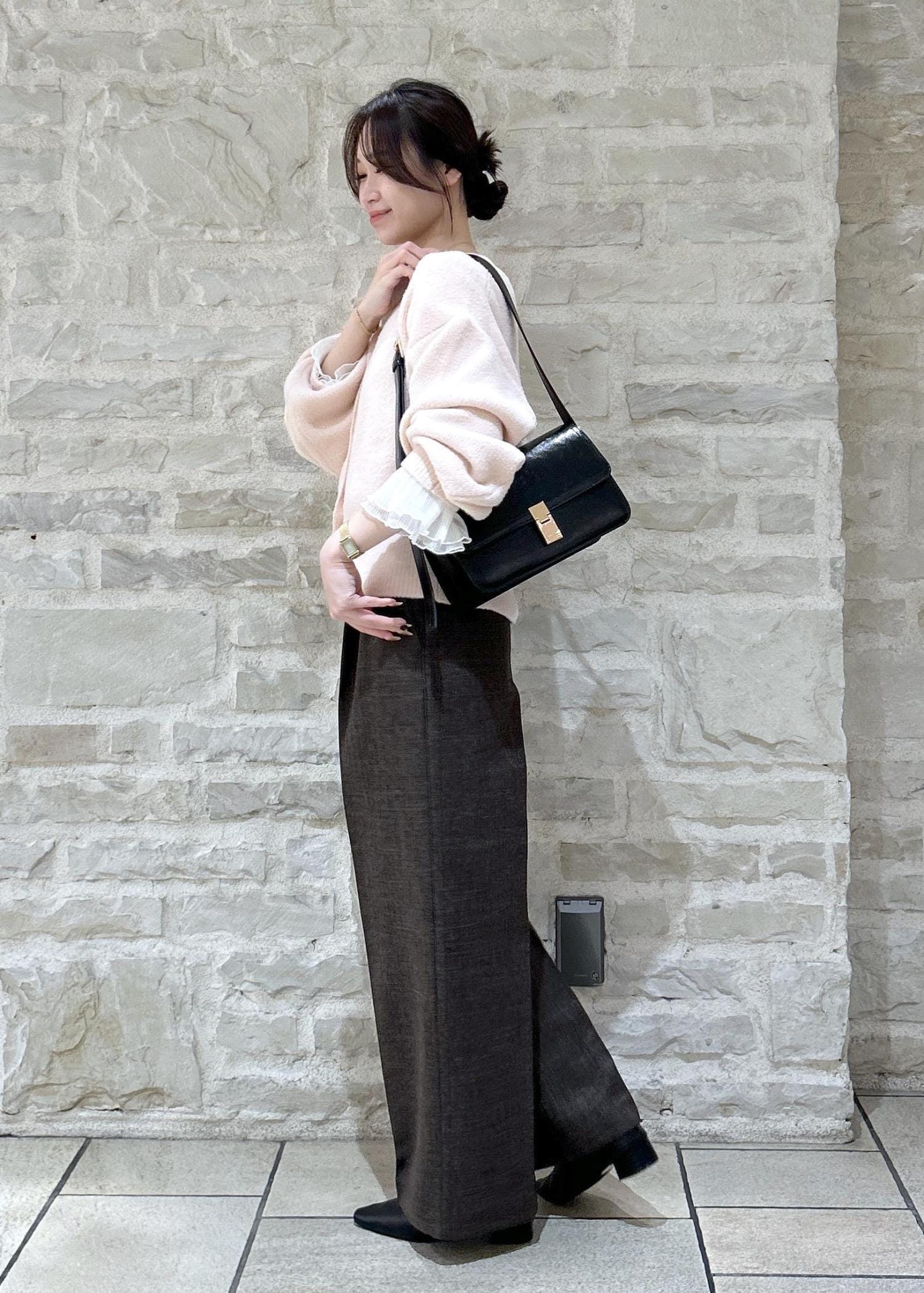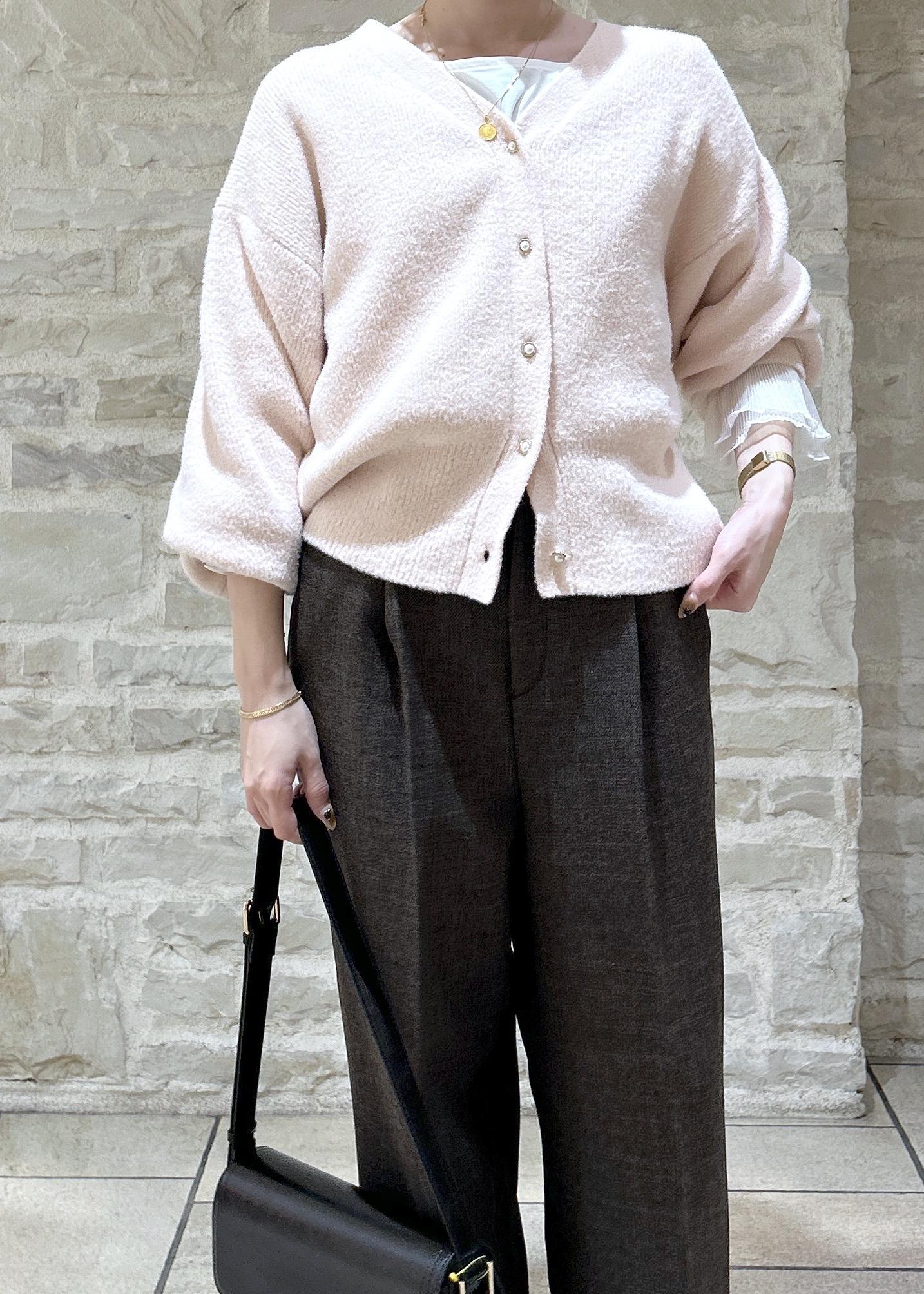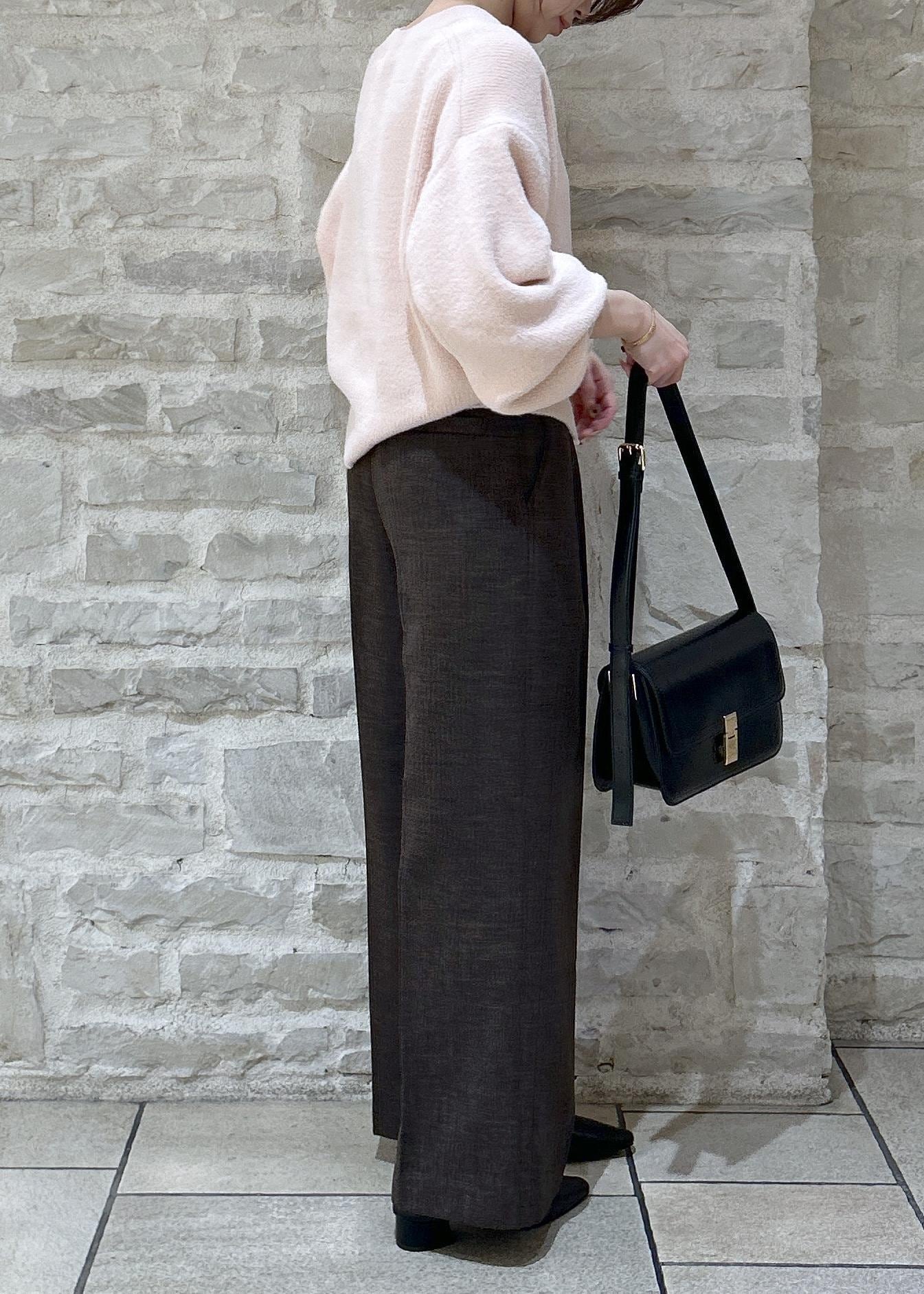 ピンクのニットにブラウンのパンツでカラーを組み合わせたスタイリングにしました。