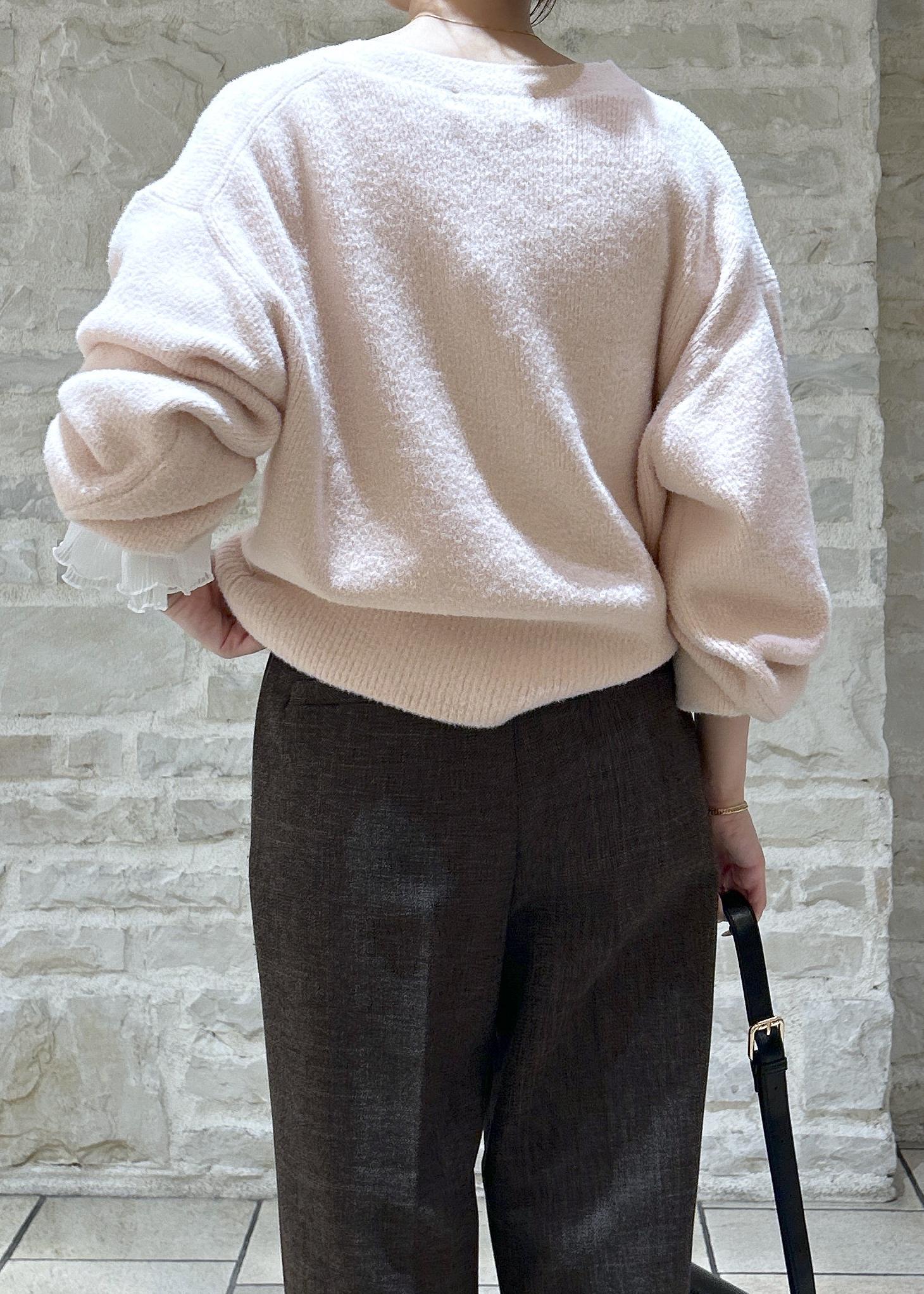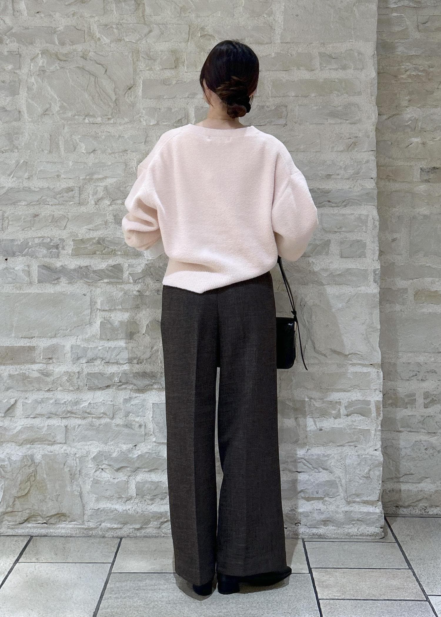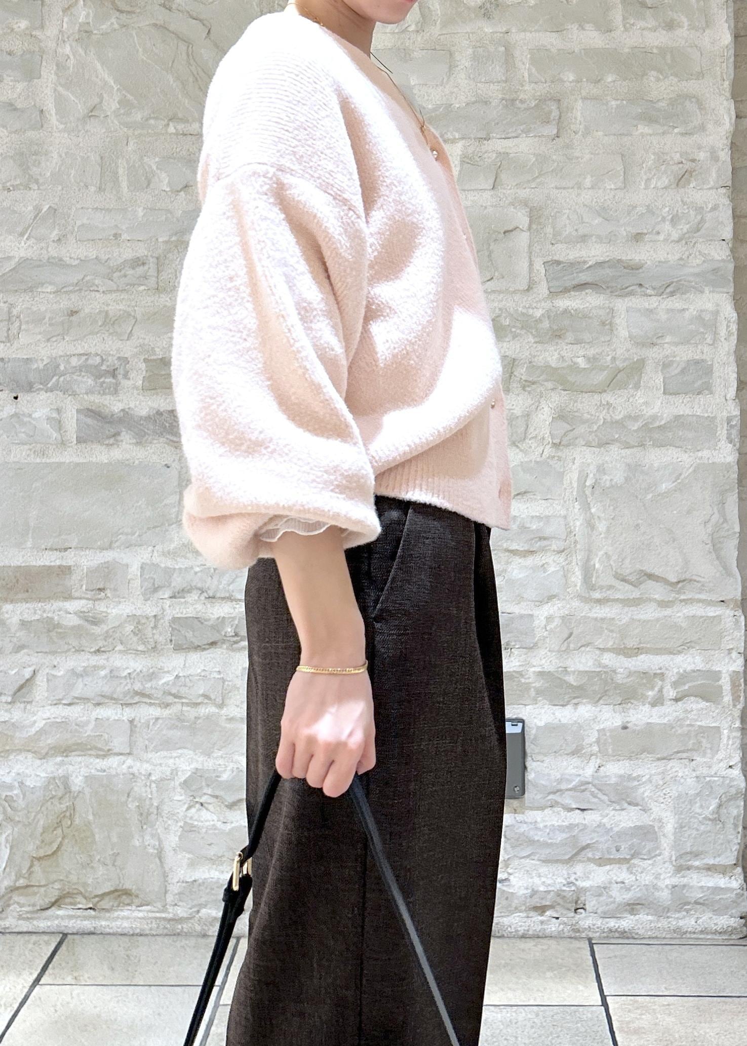 ピンクのニットにブラウンのパンツでカラーを組み合わせたスタイリングにしました。