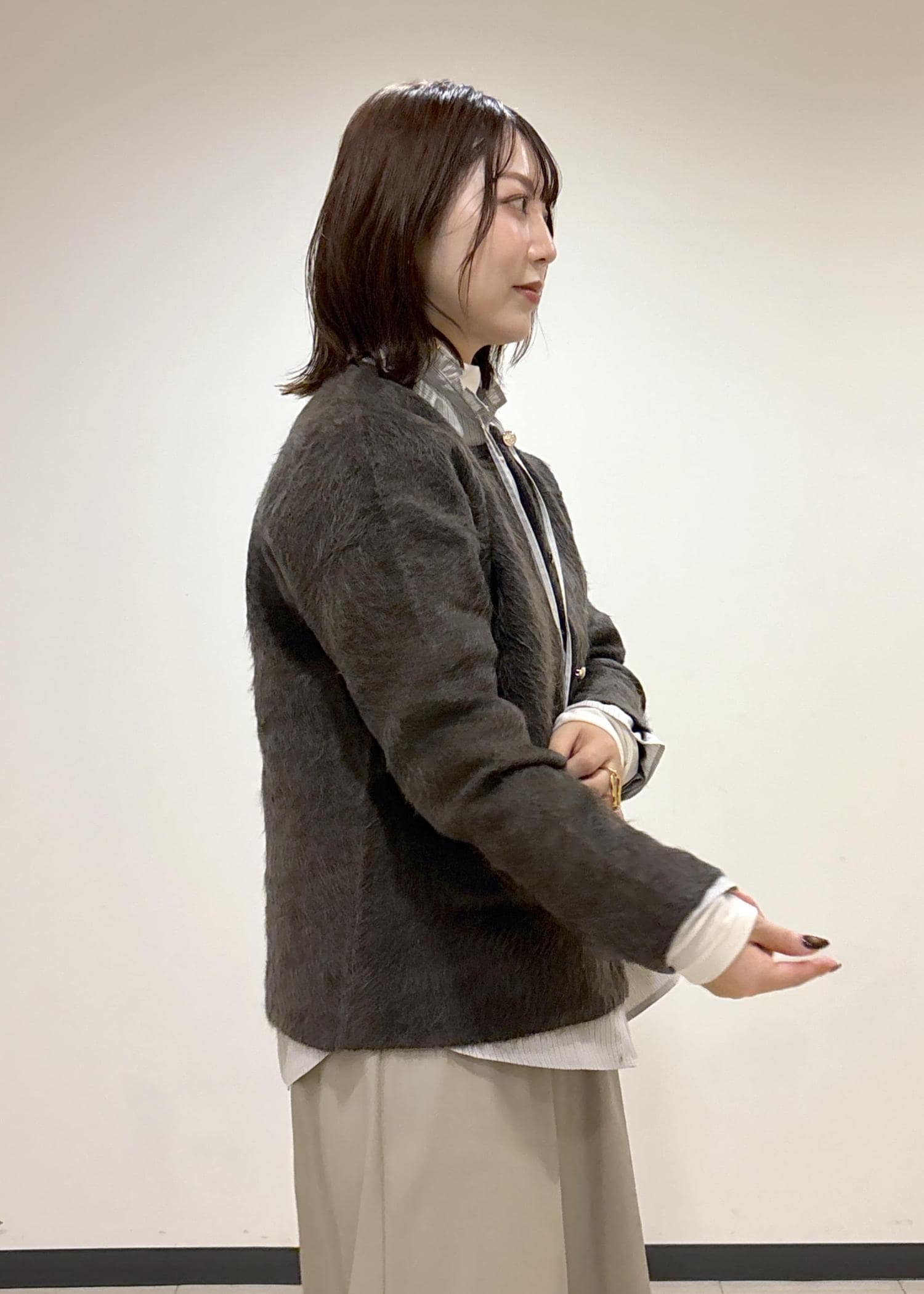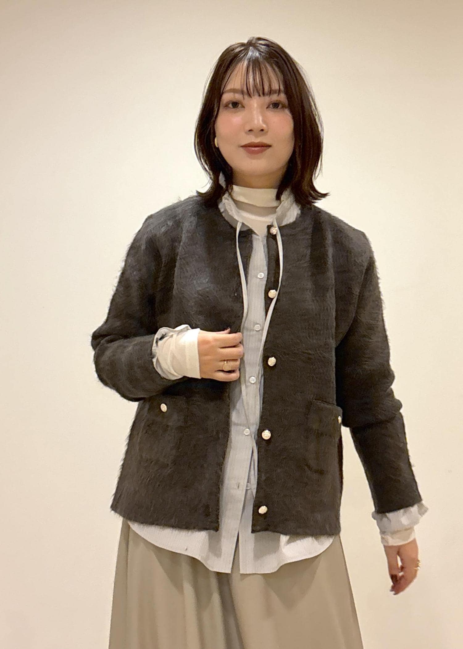 ROPÉ PICNICダブルフェイス襟取り外し起毛カーディガンダークブラウン / F¥5,192レビュー程よく袖や身幅にゆとりがあるのでオーバーサイズのシャツをインしてもごわつき感なく腕を通せます。