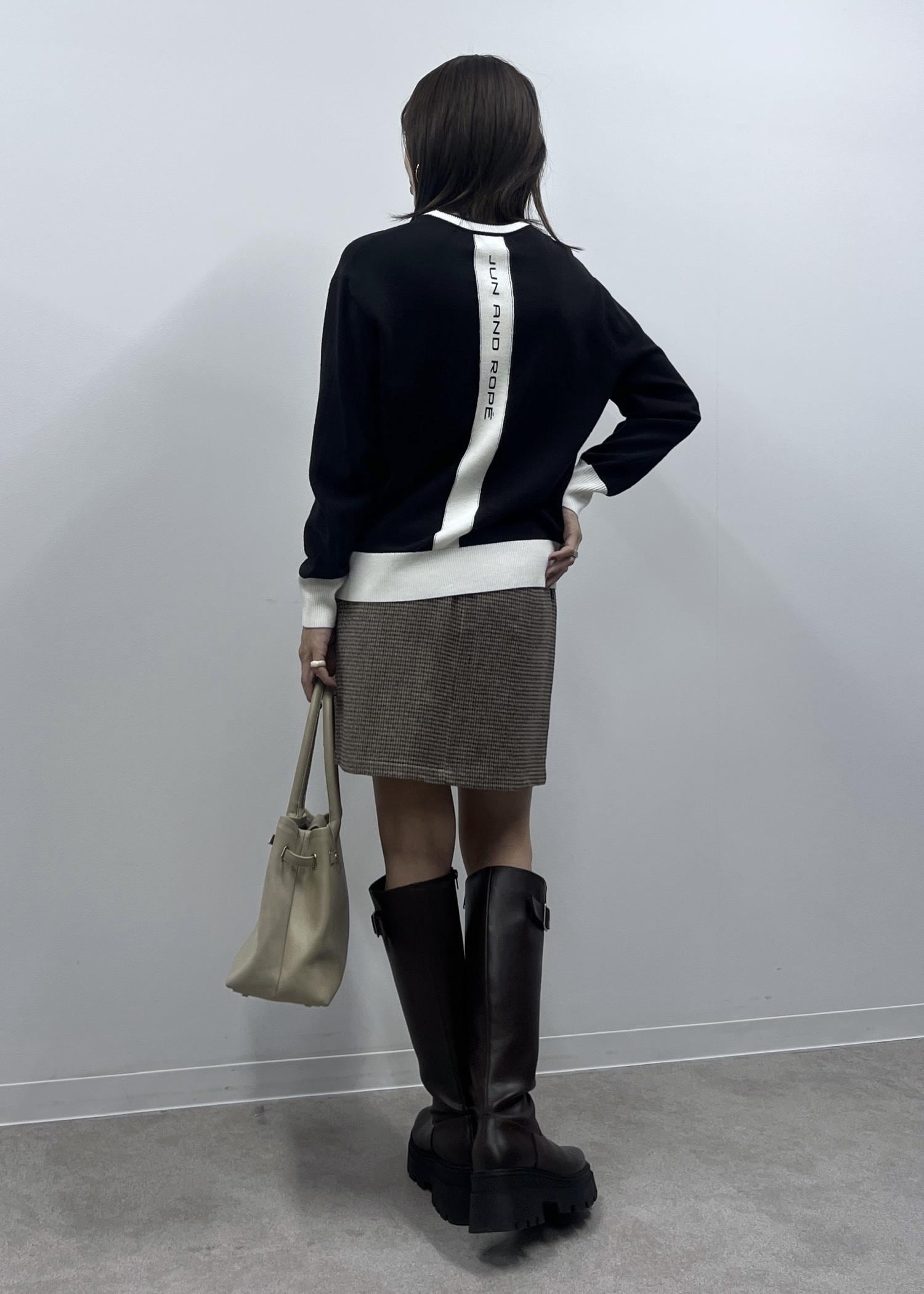 トップスはロゴ入りのブラックのニットで引き締めるのがポイントです。