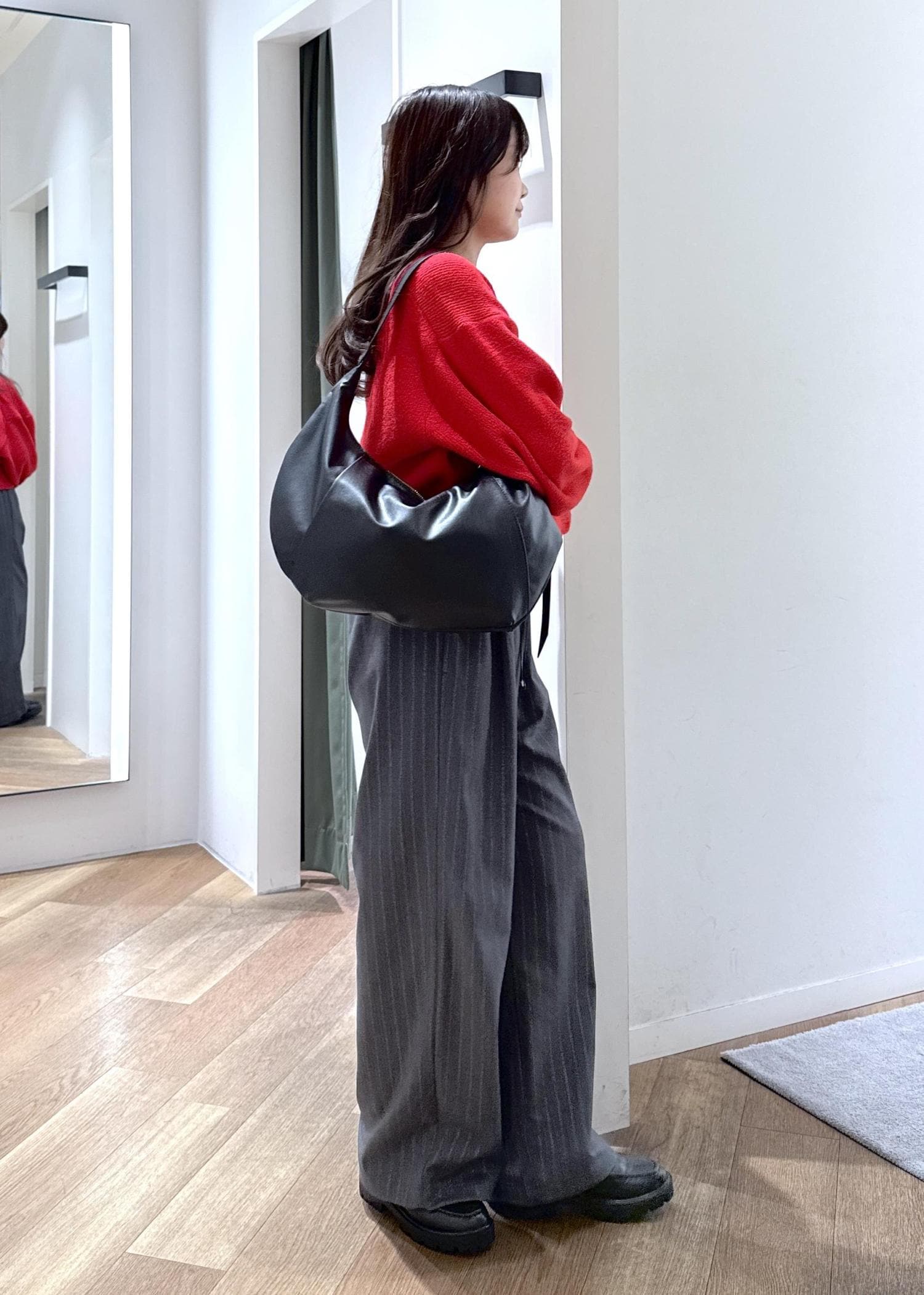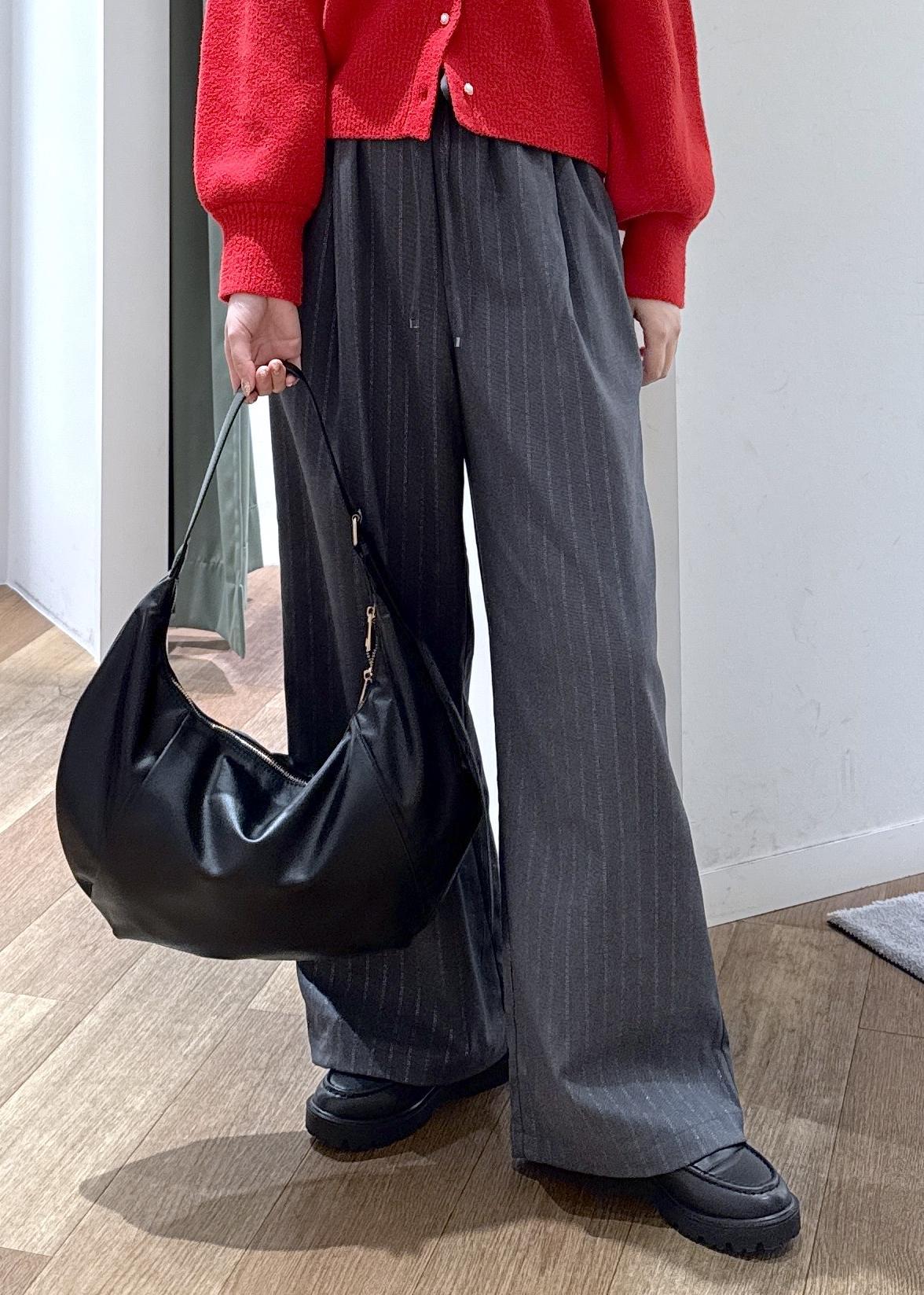 ストライプのパンツとブラックフェイクレザーのバッグを合わせ、パンチの効いた印象に。