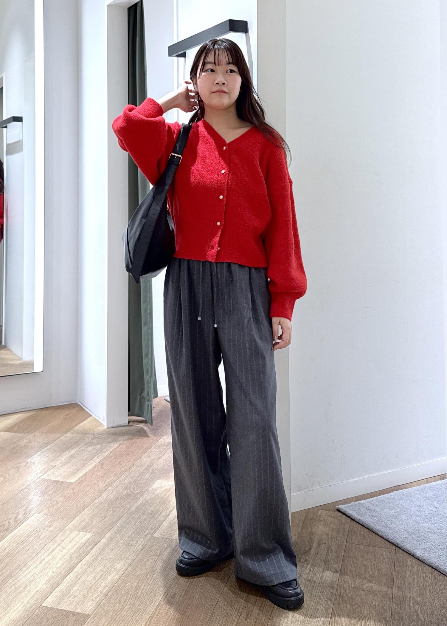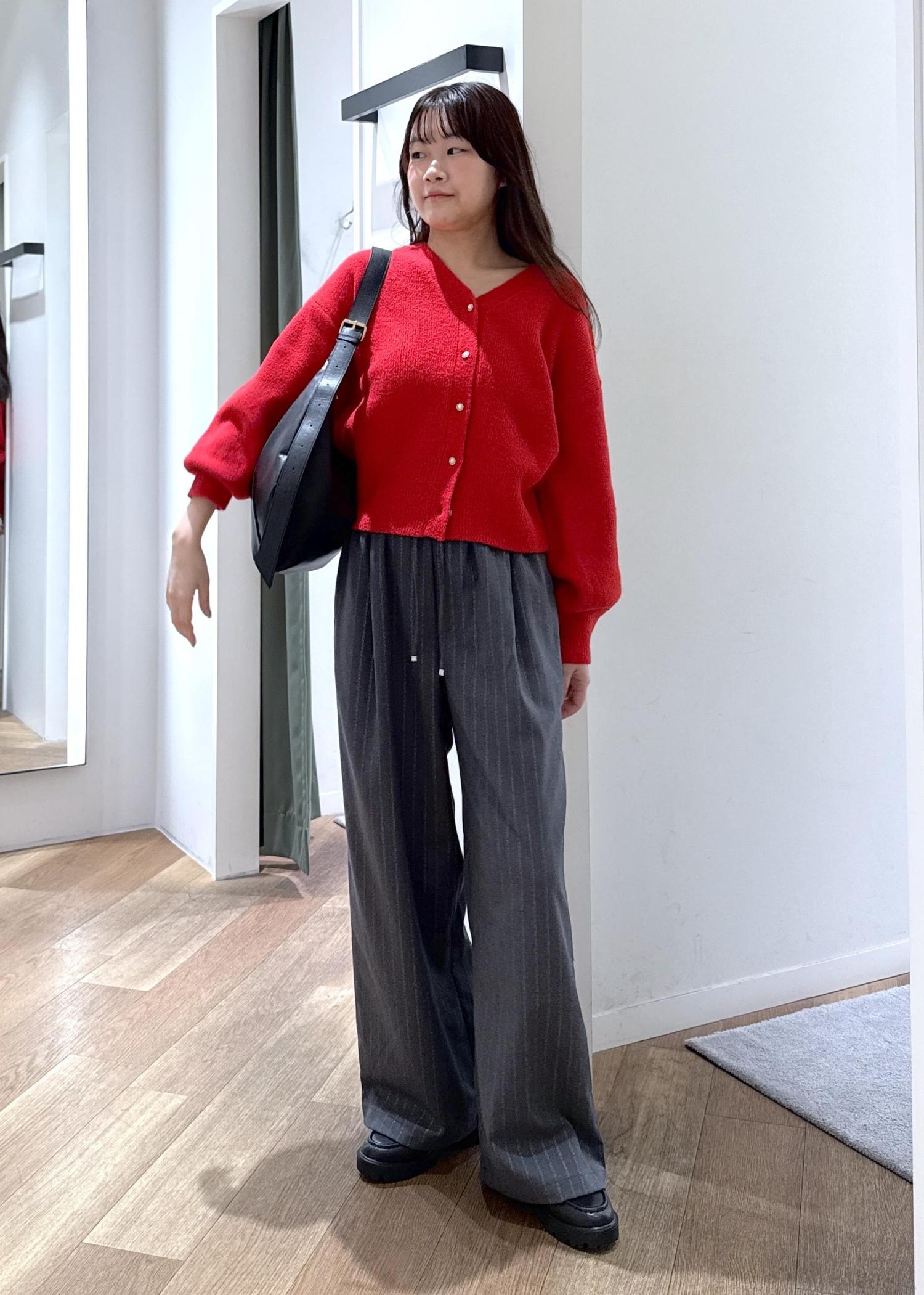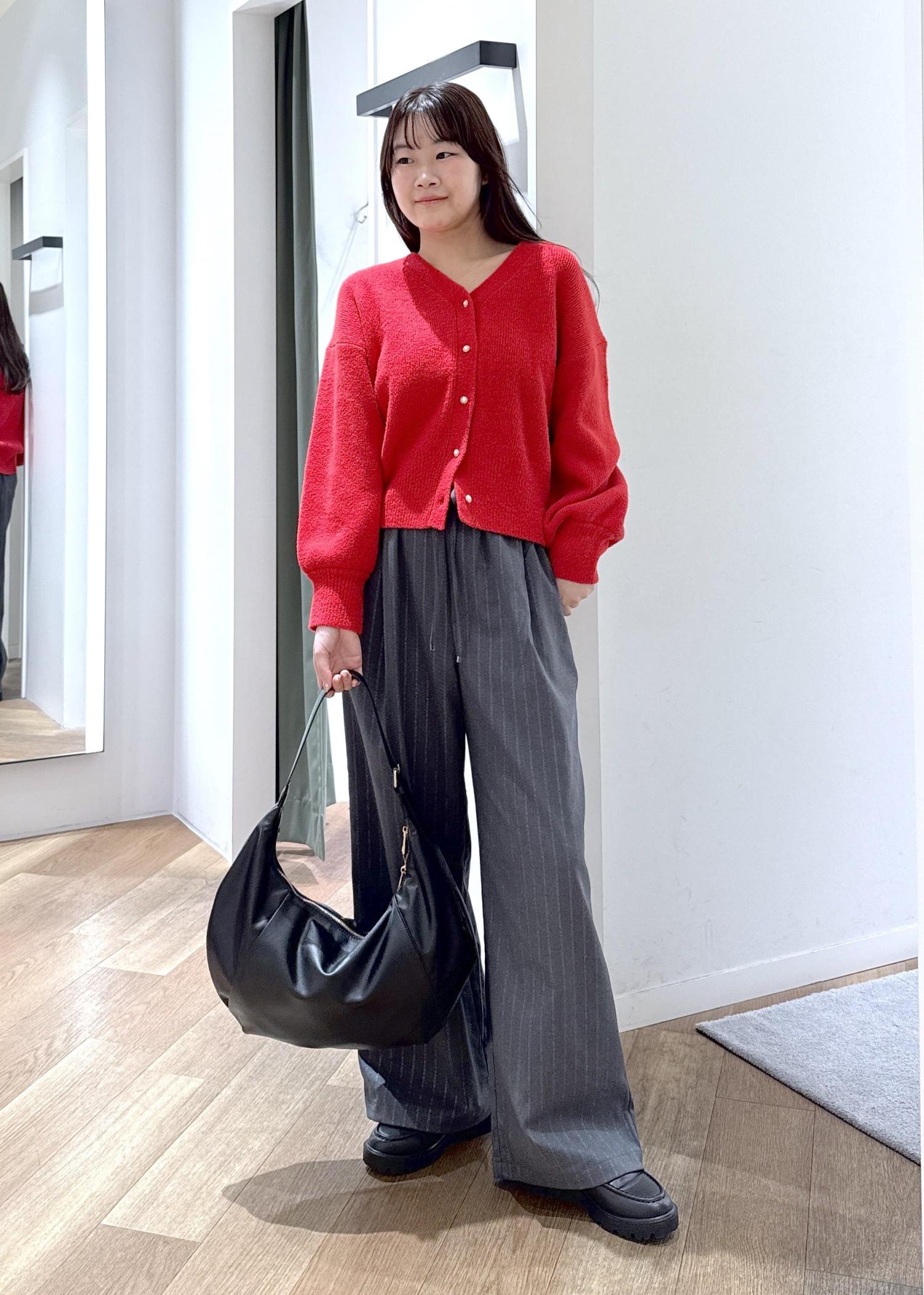 カーディガンの1番下のボタンを開けて脚長効果を意識したのが着こなしのポイントです。