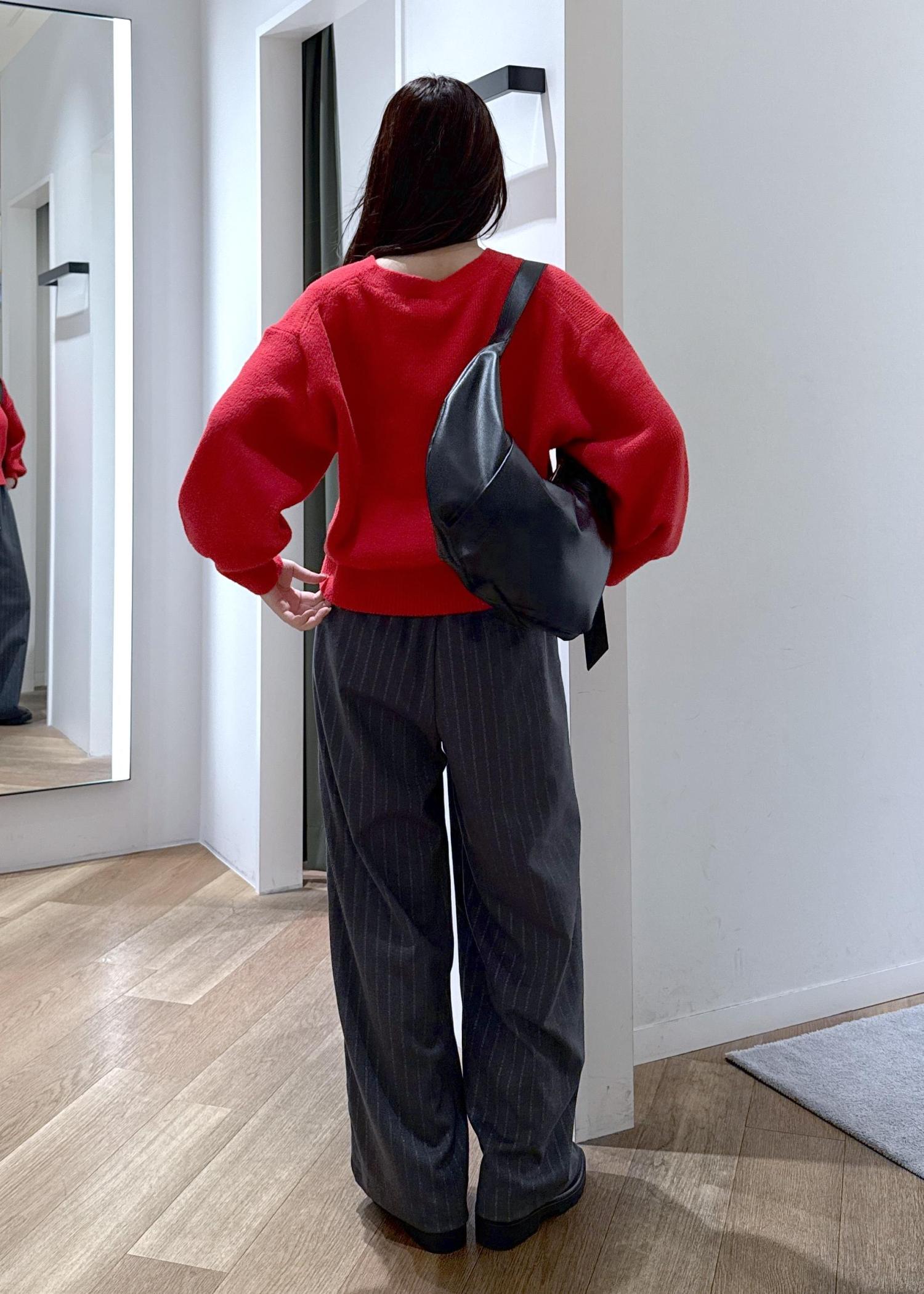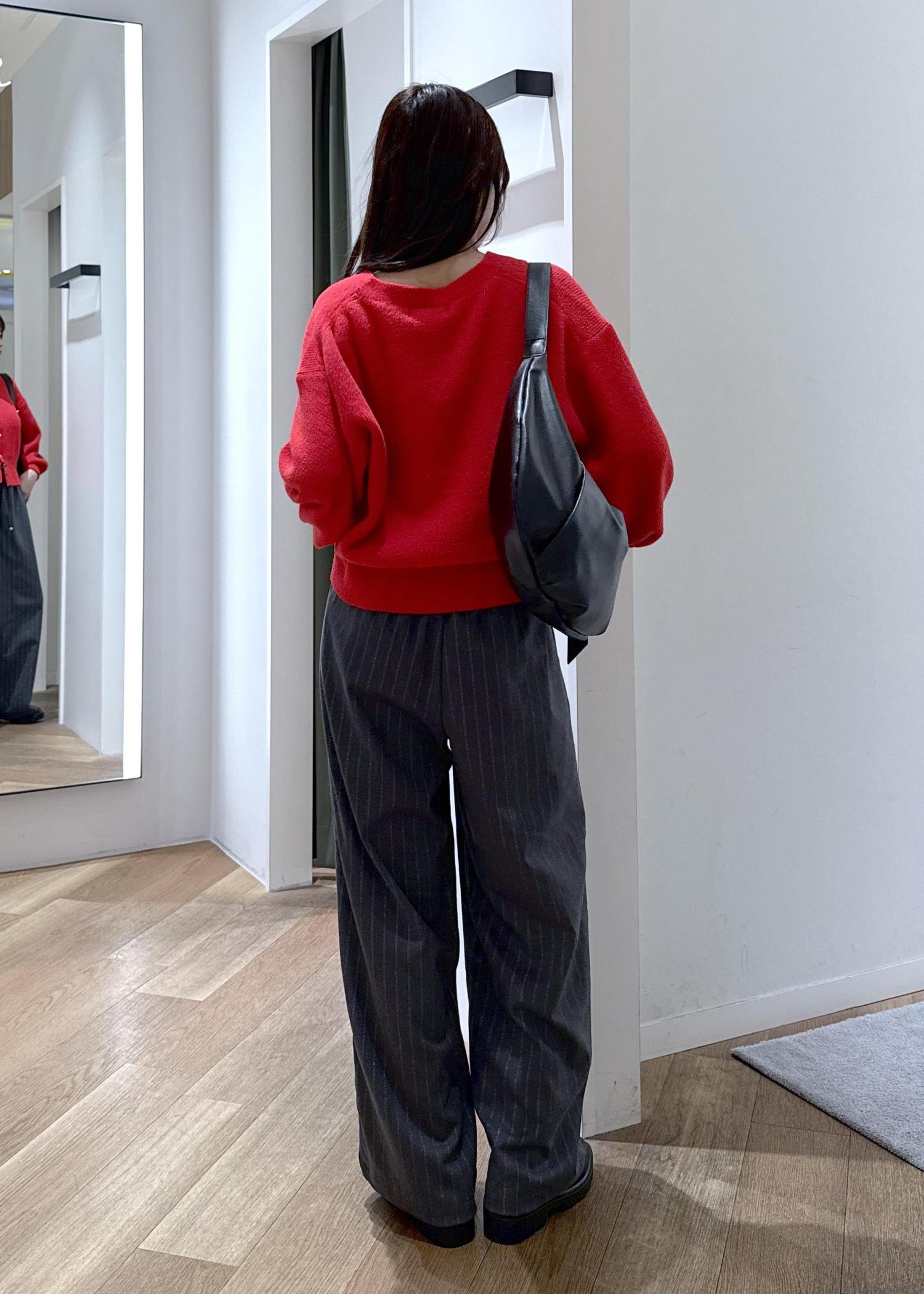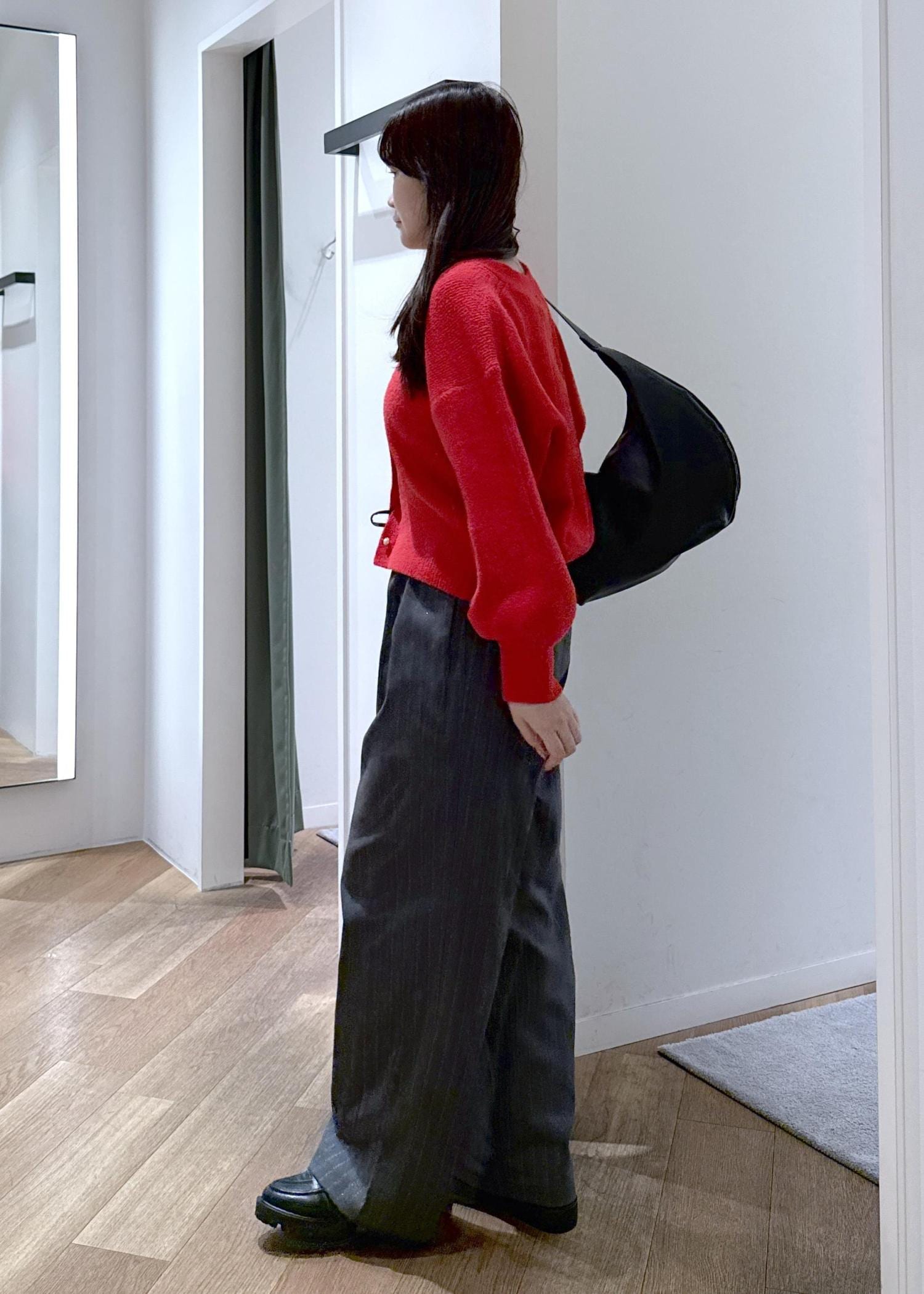 カーディガンの1番下のボタンを開けて脚長効果を意識したのが着こなしのポイントです。