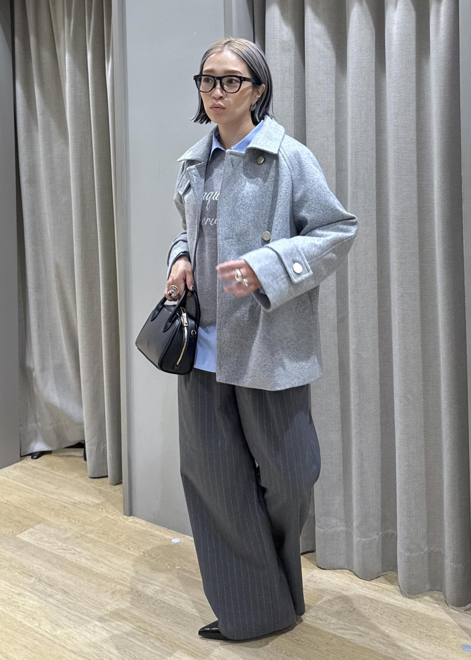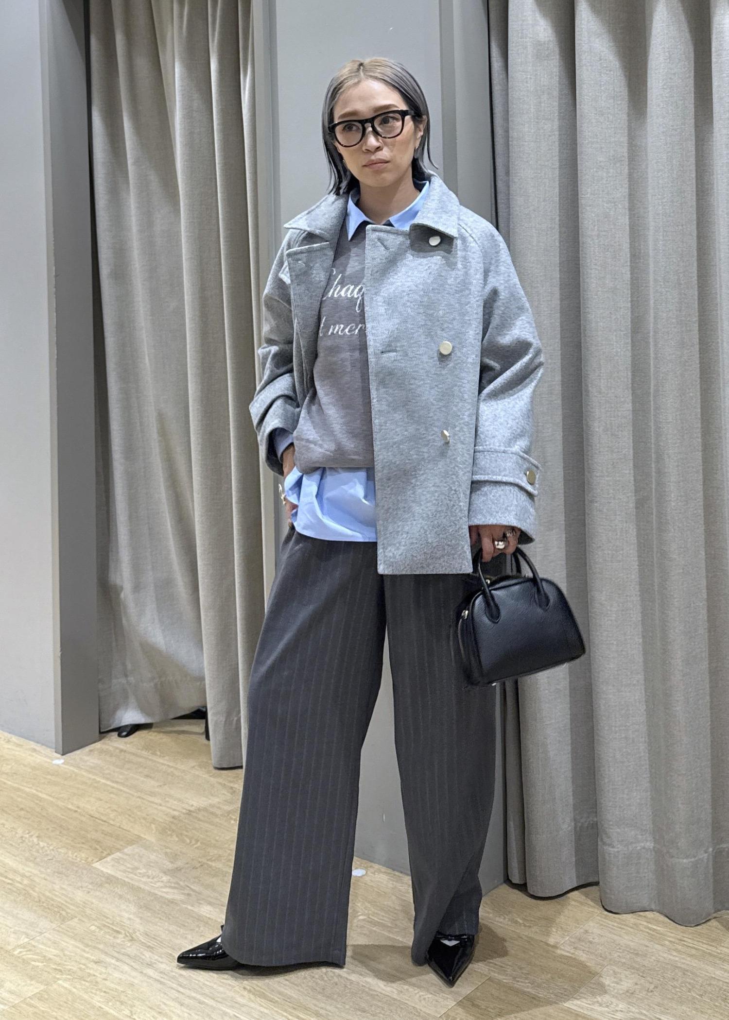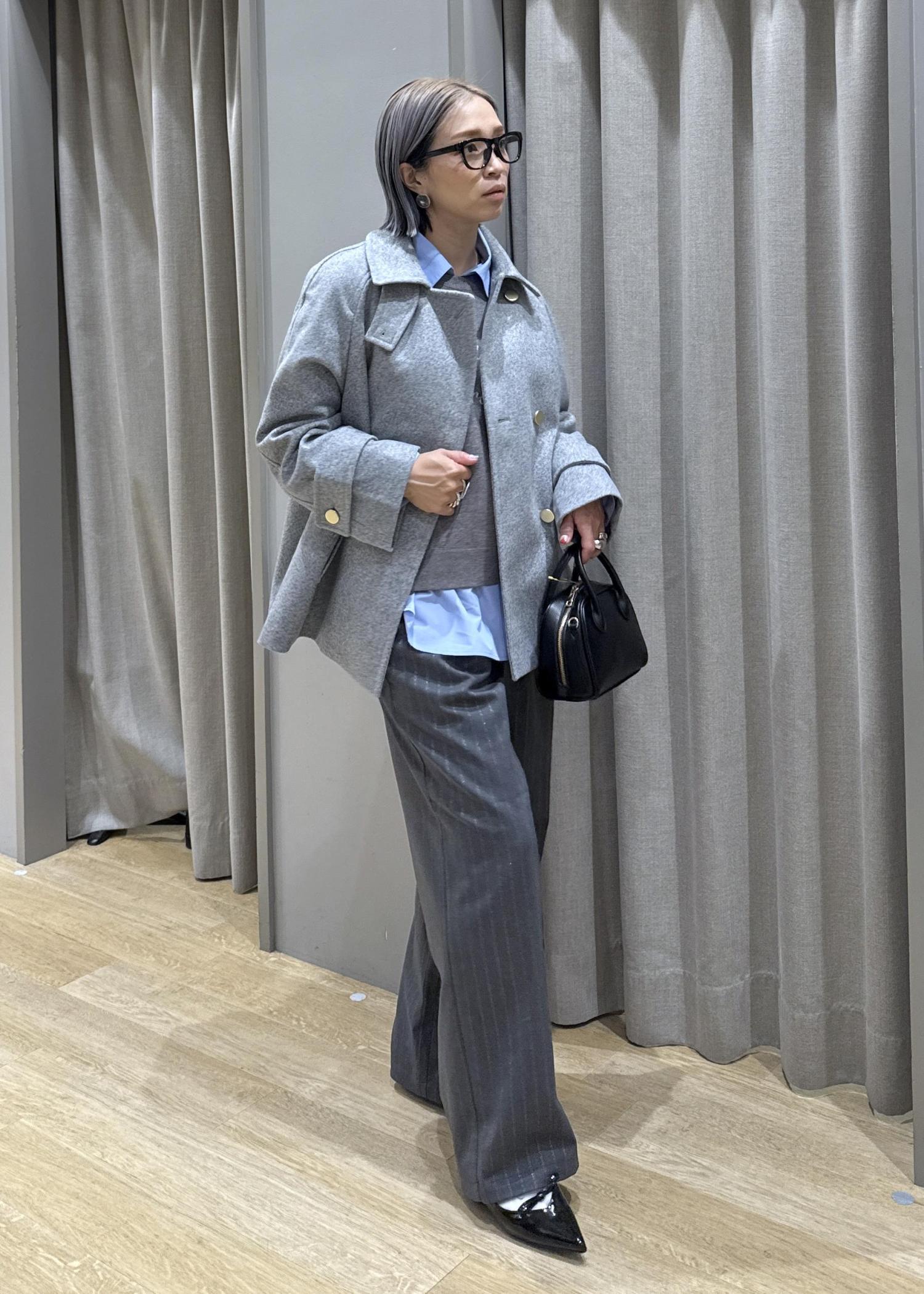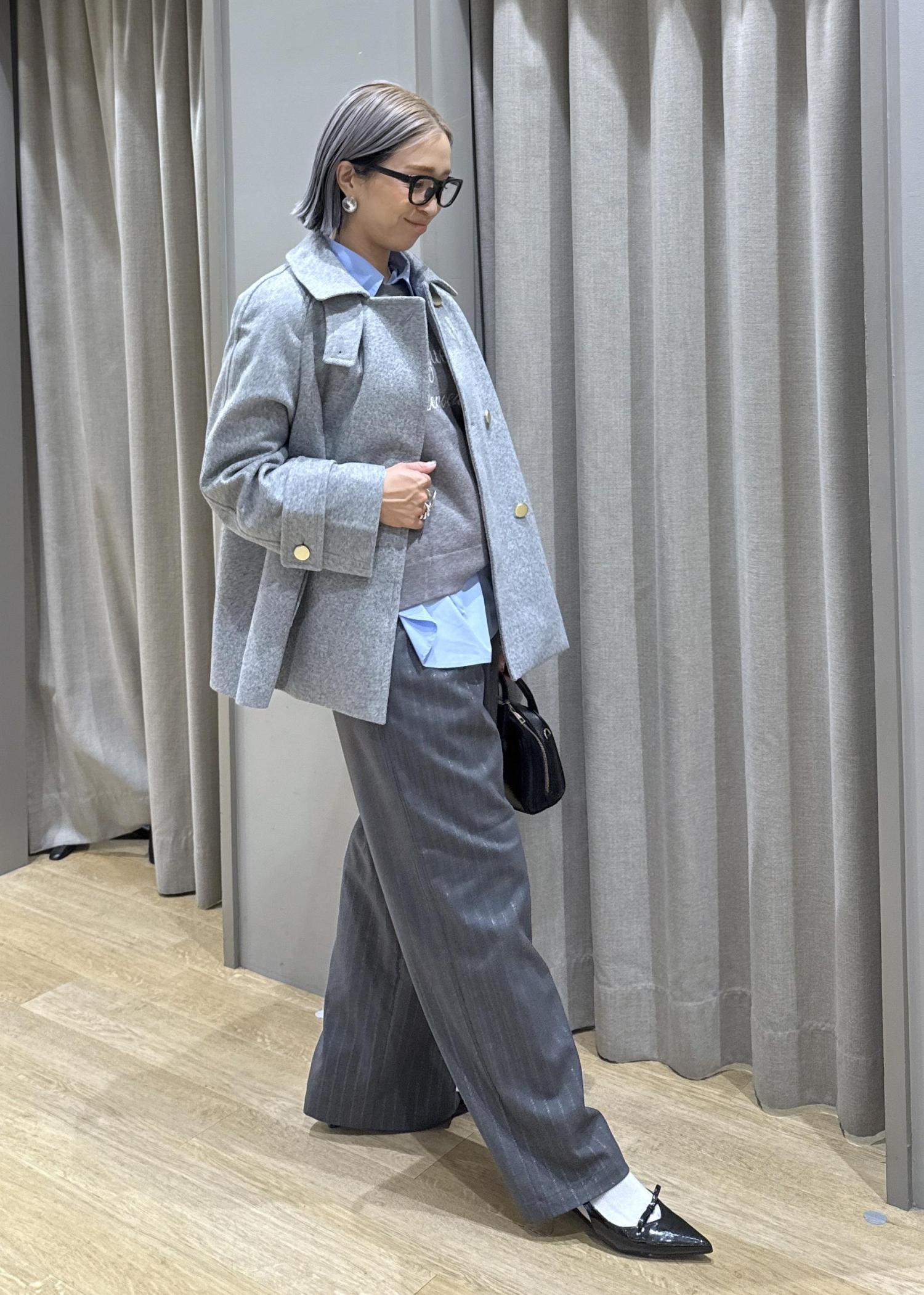 全体的にグレーなワントーンにし、首元にサックスブルーの襟を出して