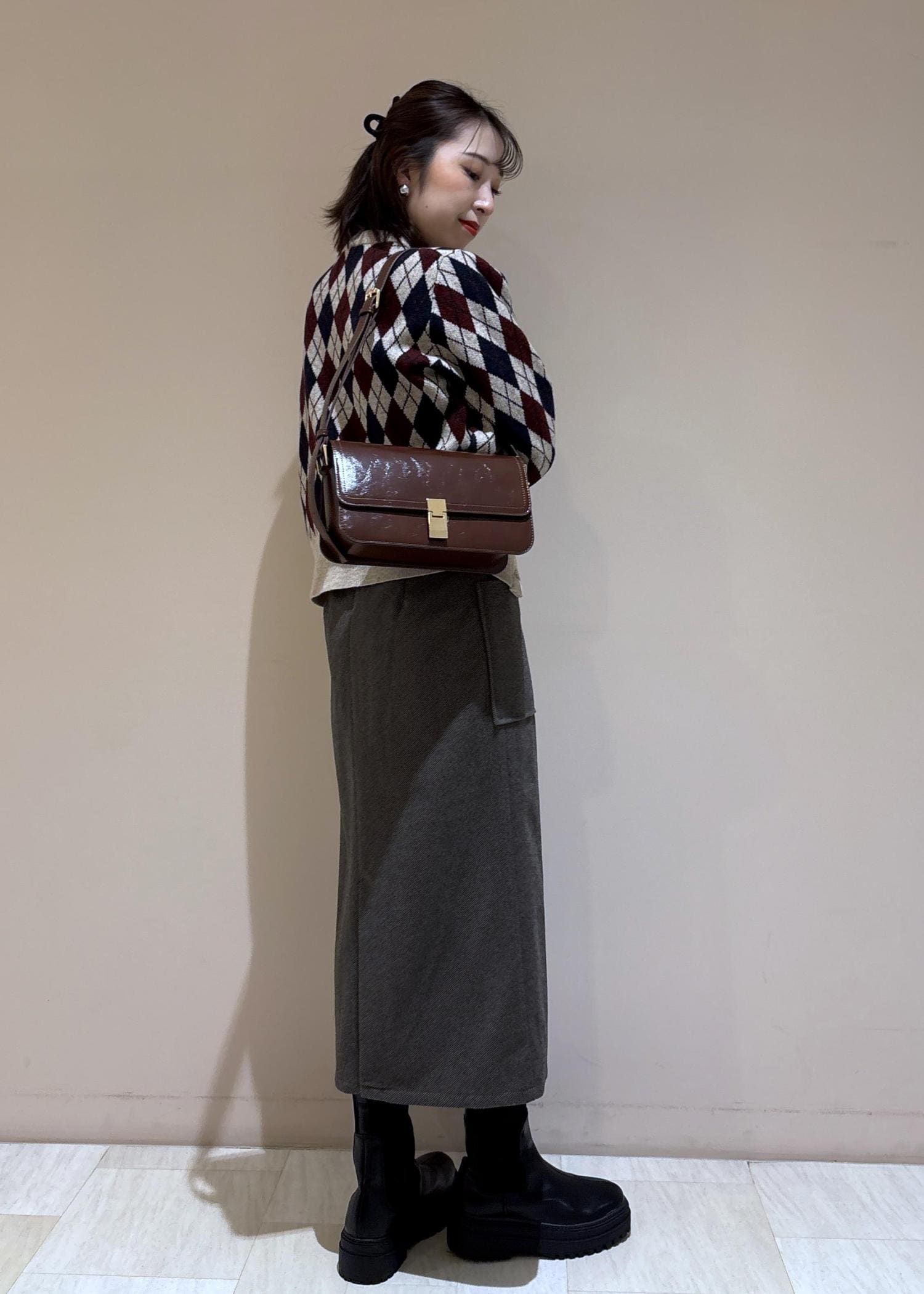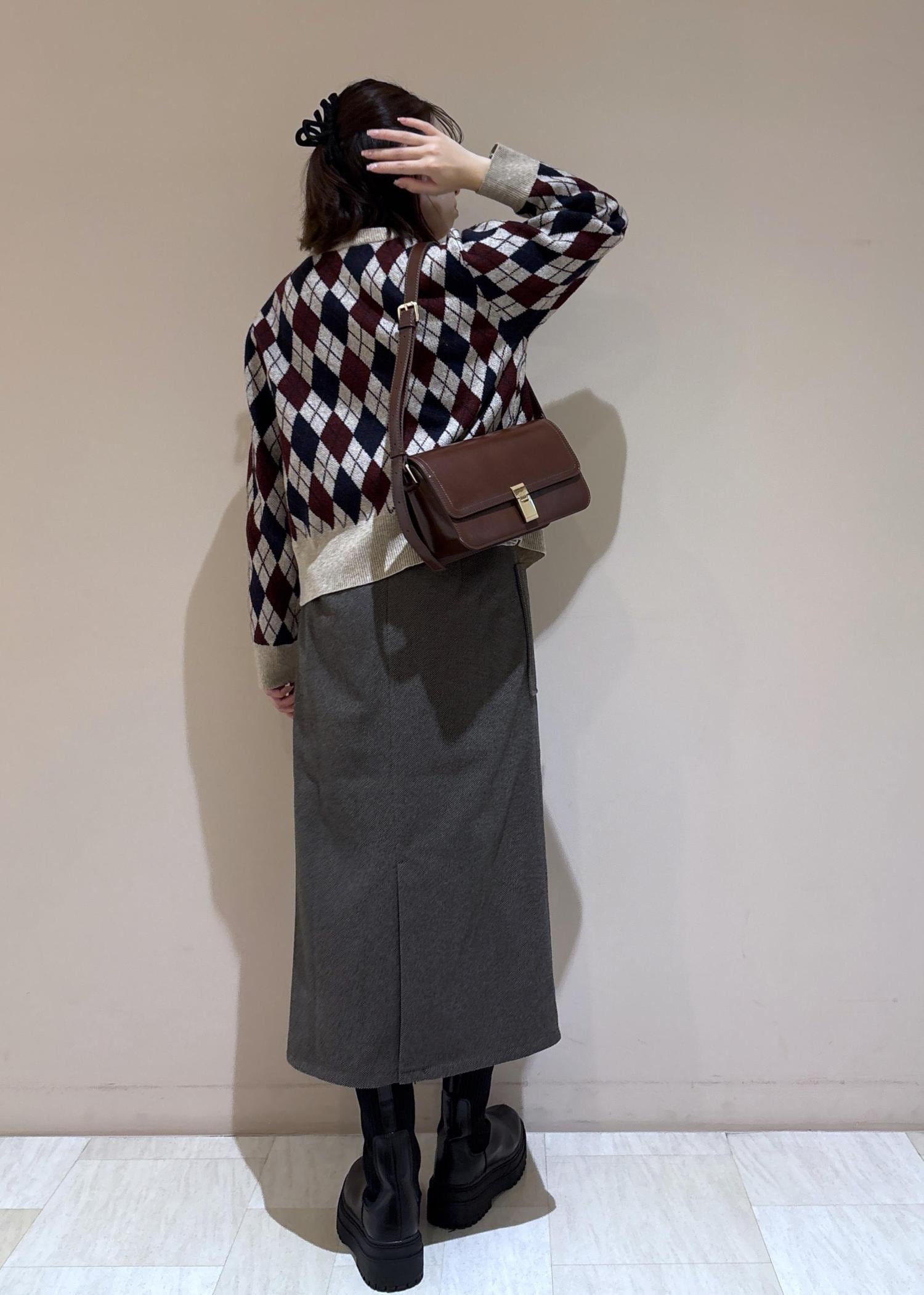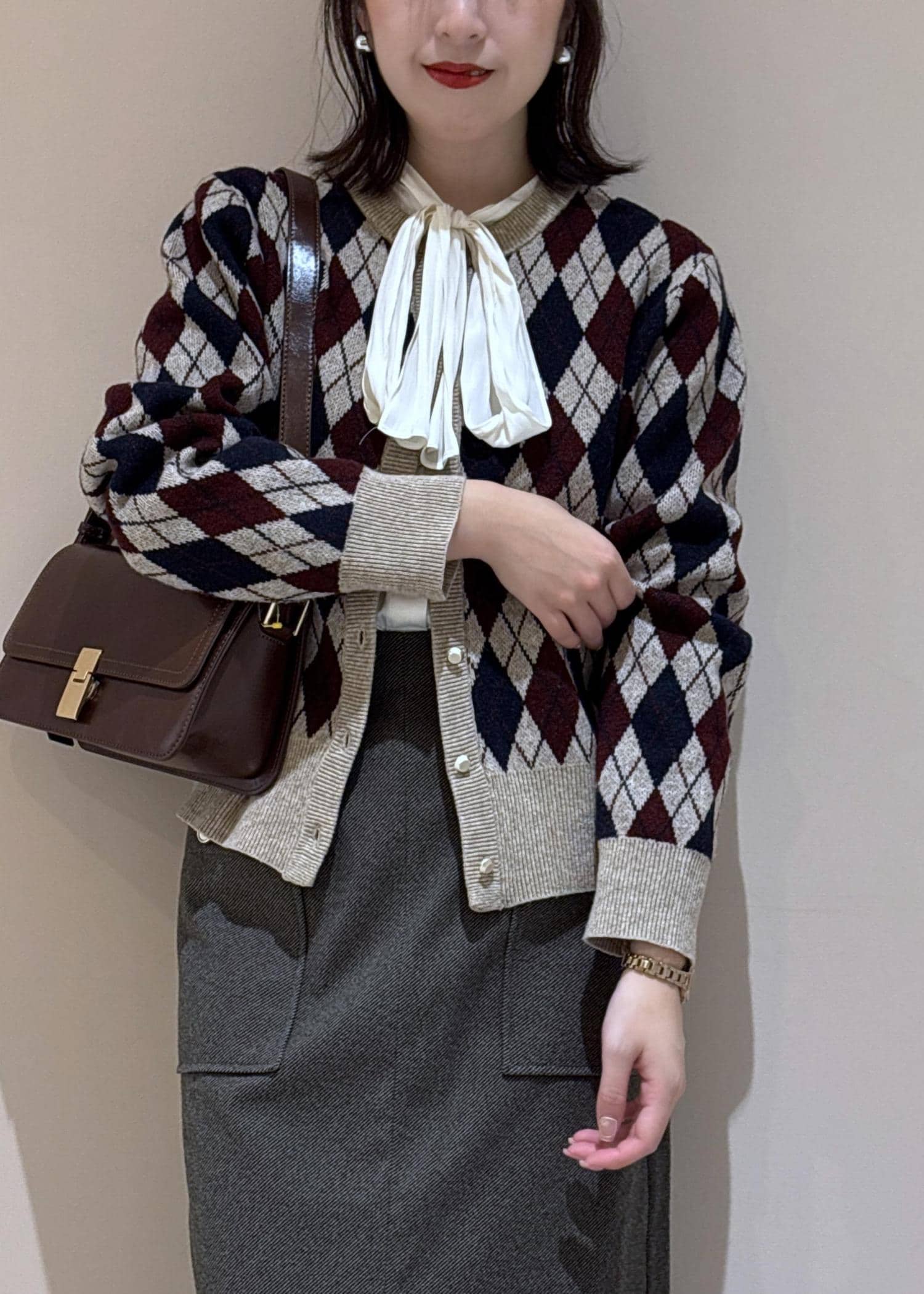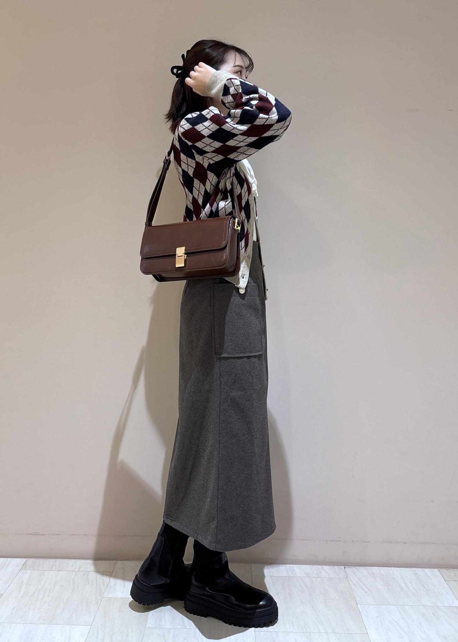 カーディガンの柄の色と合わせてバッグもワイン系にしました。