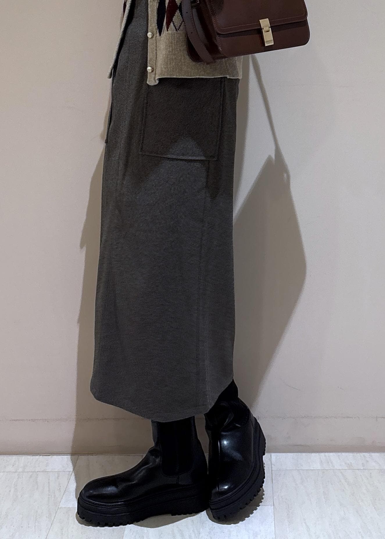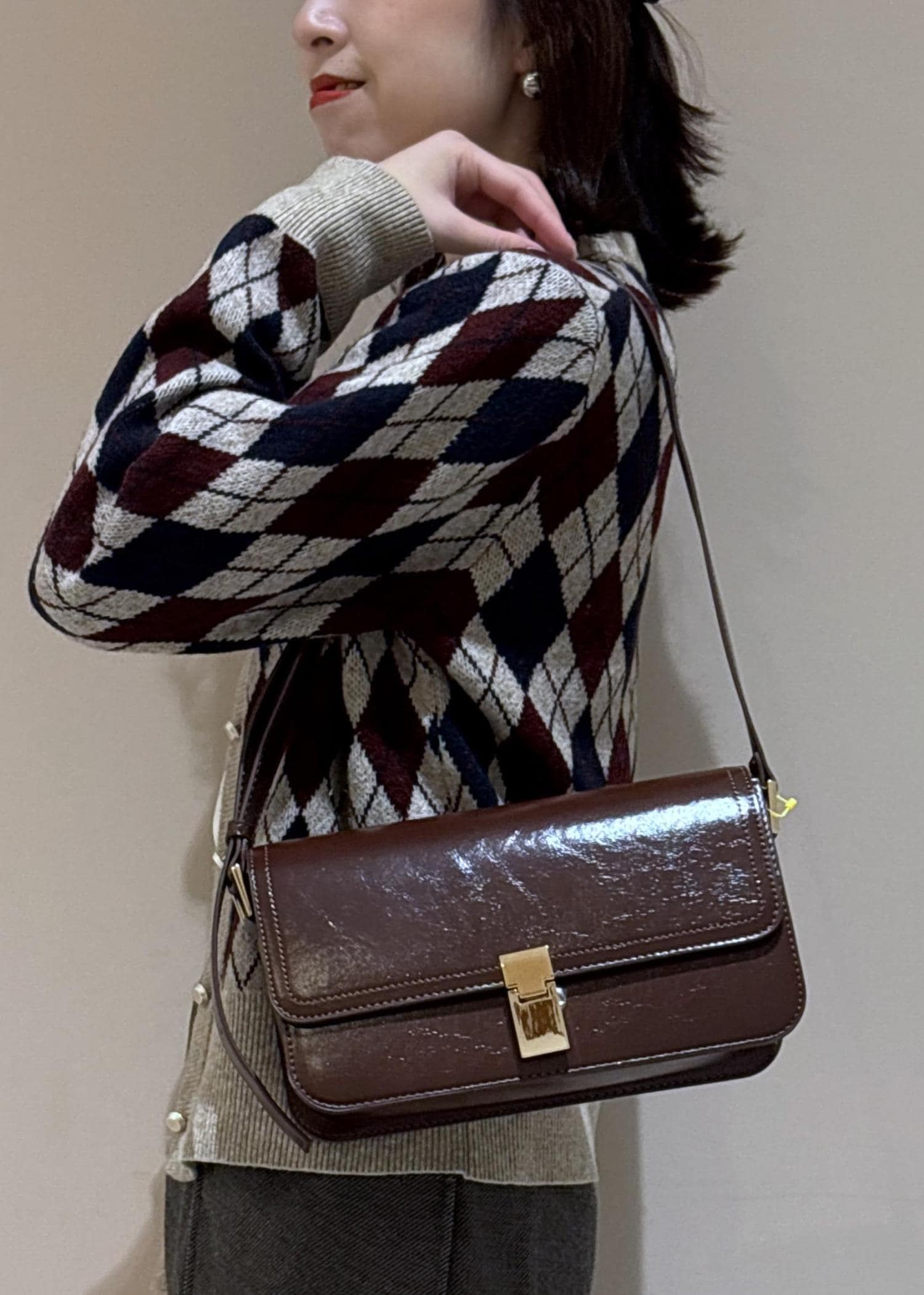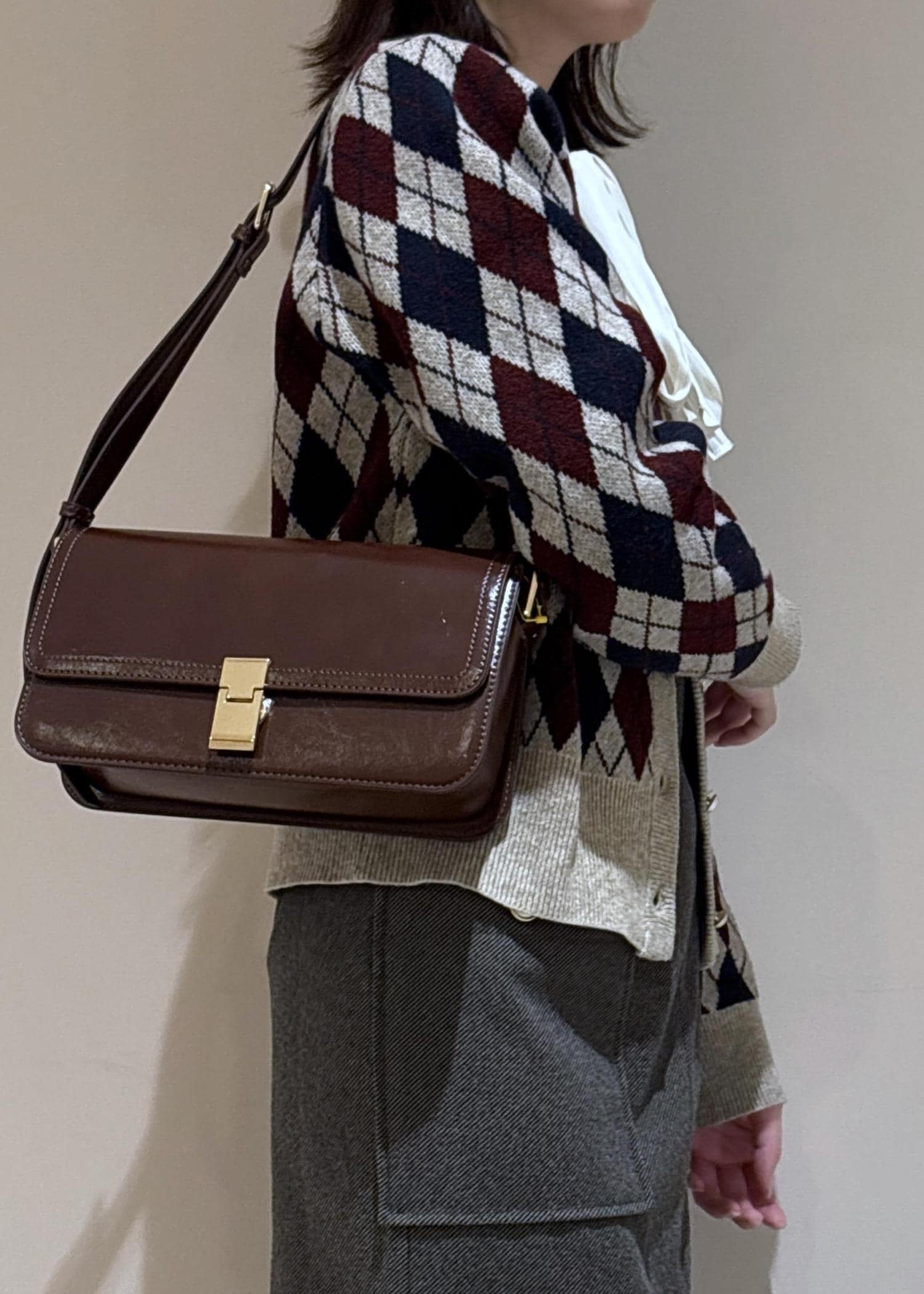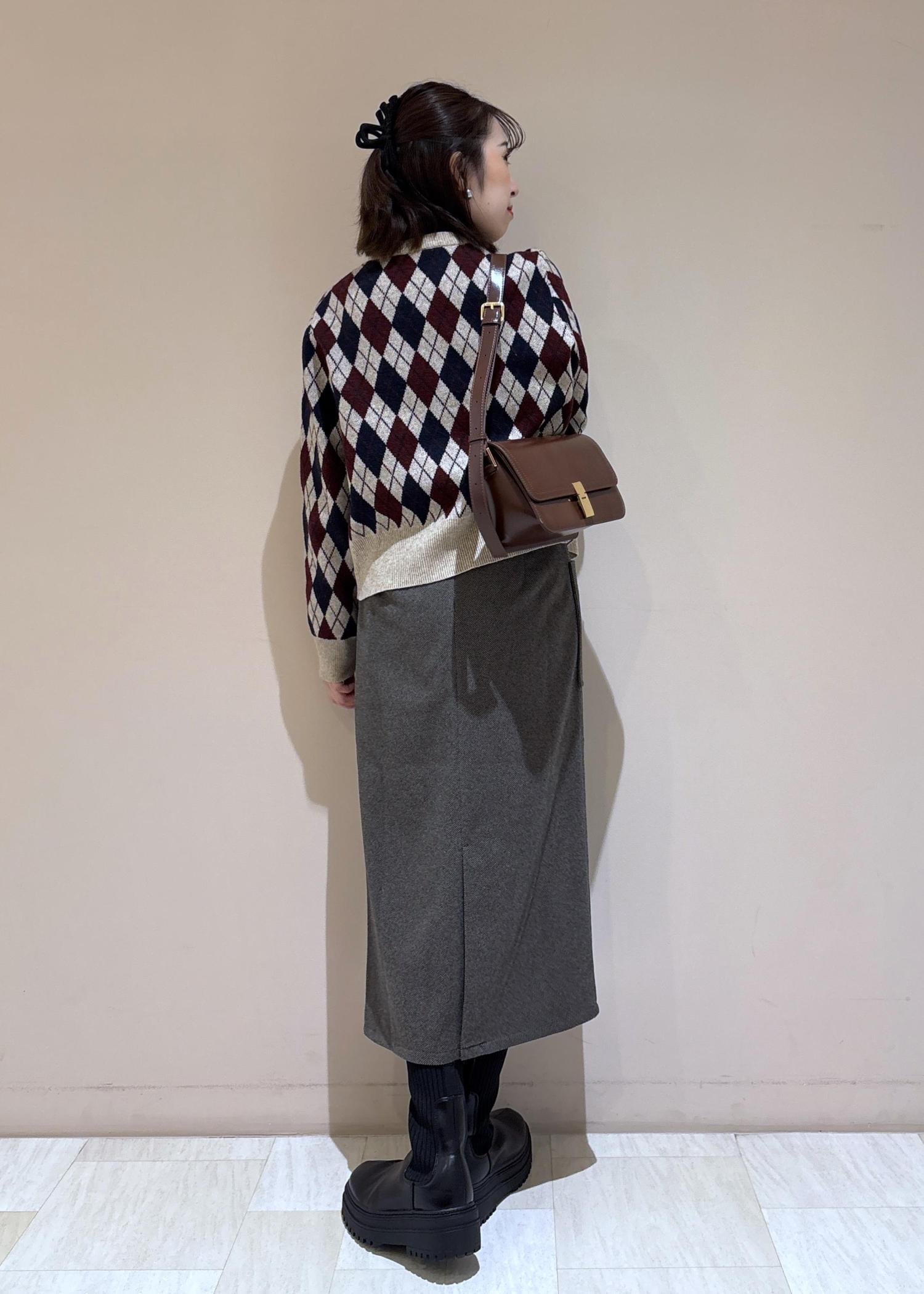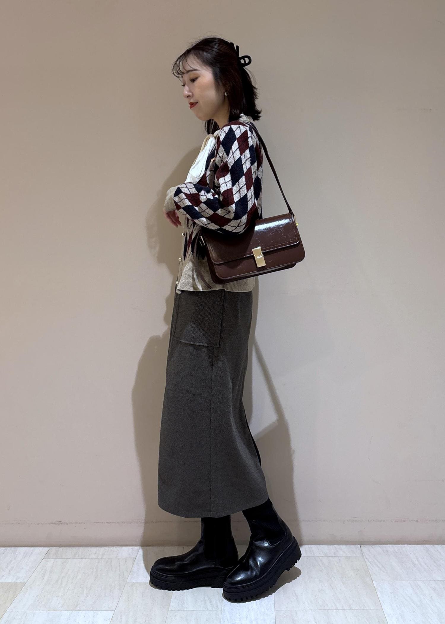カーディガンの柄の色と合わせてバッグもワイン系にしました。