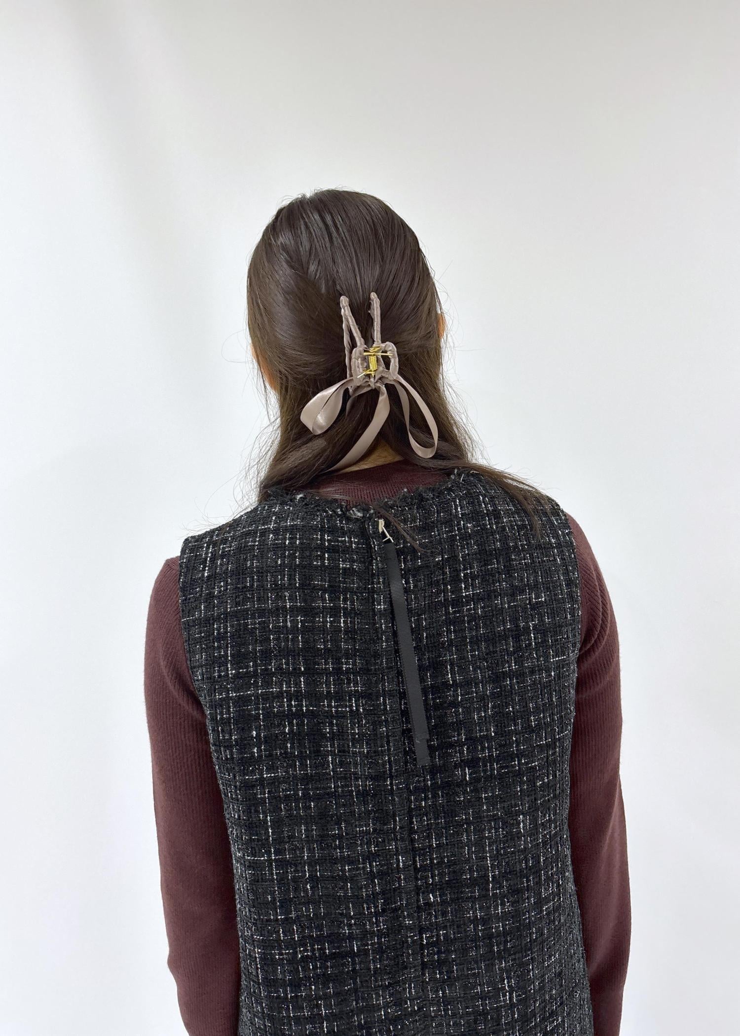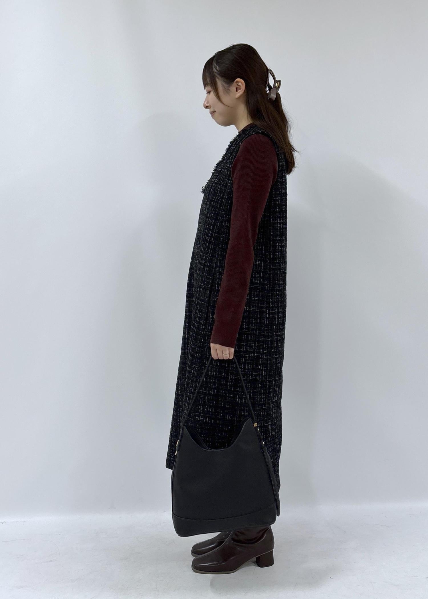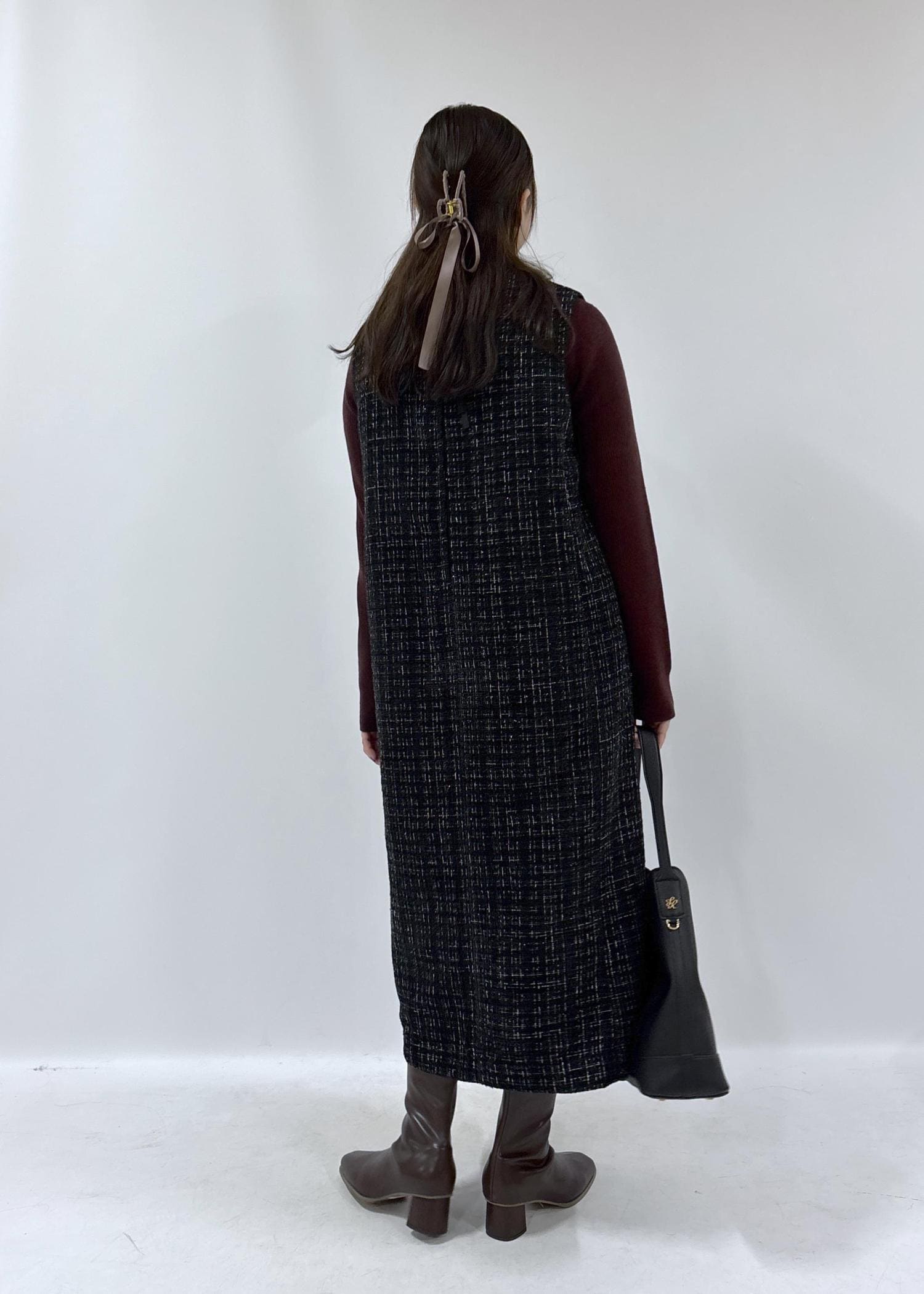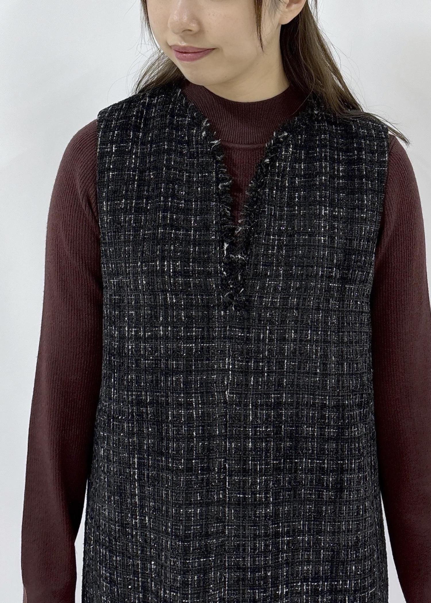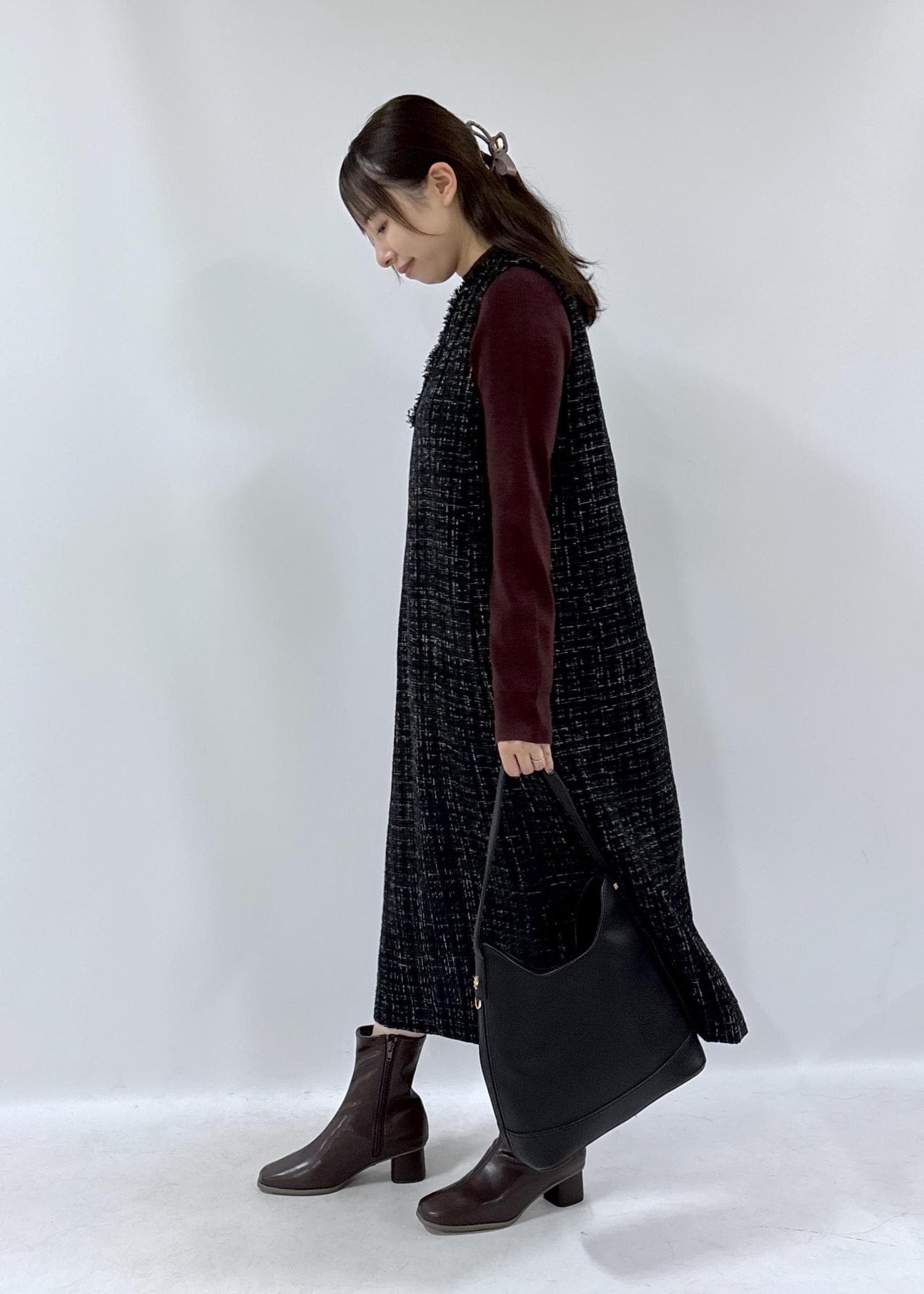 ROPÉ PICNICキーネックツイードジャンパースカート ワンピース/着丈が選べるブラック / MT¥7,198レビュー生地のラメ感がとても可愛いアイテムで、着膨れしないぐらいに厚みもあります。MTでも長過ぎないので、低身長さんにもオススメなアイテムです。襟元のキーネックが大人っぽく、スッキリした印象に◎
