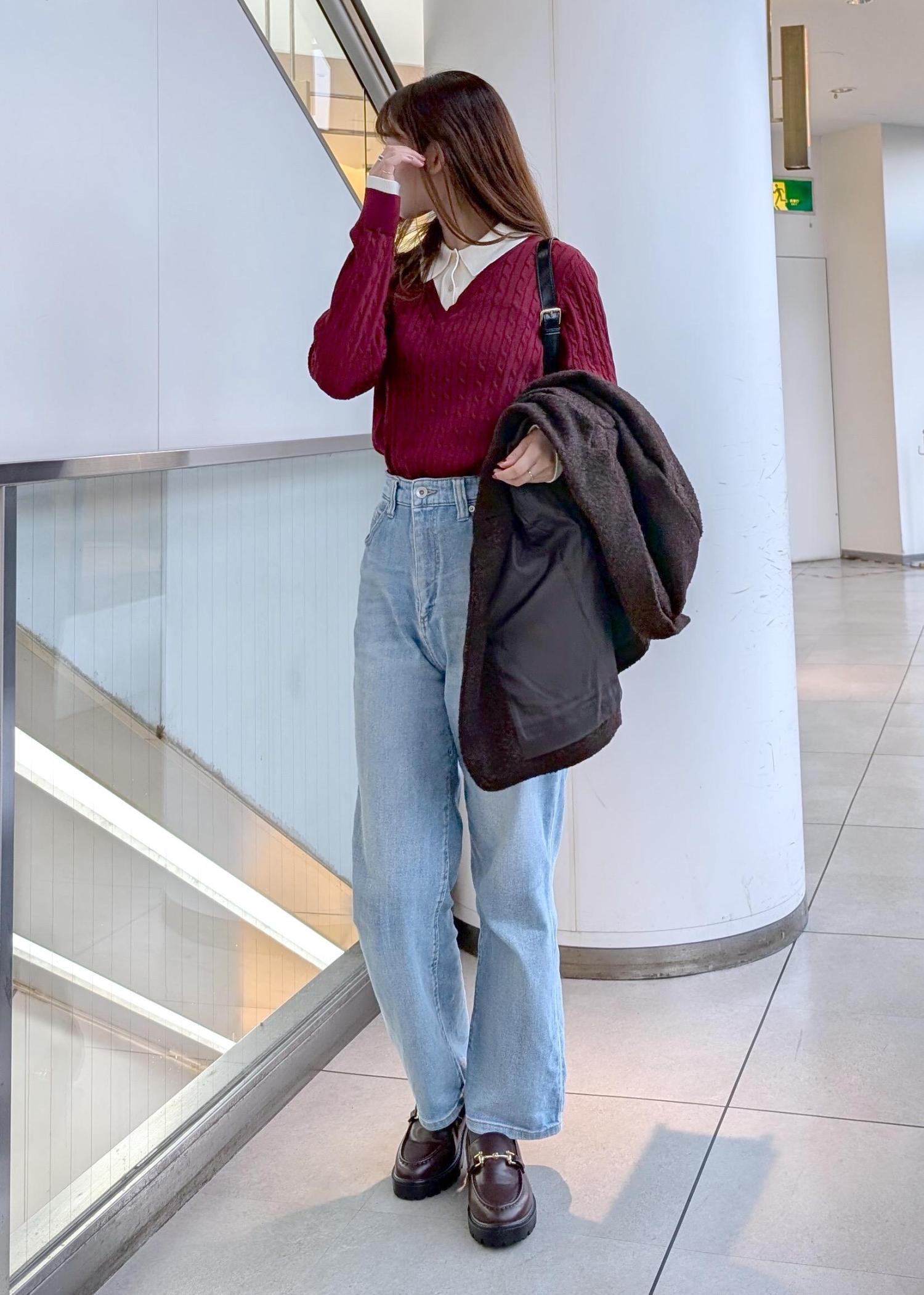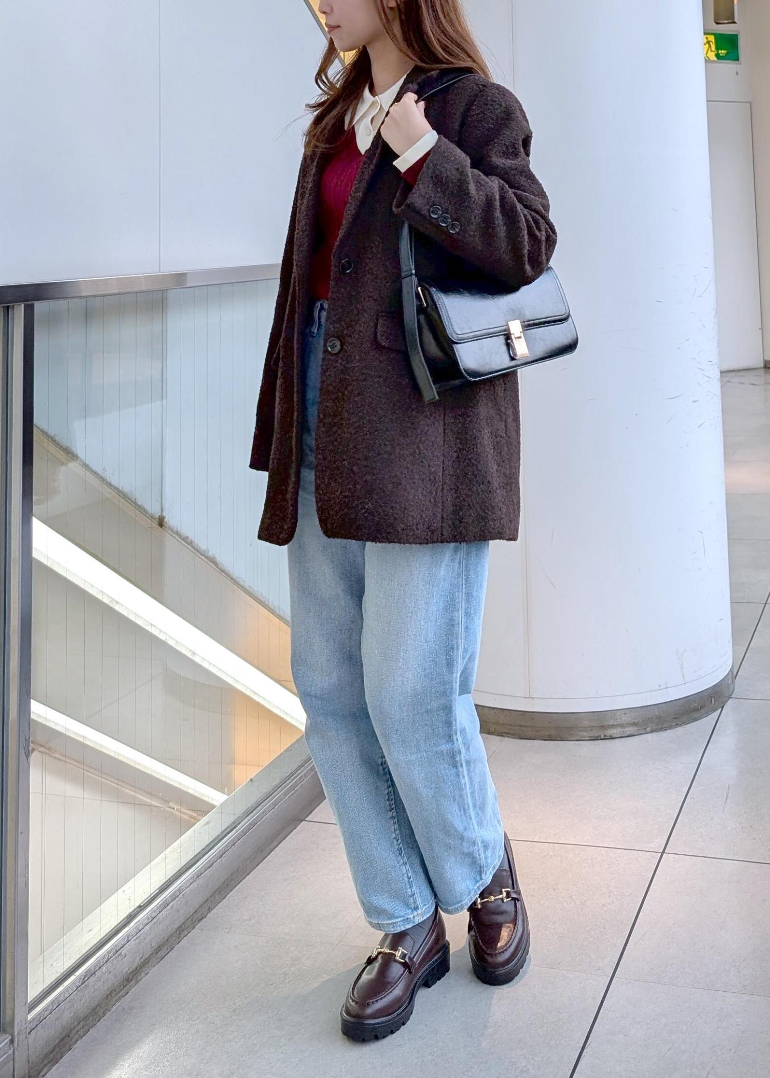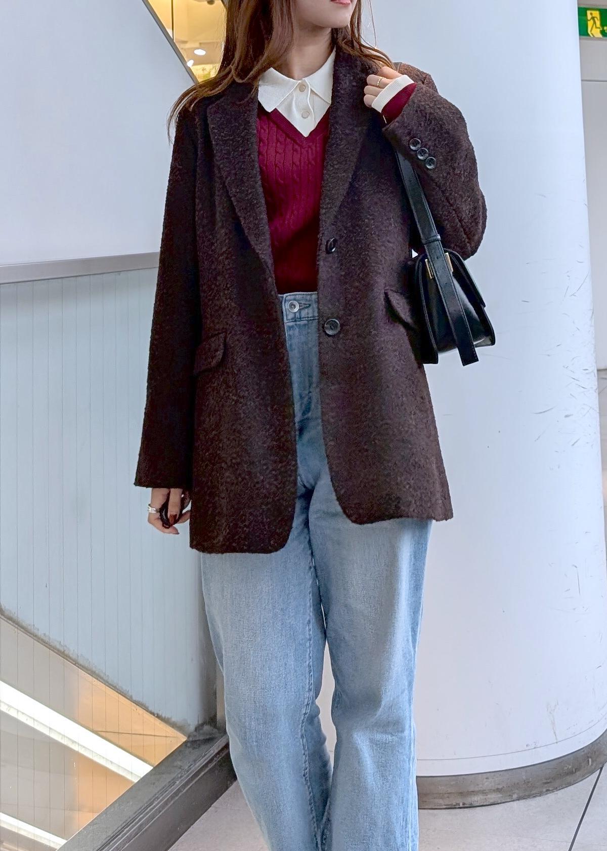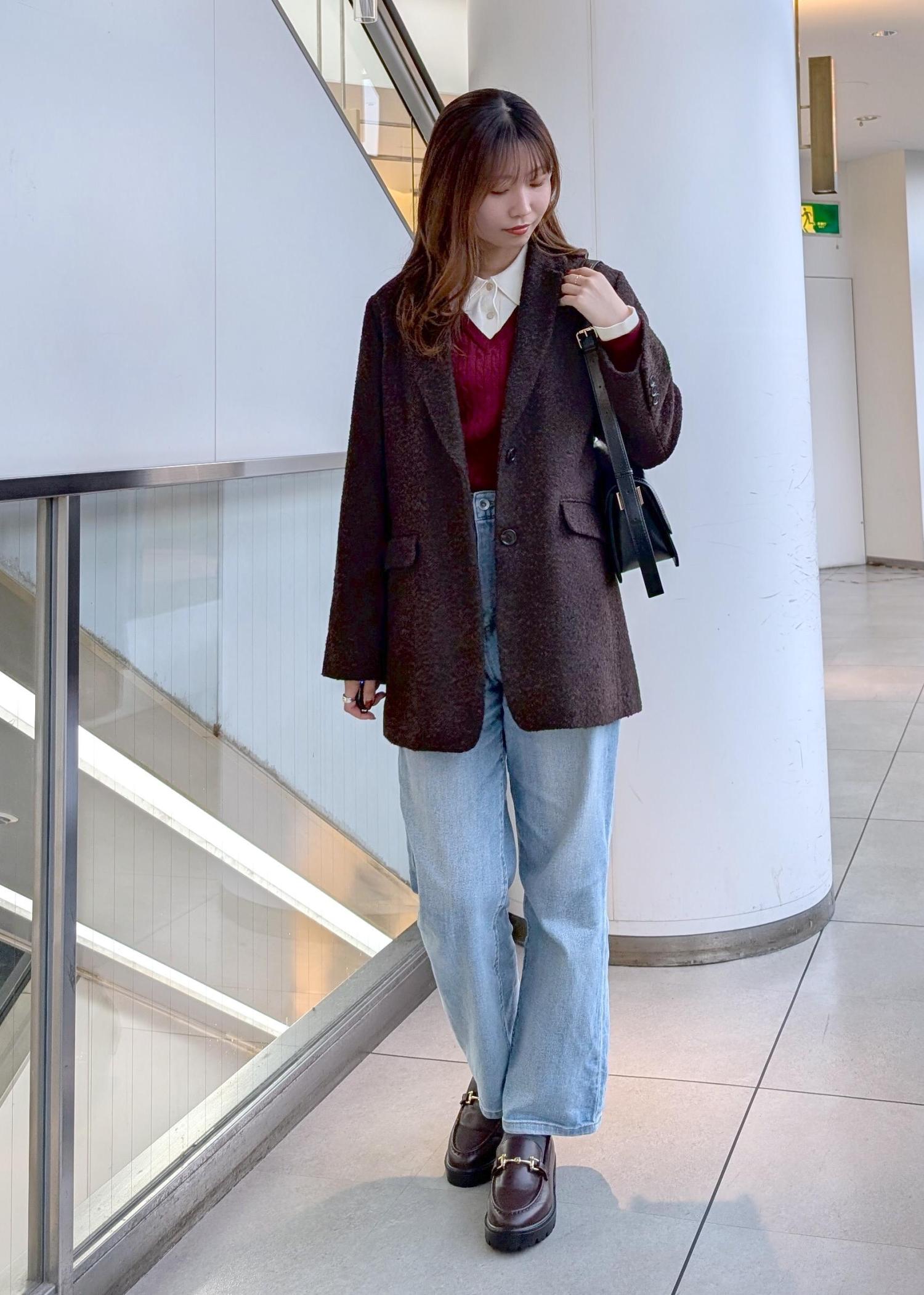 レイヤード風のニットを使ったシンプルなのに華やかなスタイル。綿100%のため敏感肌さんにもおすすめなトップスです。ジャケット×アウターなジャコットはゆとりのあるサイズ感のためニットの上からでも羽織りやすいです!